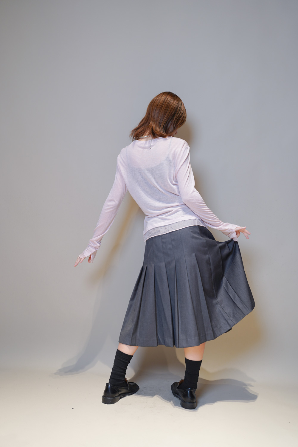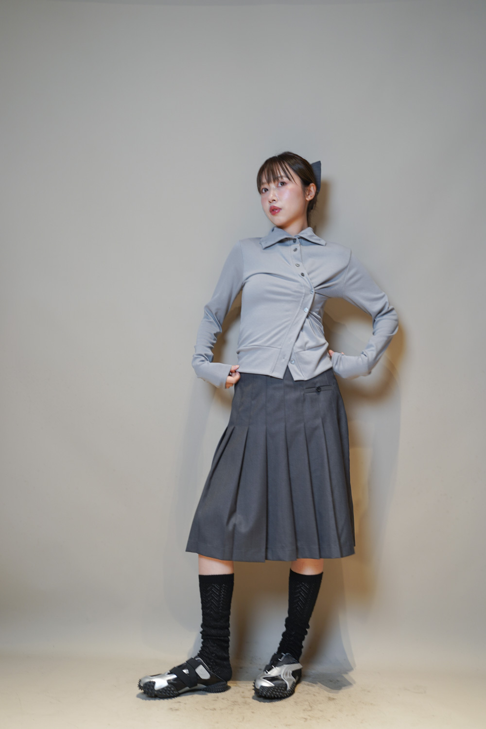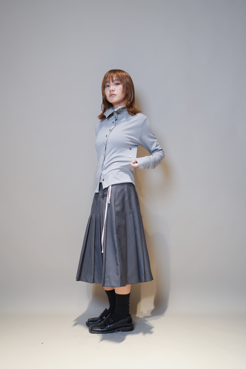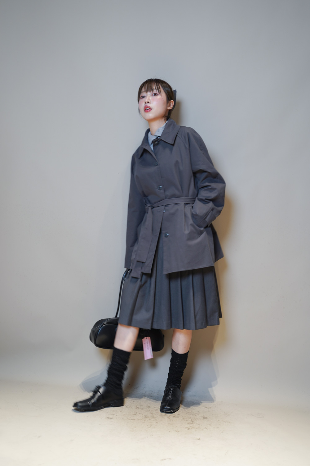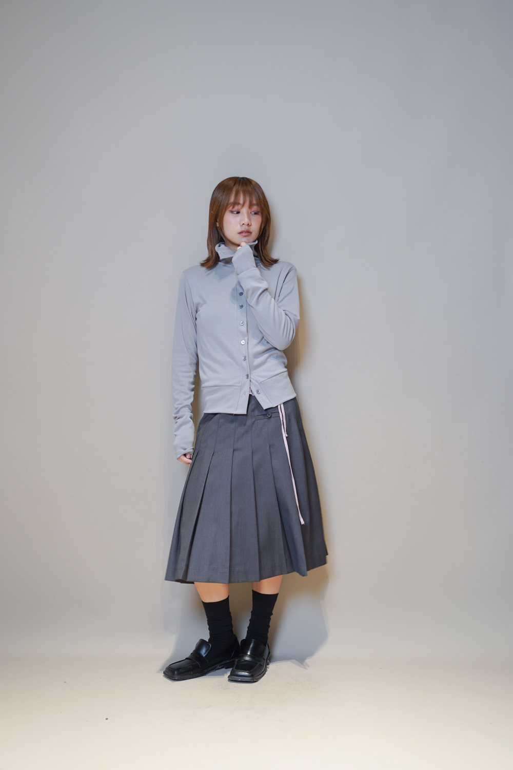 Love~Mid length pleated pocket skirt (GREY/BLACK)-S/M