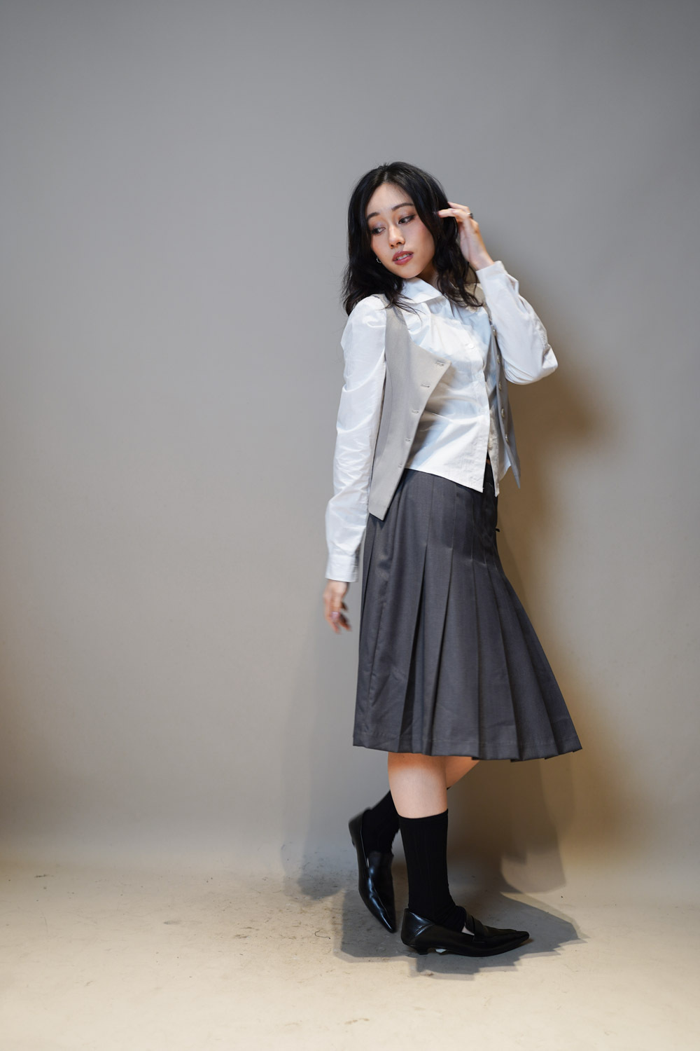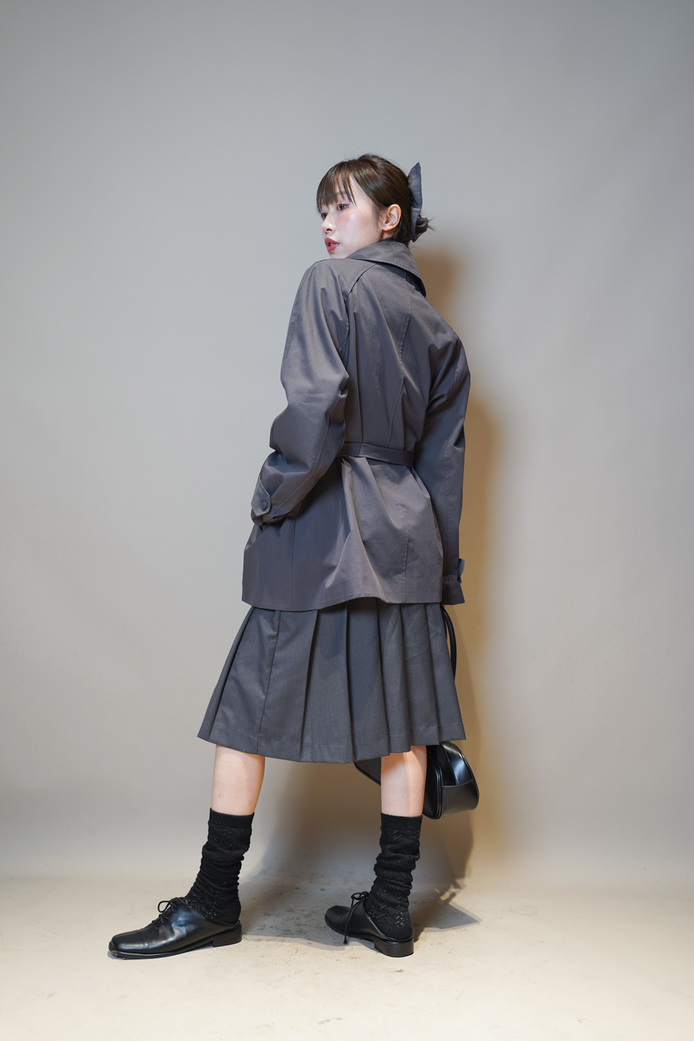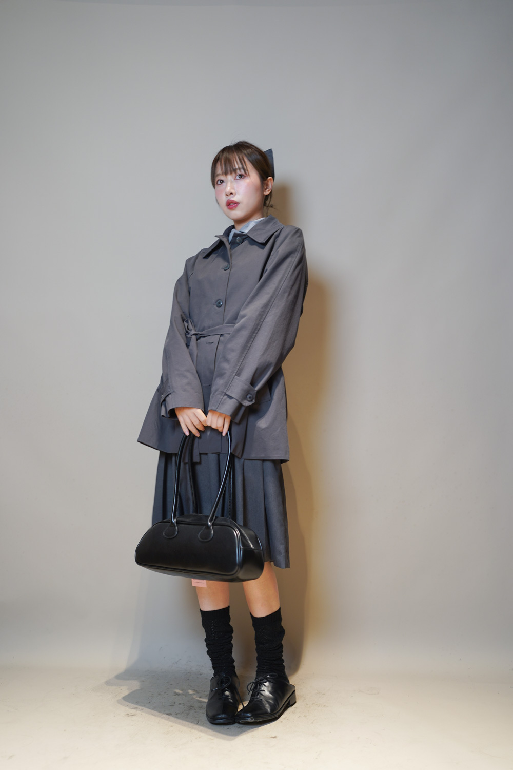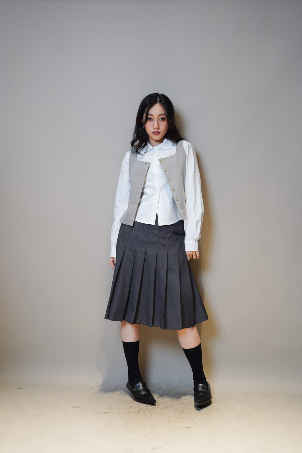 Love~Mid length pleated pocket skirt (GREY/BLACK)-S/M