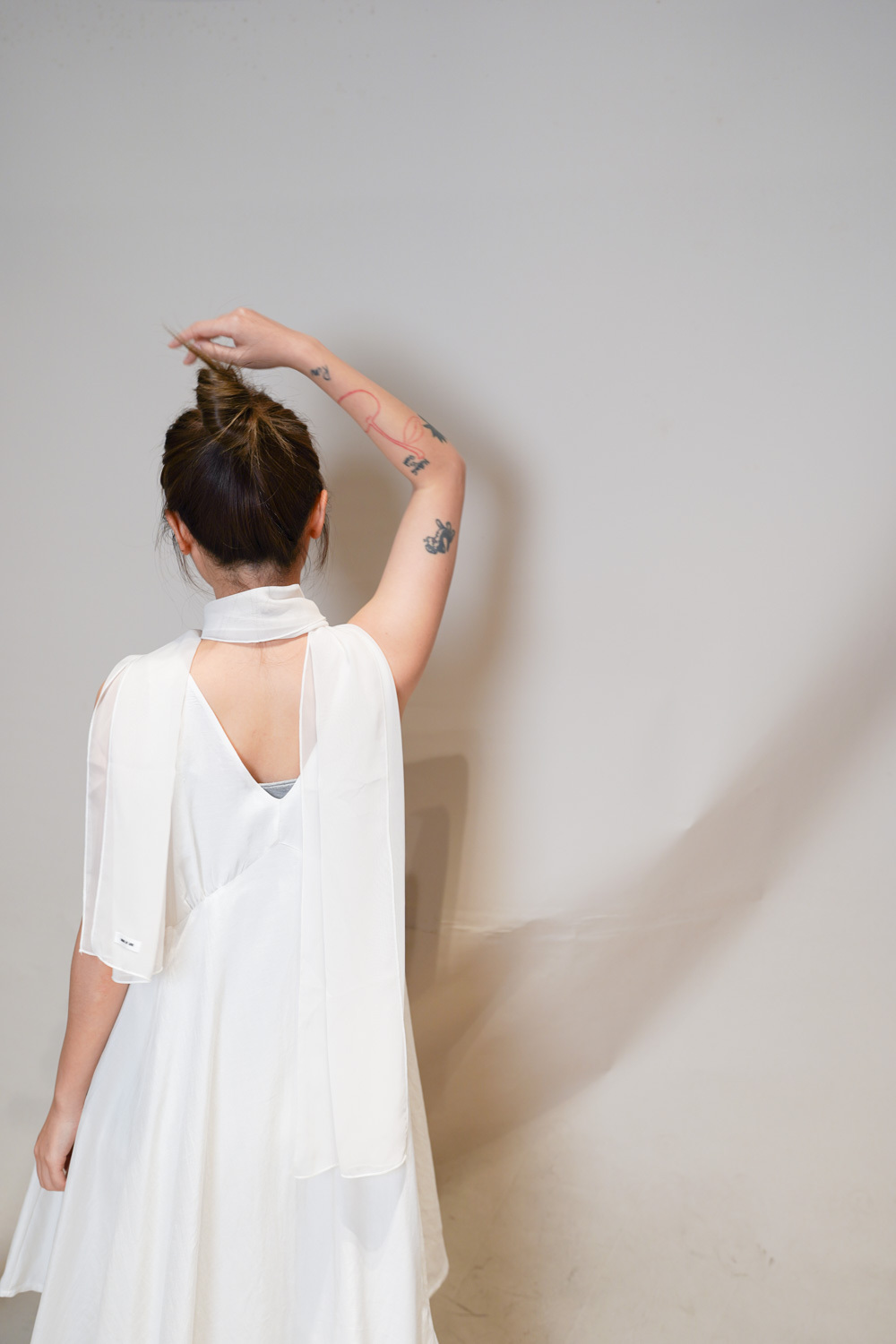 /可以隨性在後頸打結,讓長帶自然垂墜在背後,增加後背的視覺層次