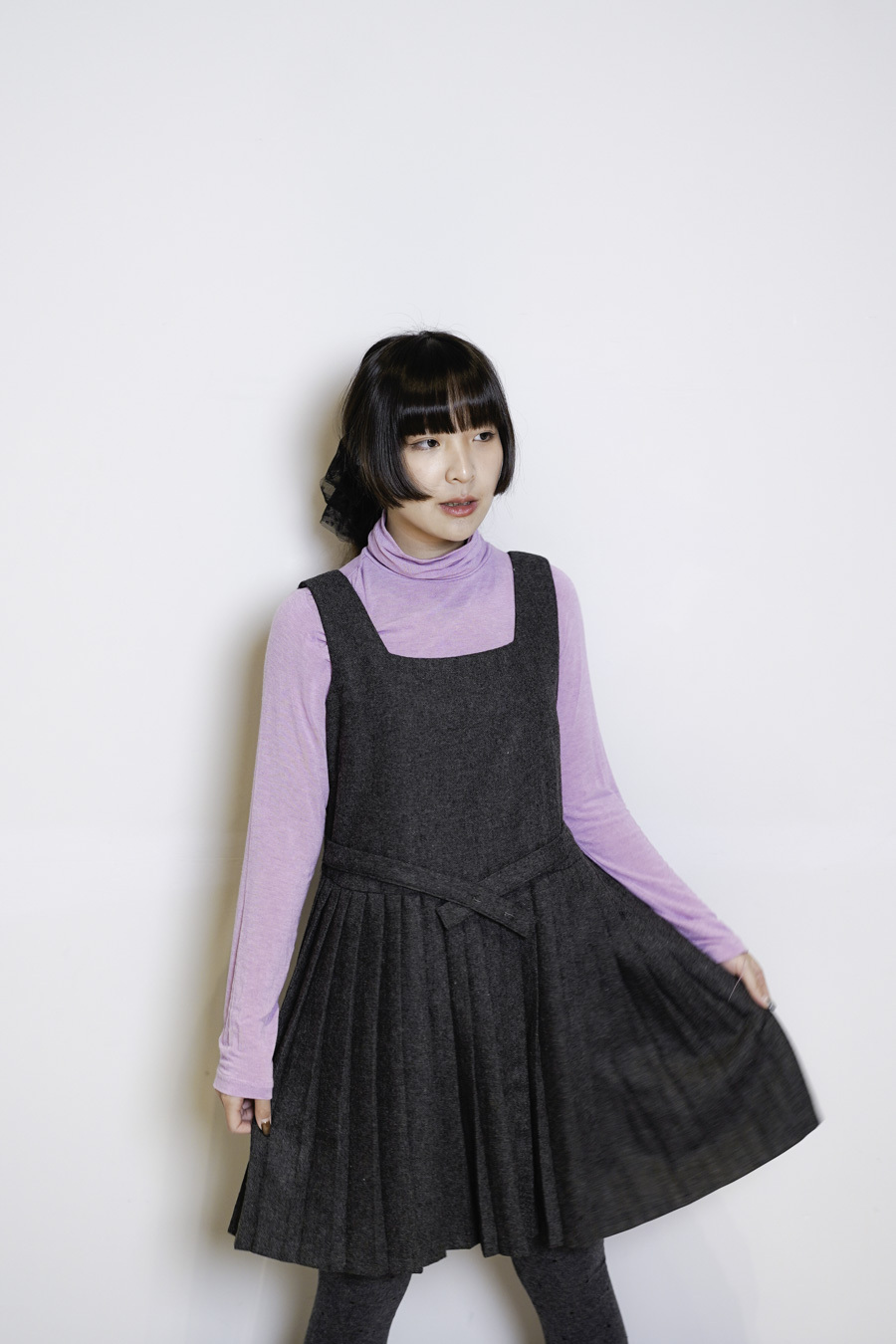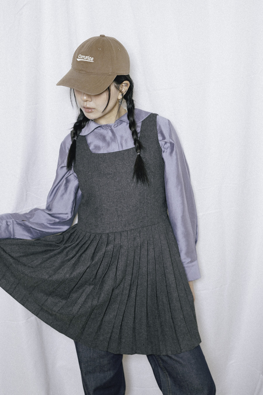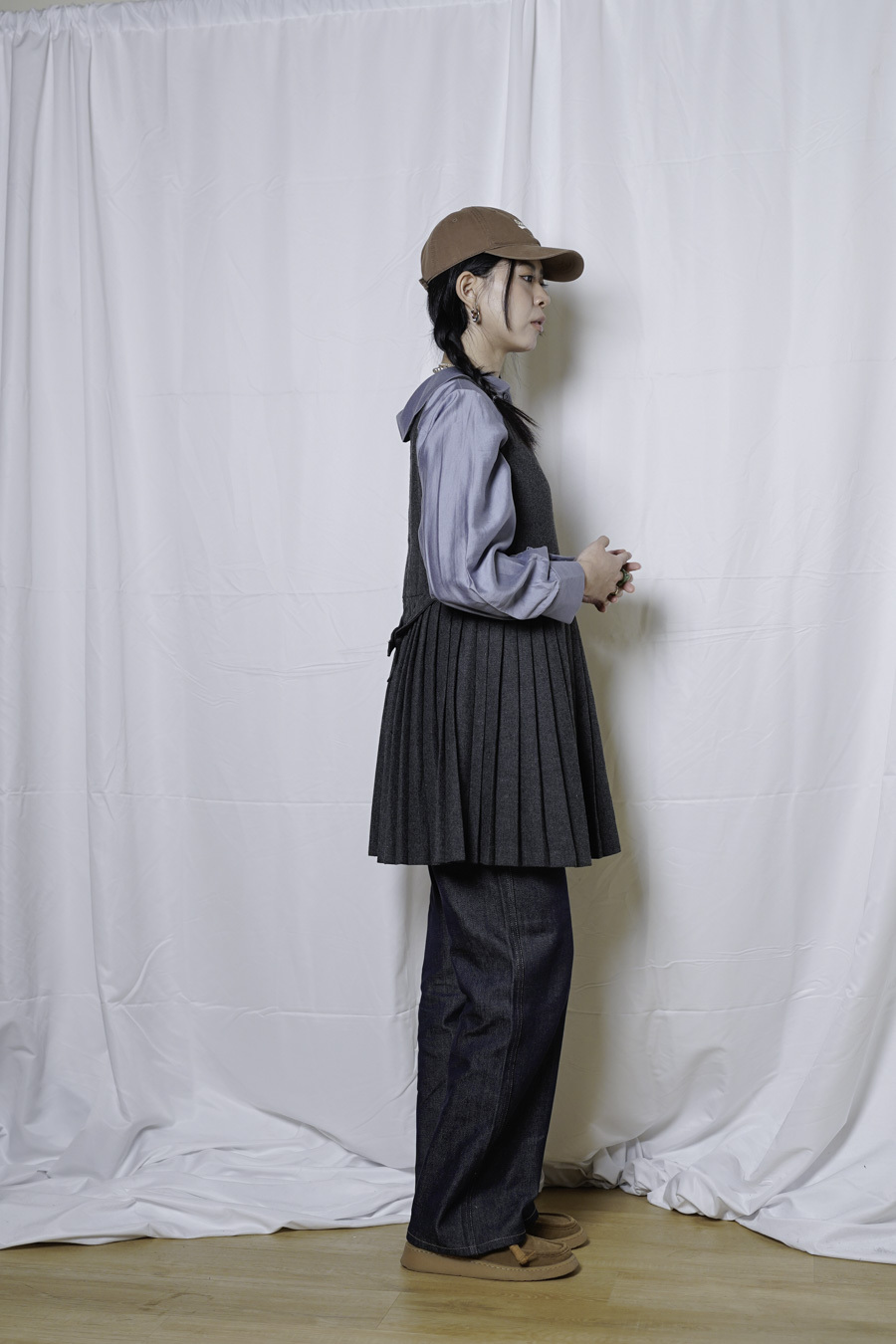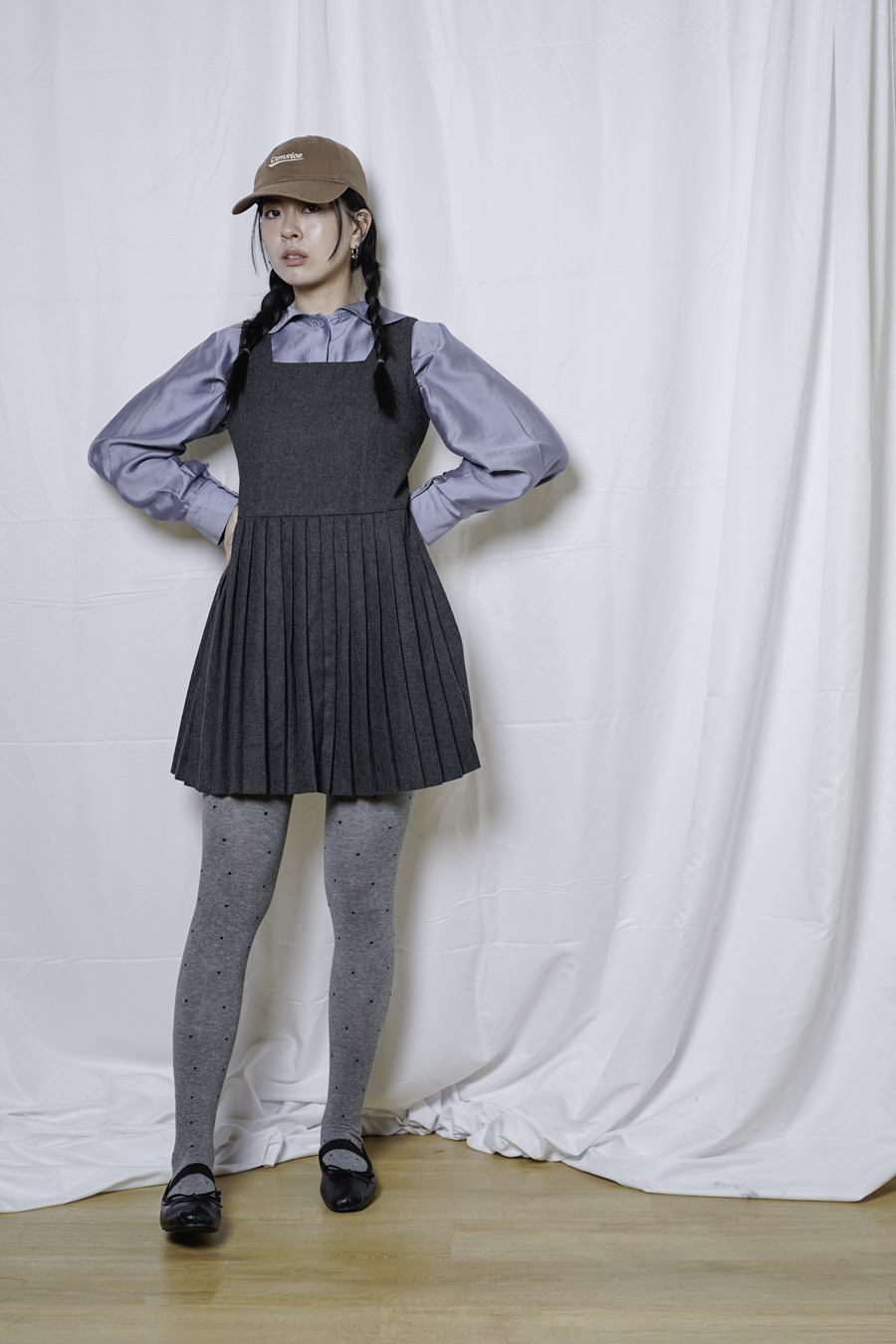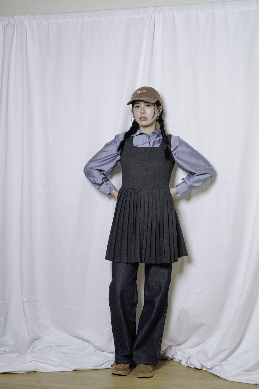 裙擺百摺設計/ 領口方形設計/顯露直角肩/