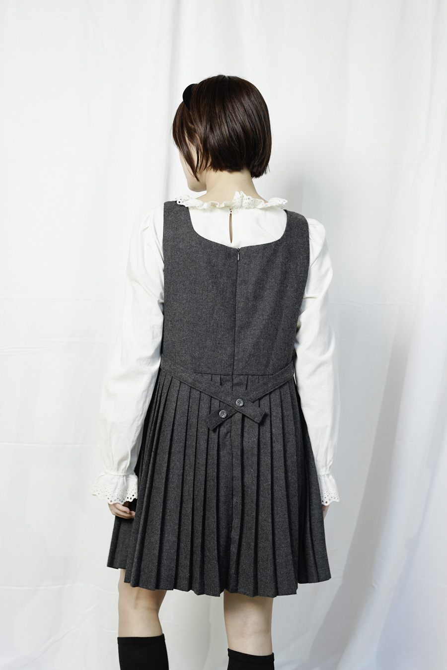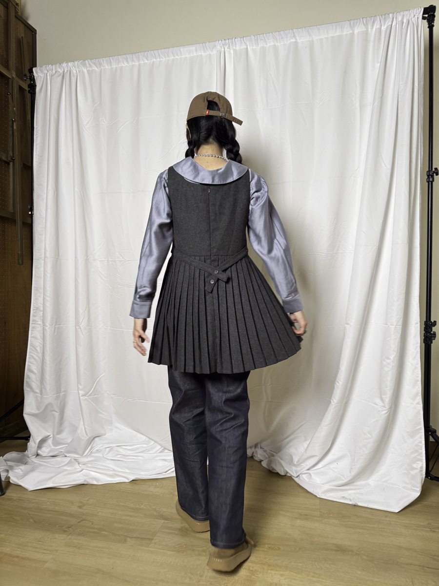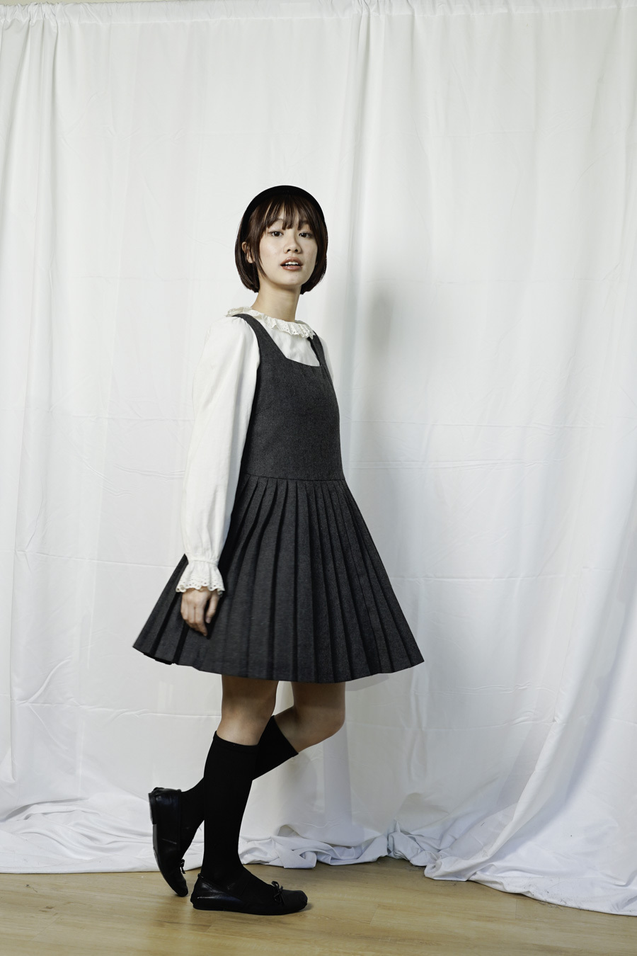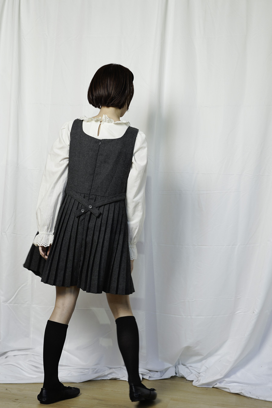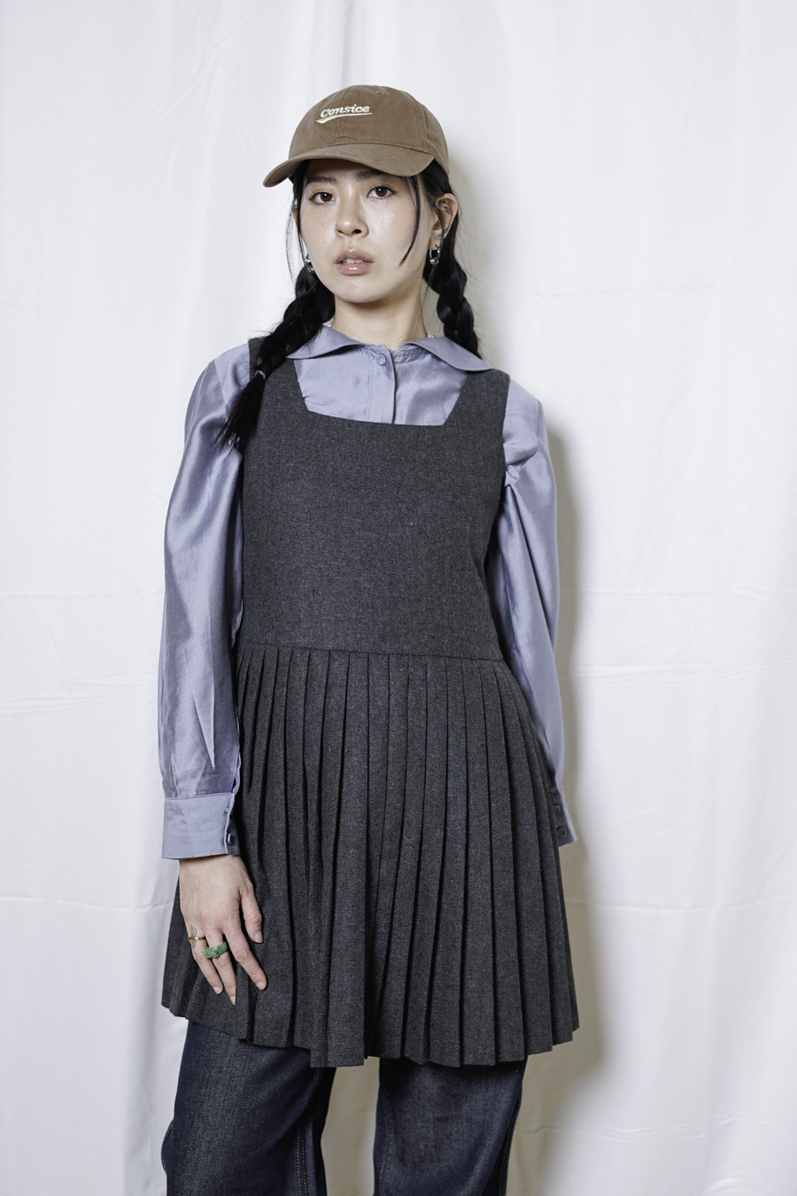 裙擺百摺設計/ 領口方形設計/顯露直角肩/