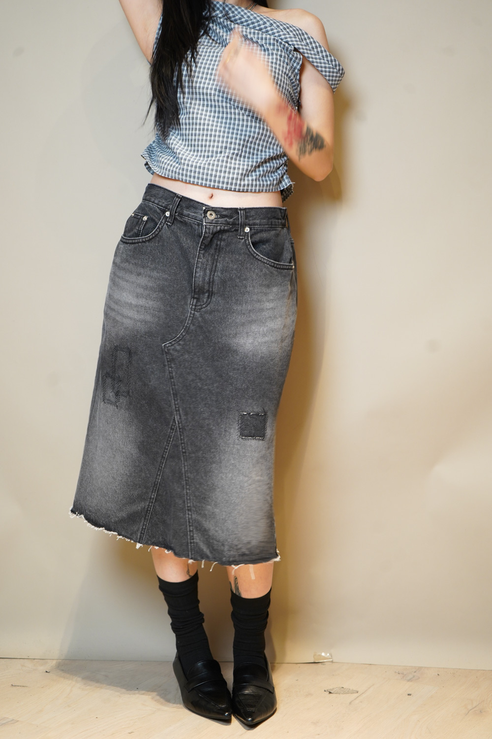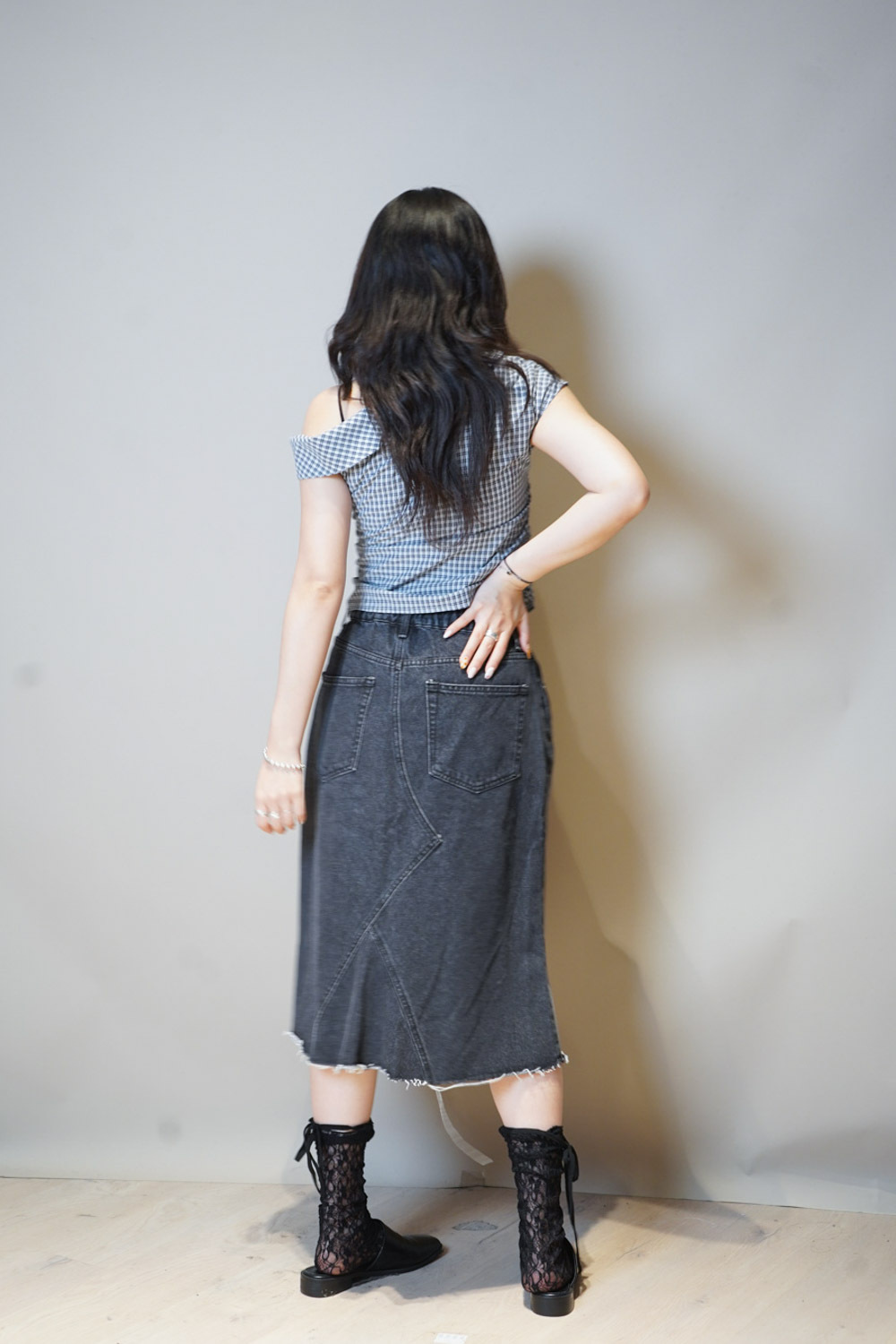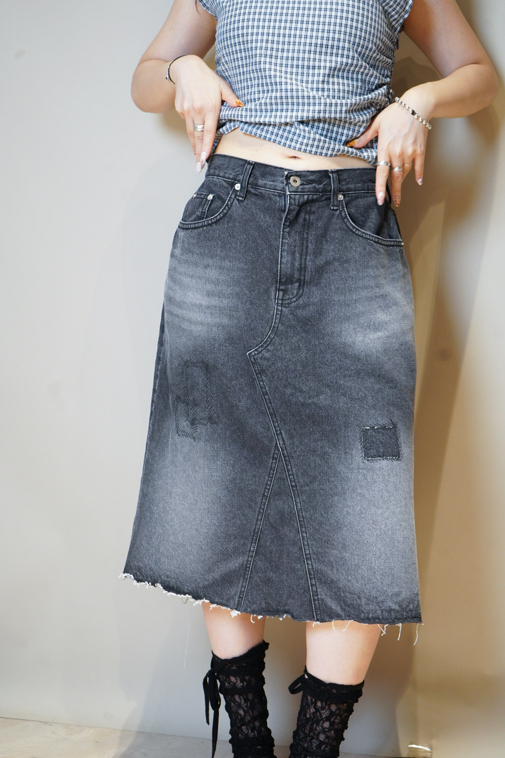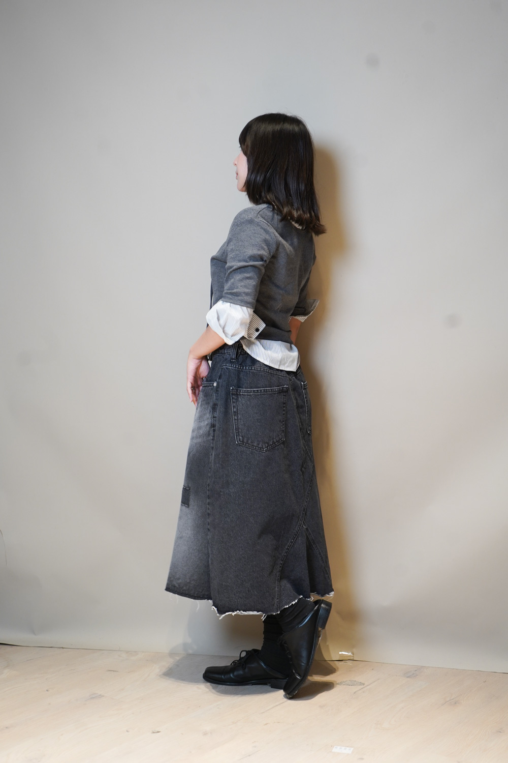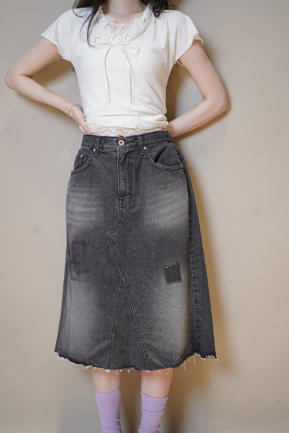 Mid-length Patchwork denim skirt (BLUE/BLACK) - Free size