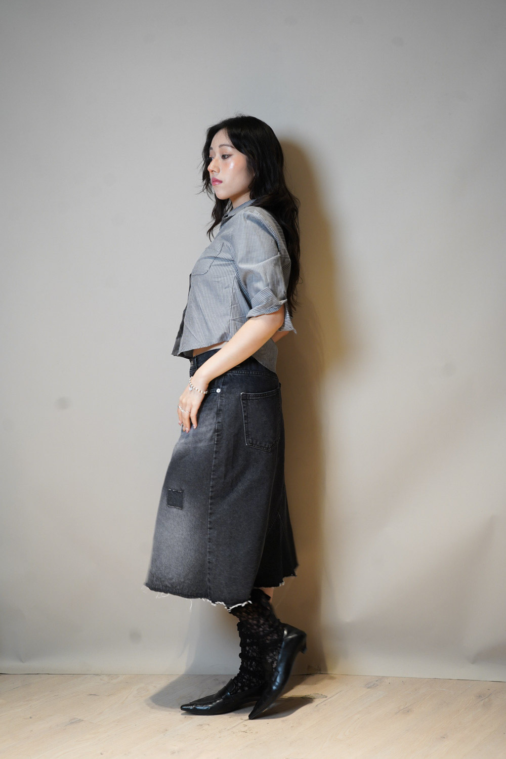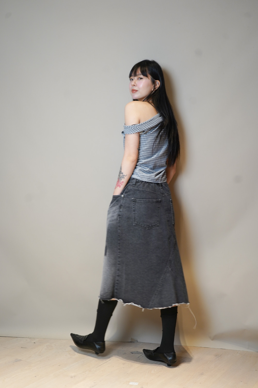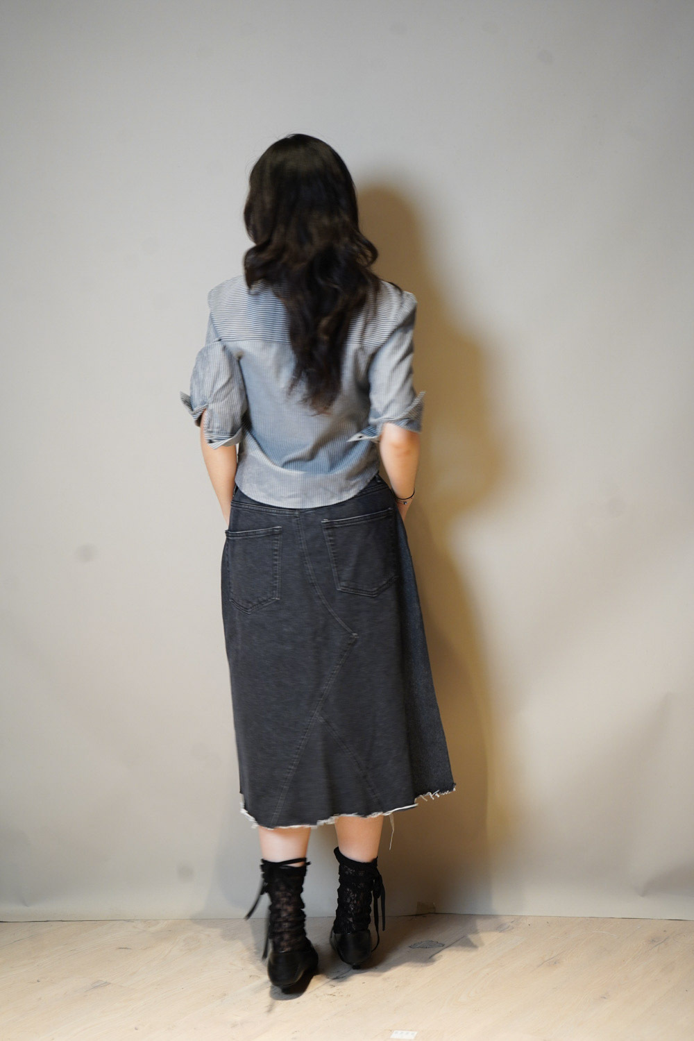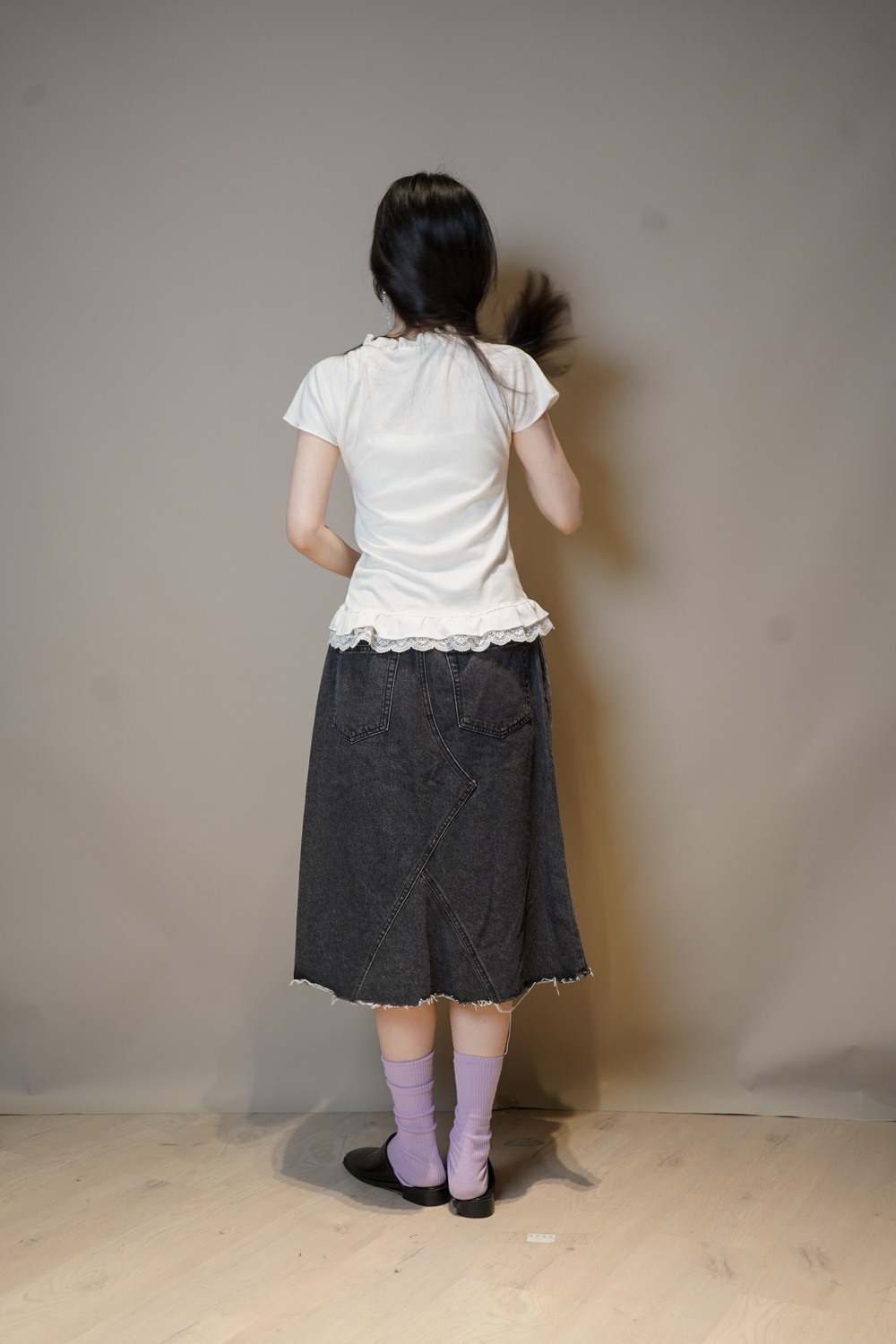 Mid-length Patchwork denim skirt (BLUE/BLACK) - Free size