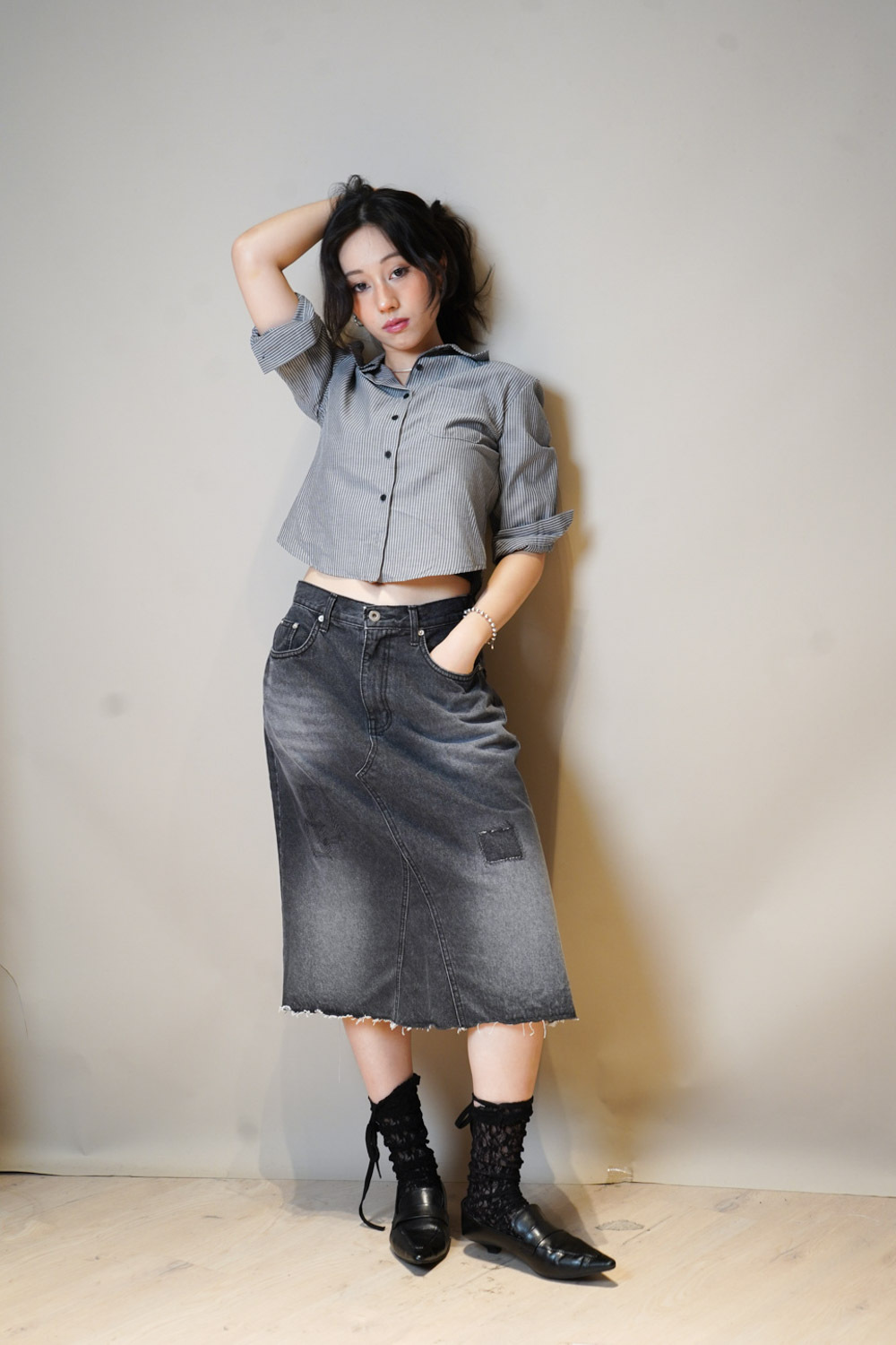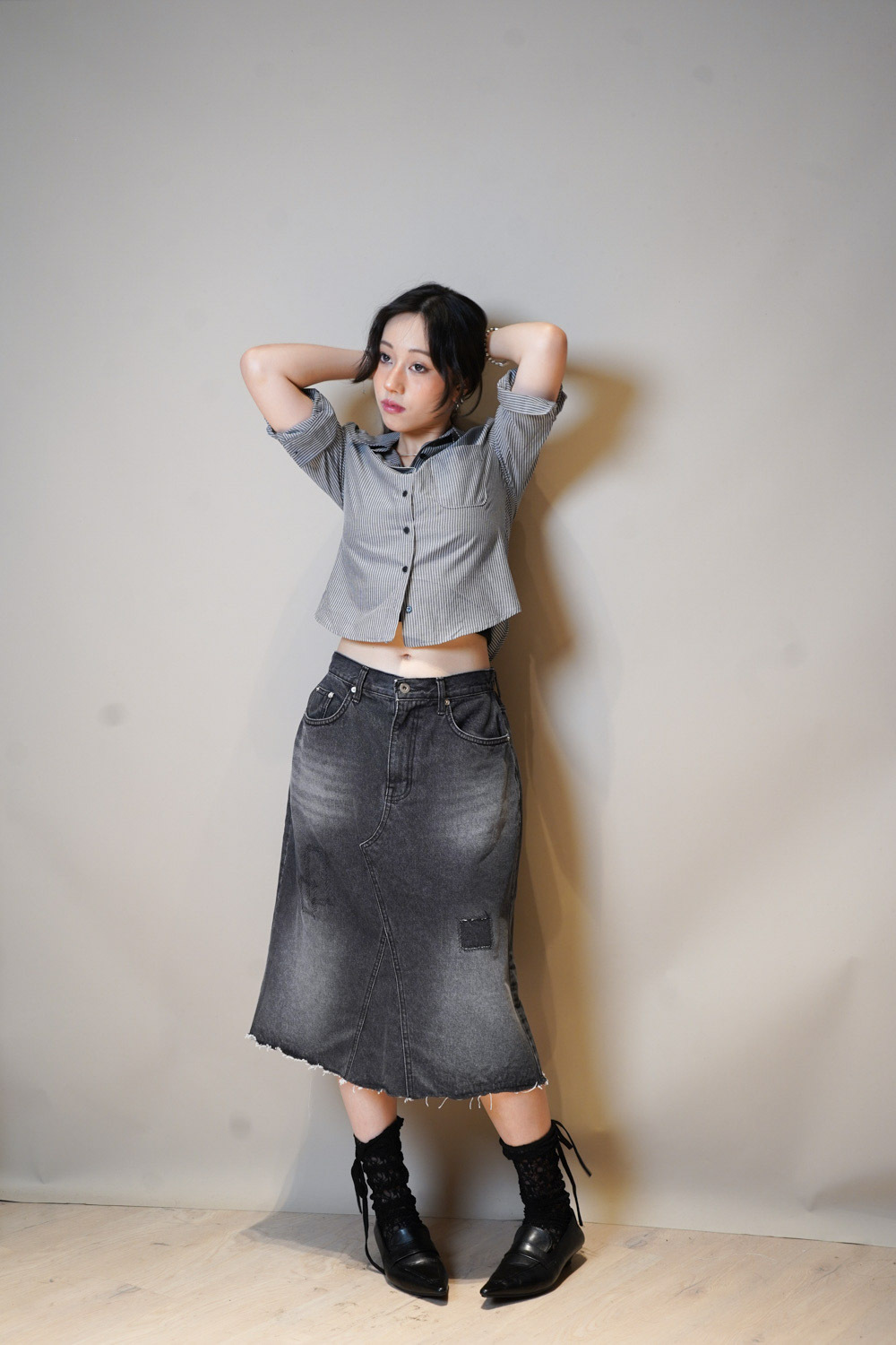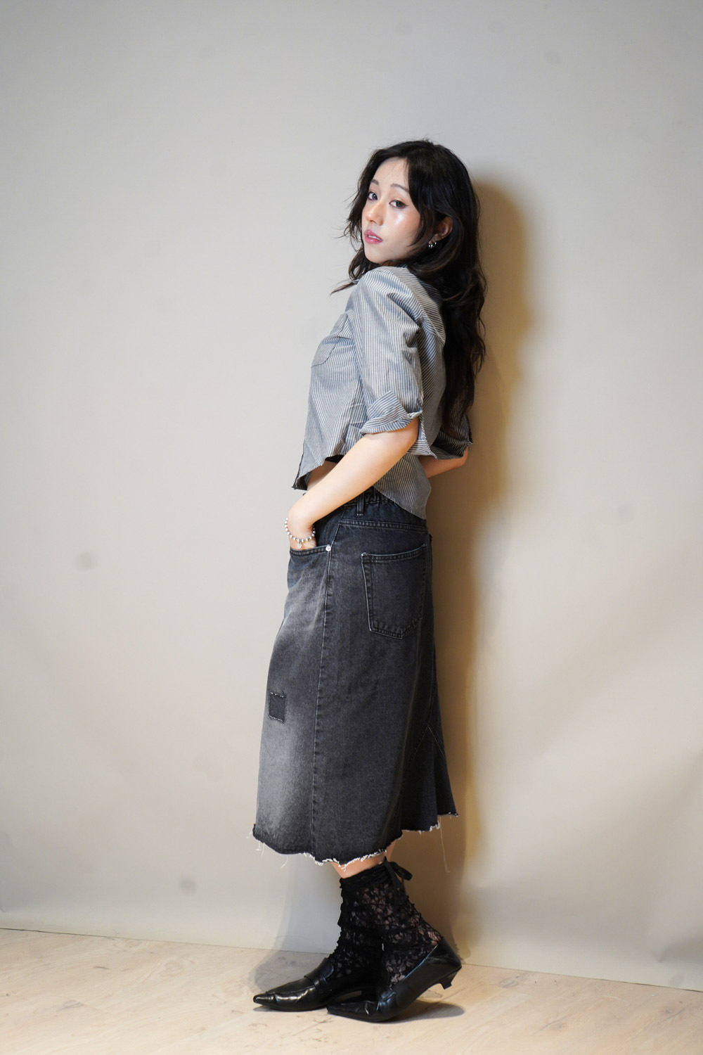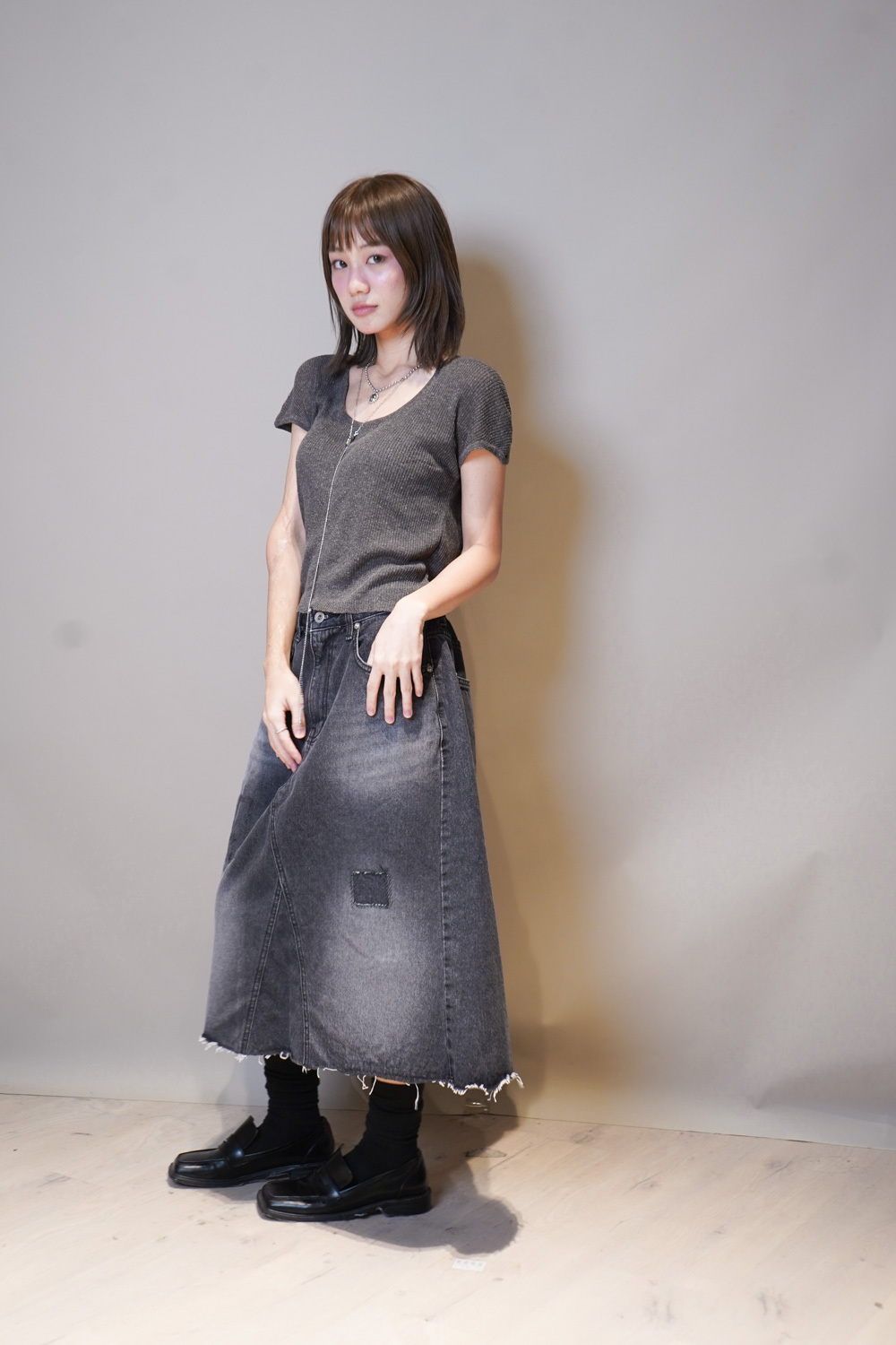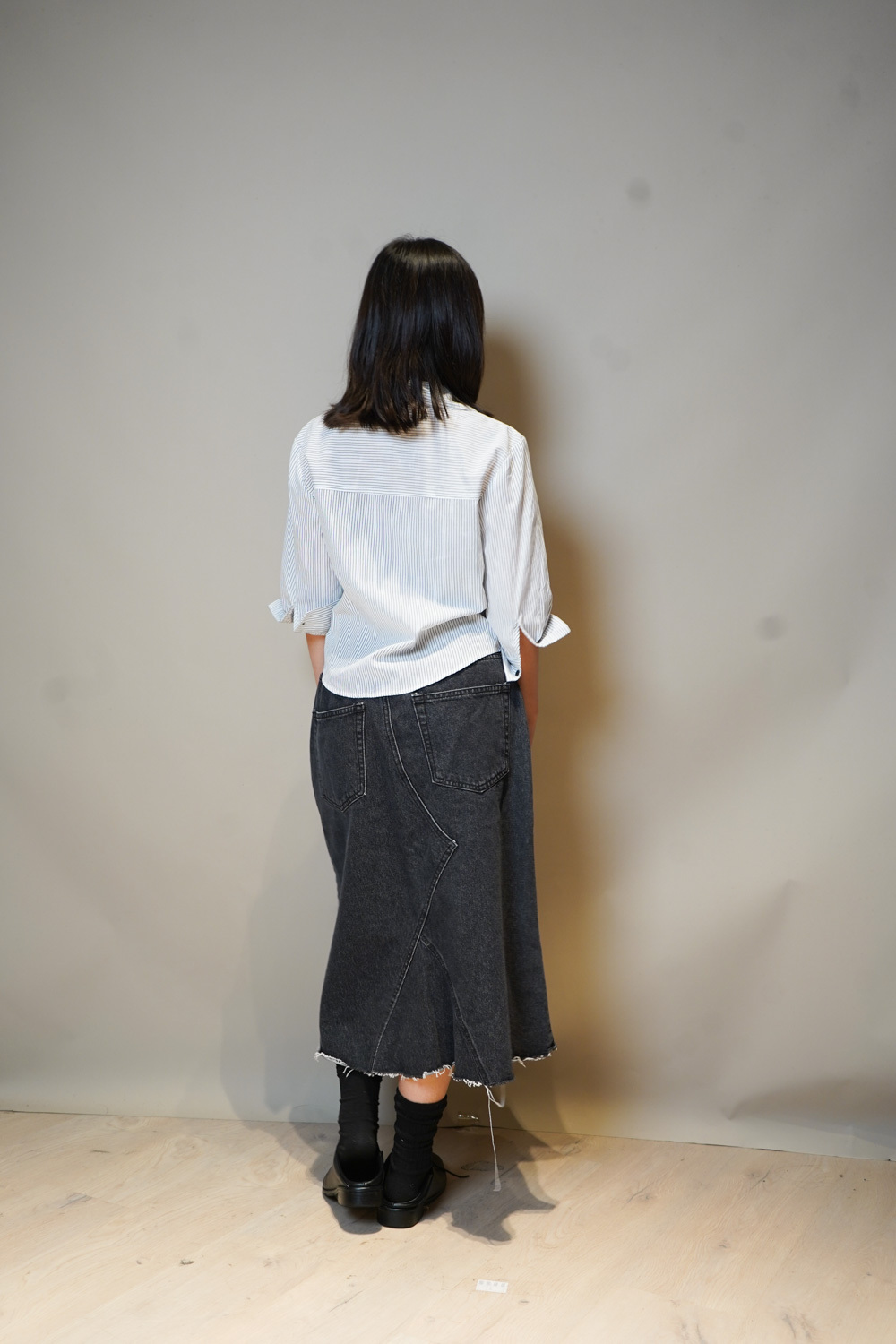 Mid-length Patchwork denim skirt (BLUE/BLACK) - Free size