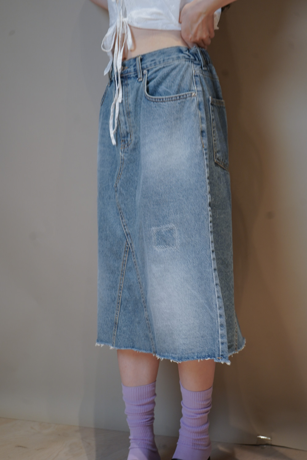 Mid-length Patchwork denim skirt (BLUE/BLACK) - Free size