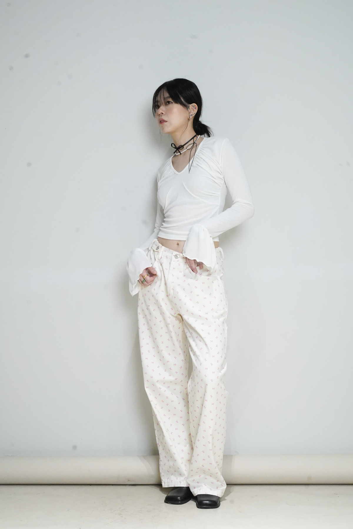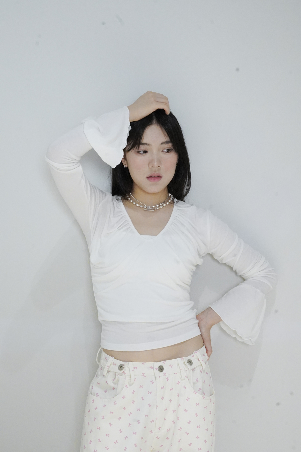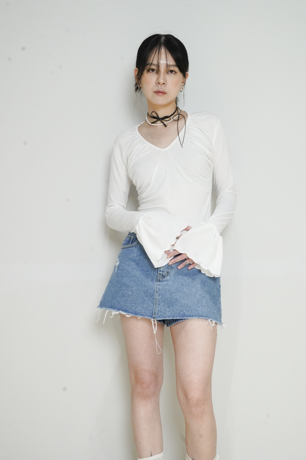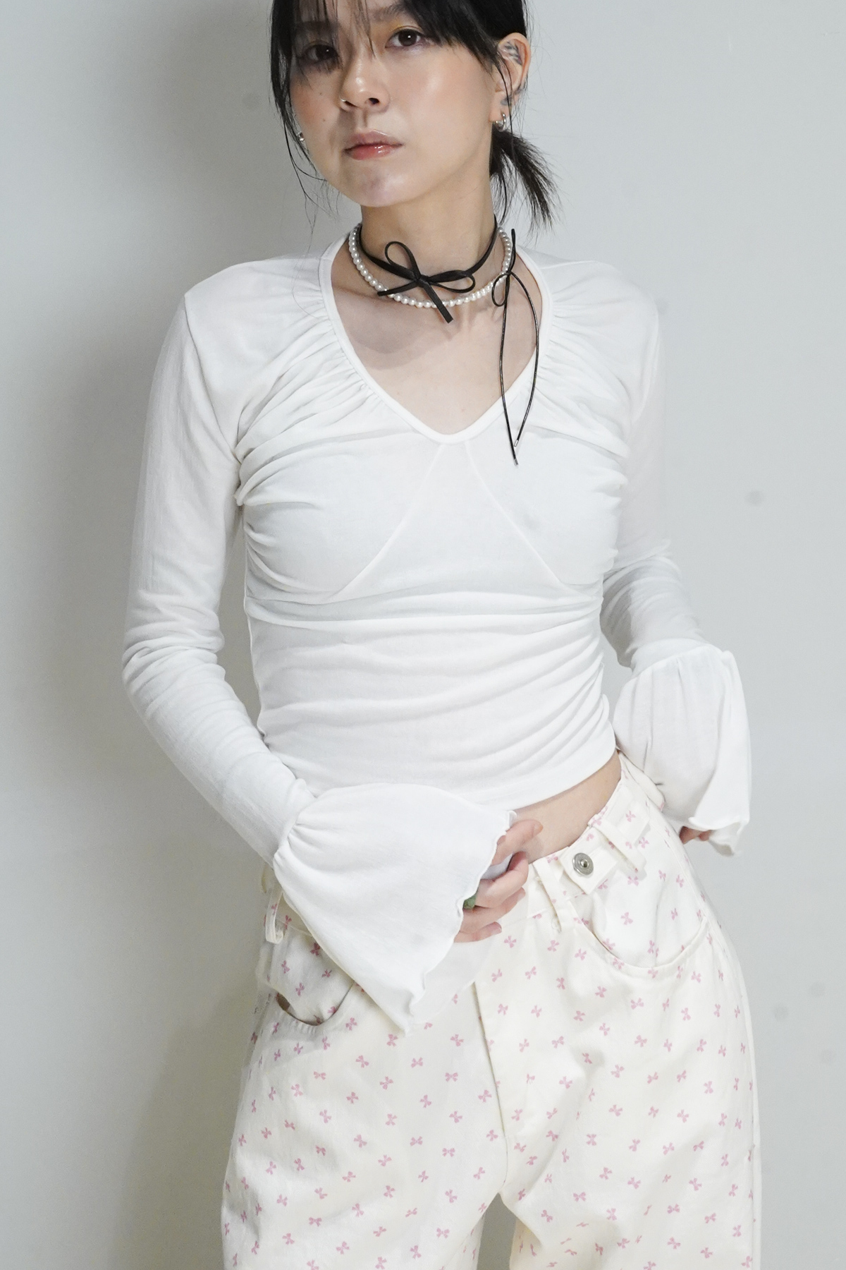 flare sleeves long top (WHITE/BLACK)