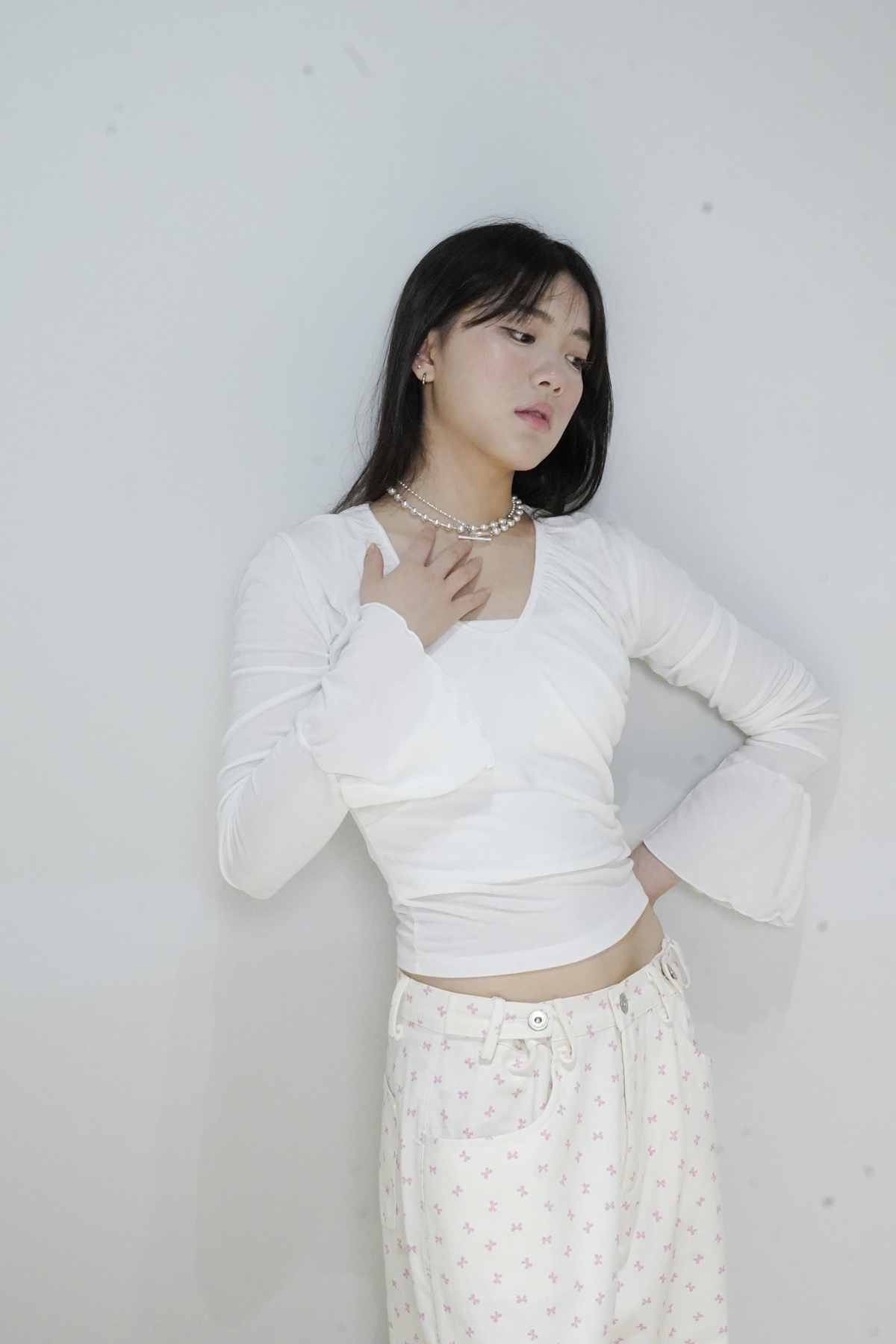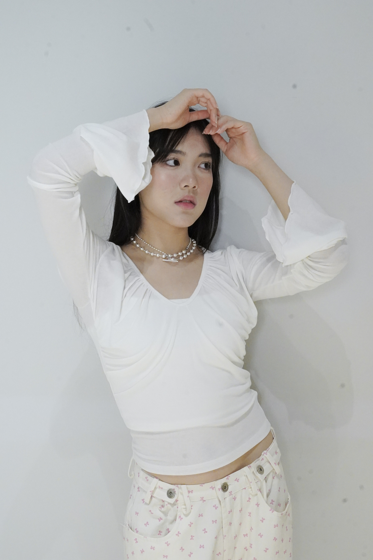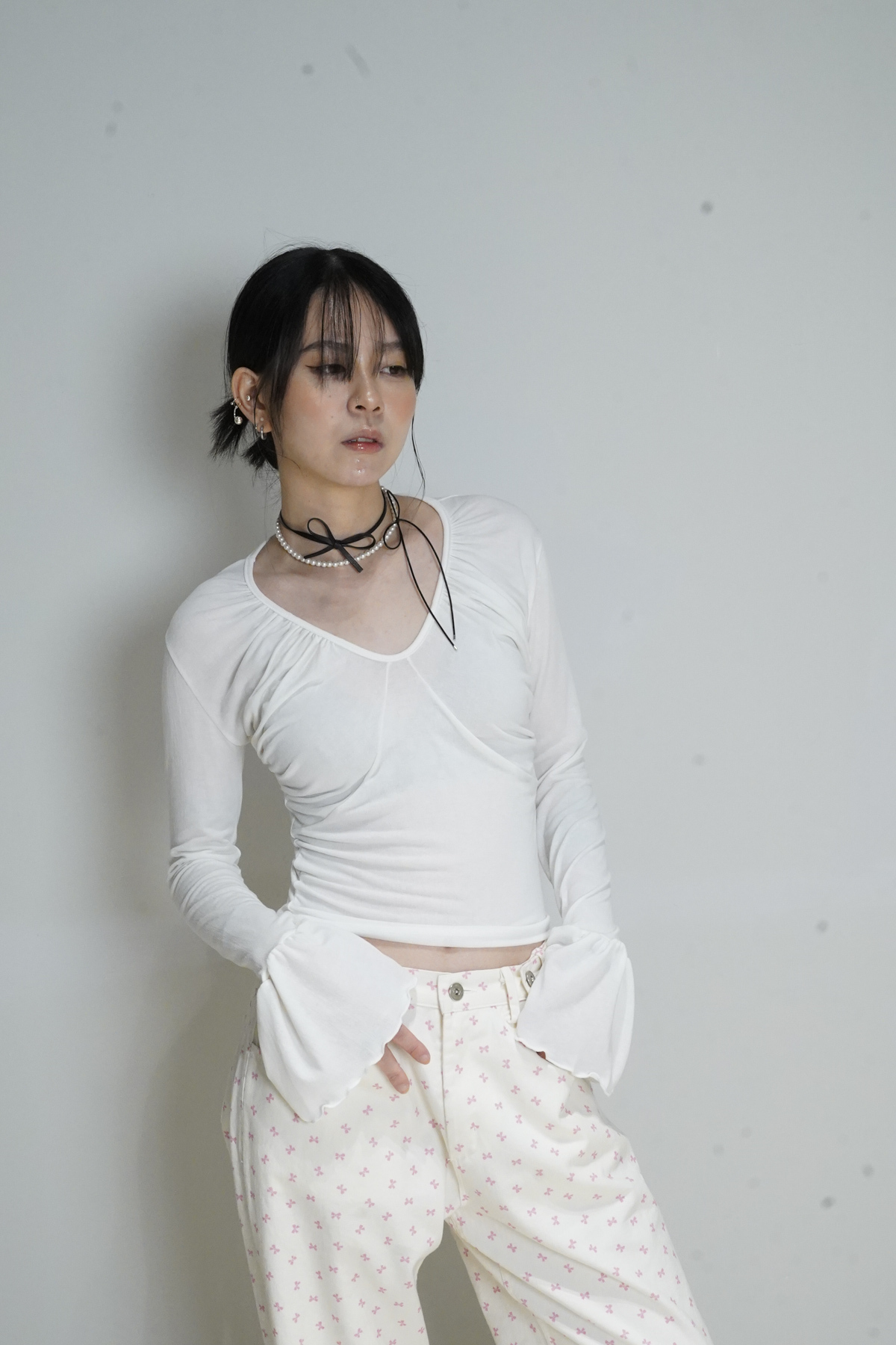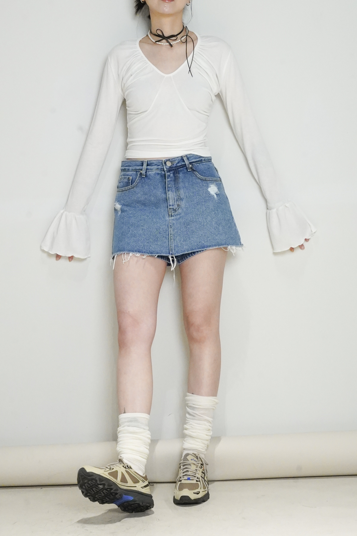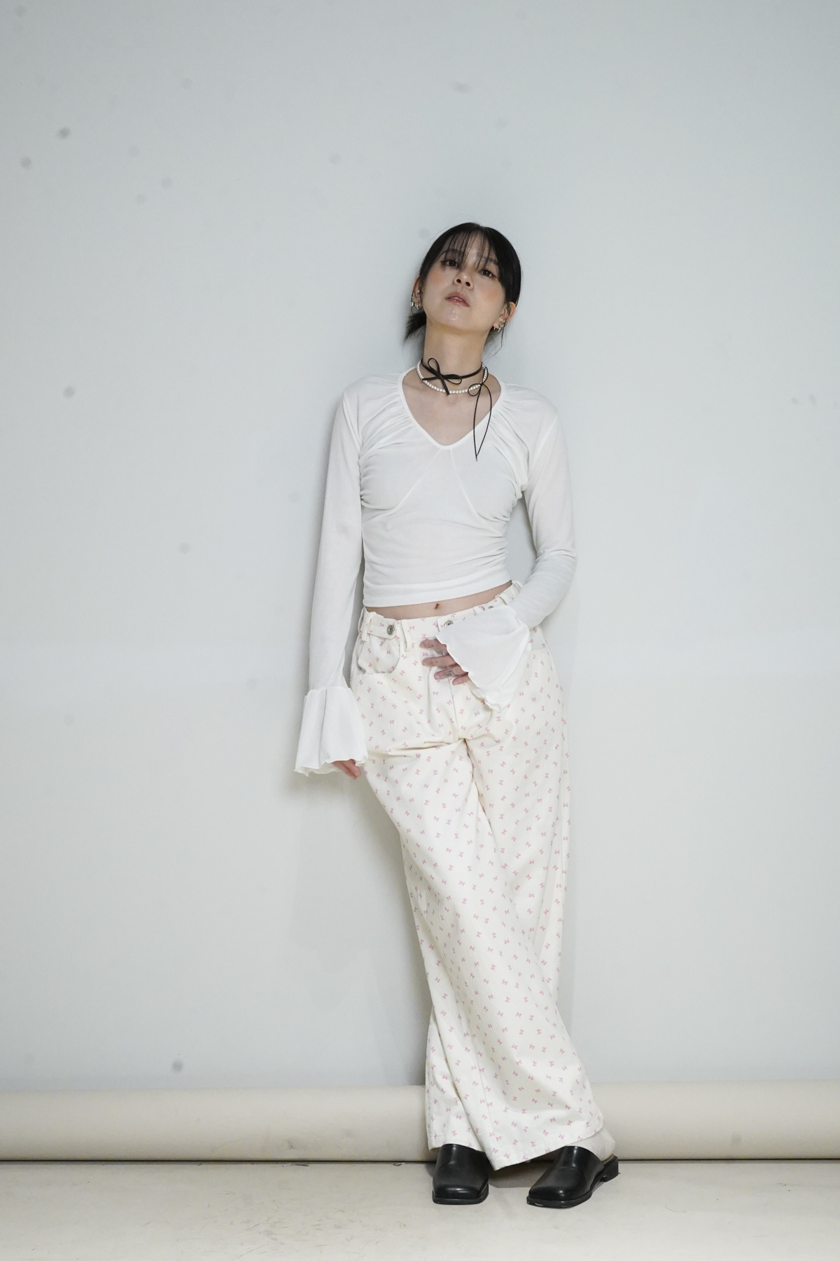 flare sleeves long top (WHITE/BLACK)