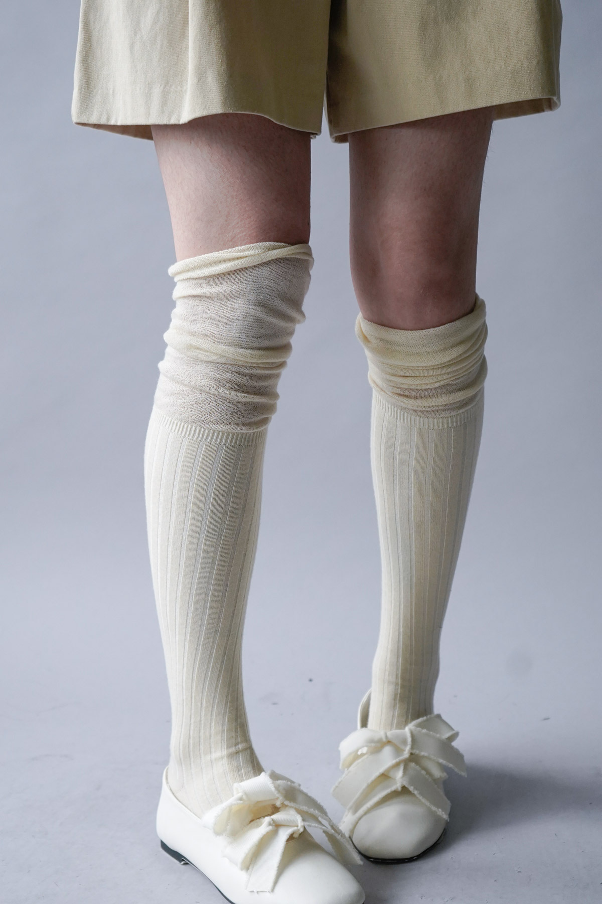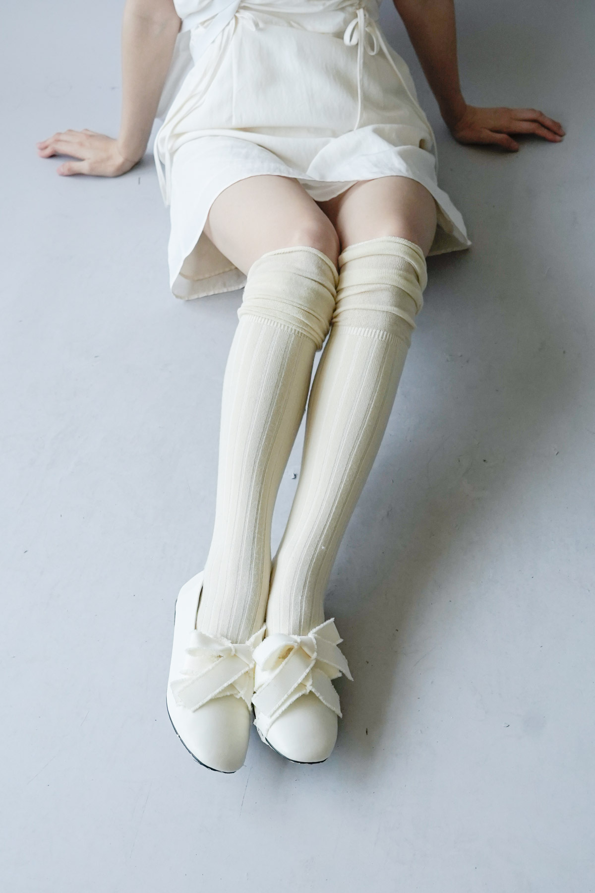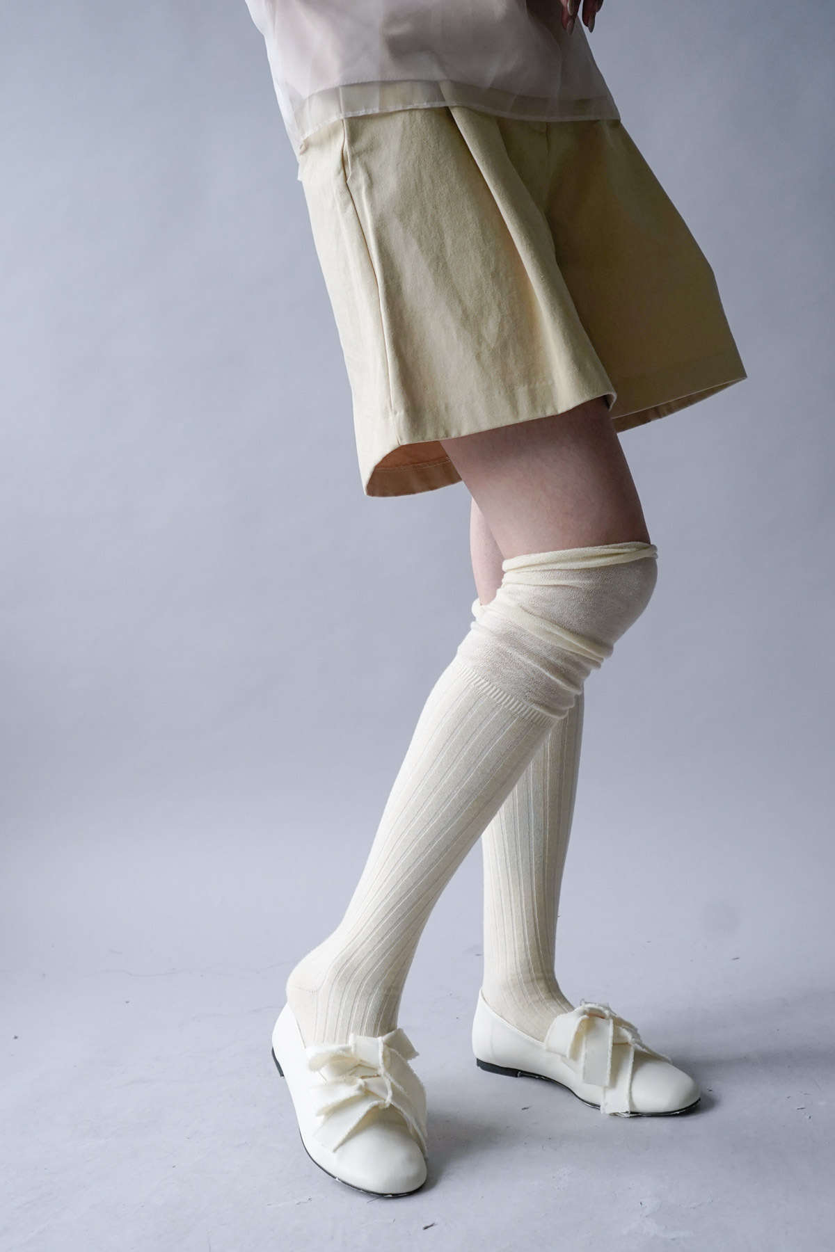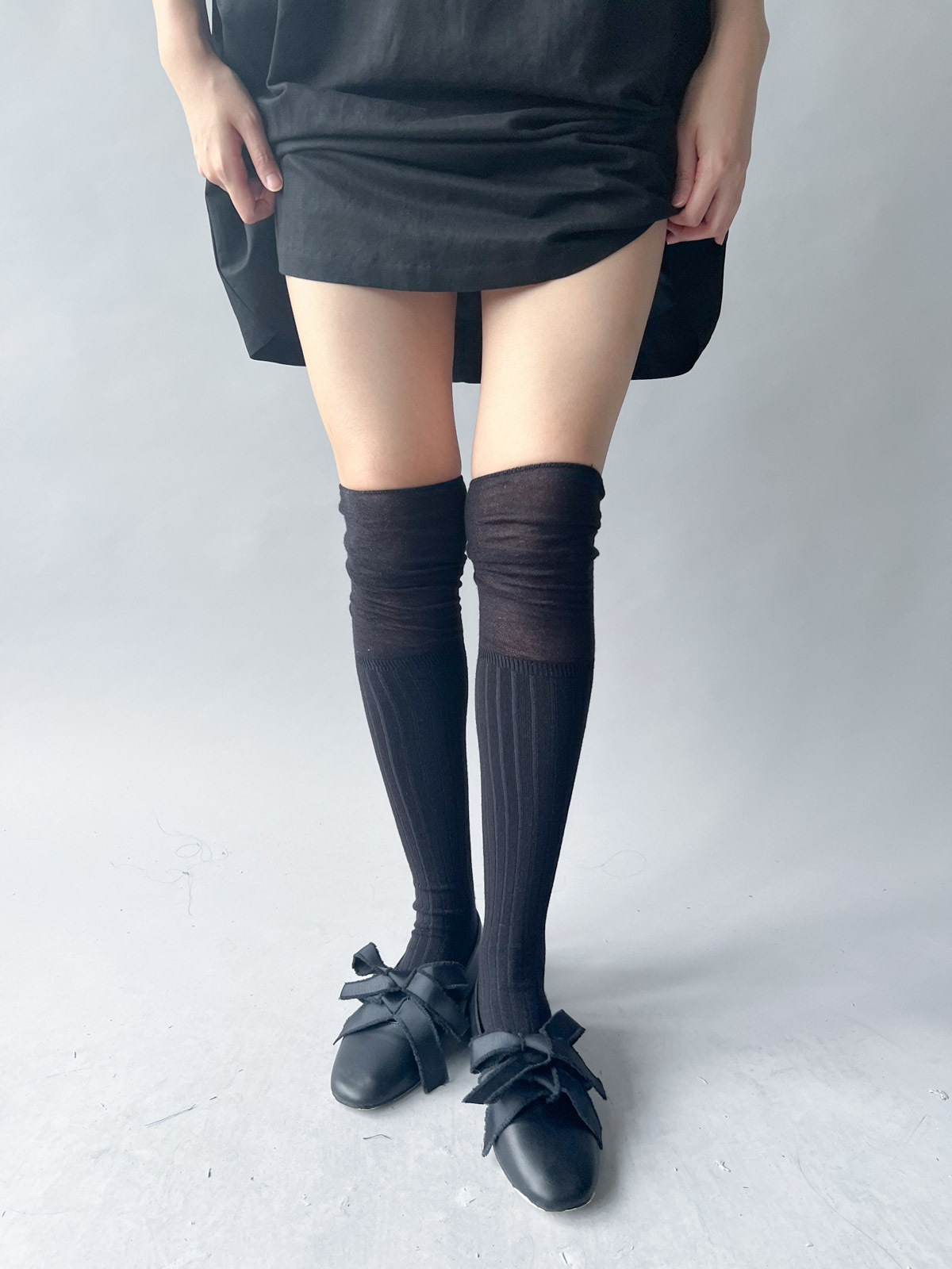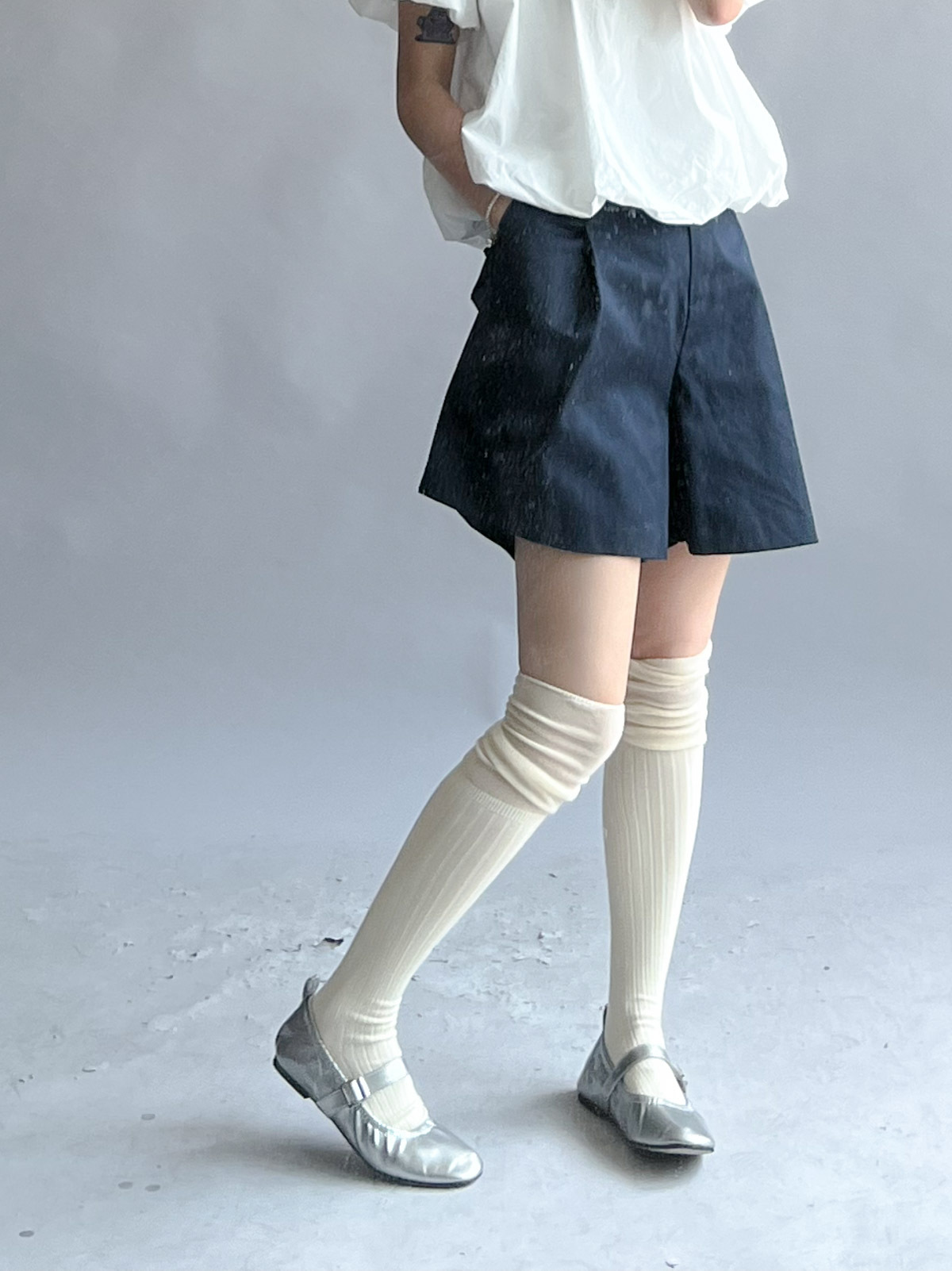 混合兩種布料 / 直坑紋修飾小腿 / 亦可拉低 作微泡泡襪穿着 /