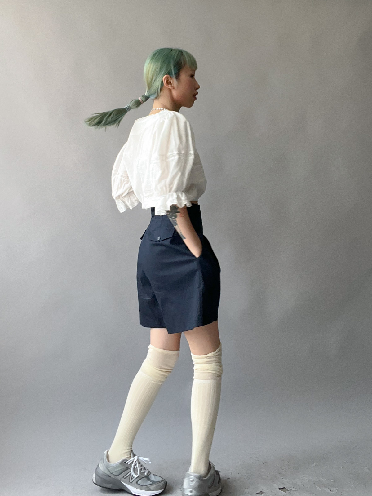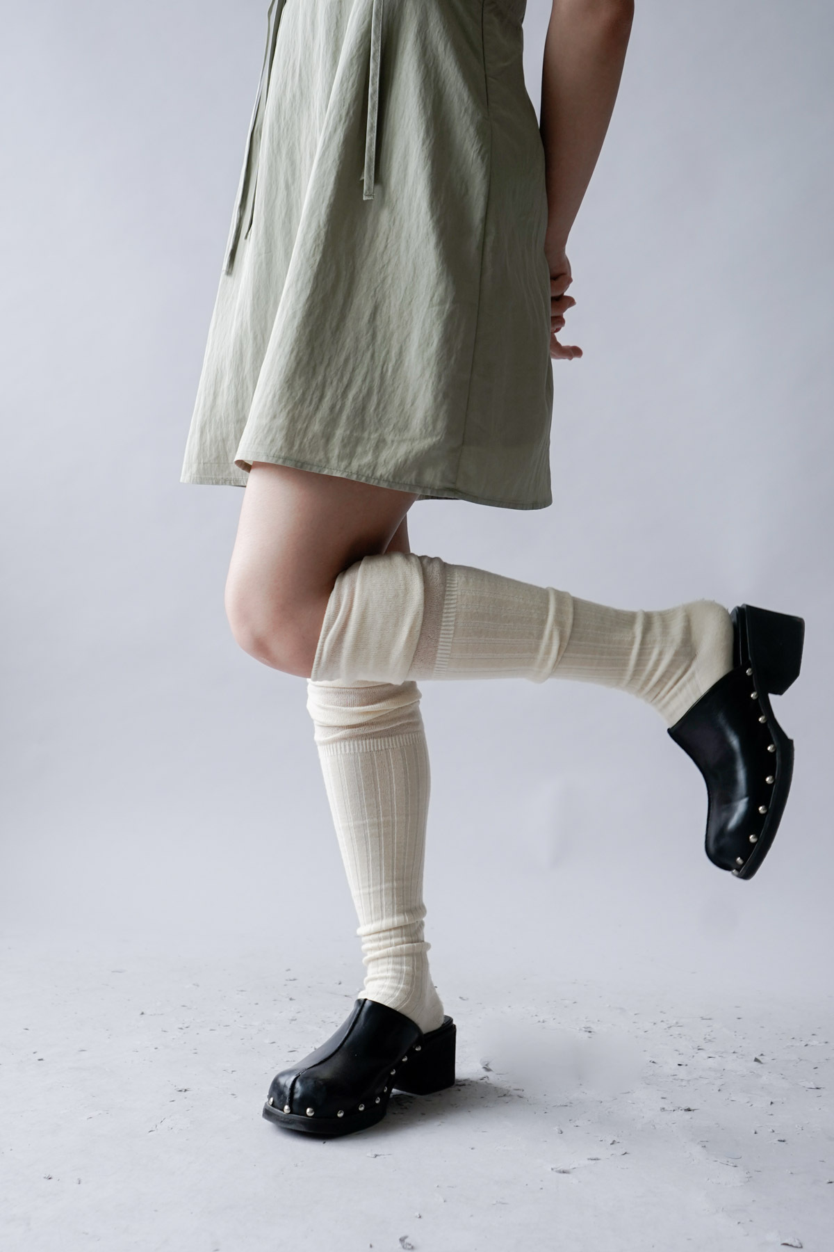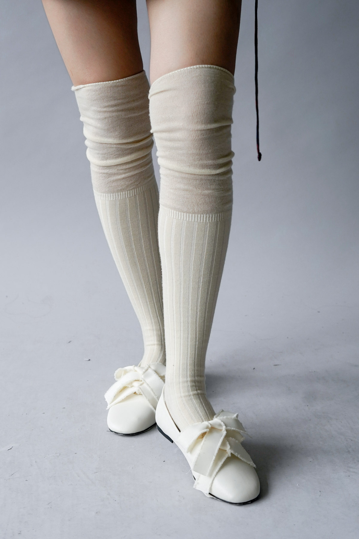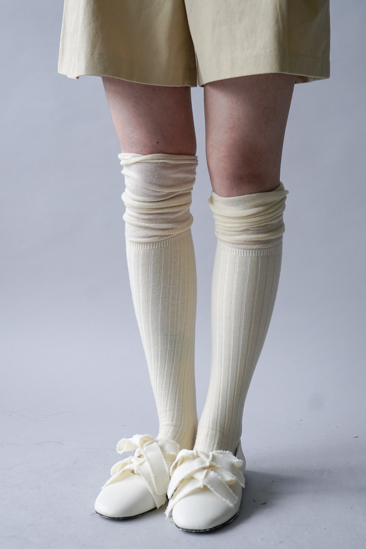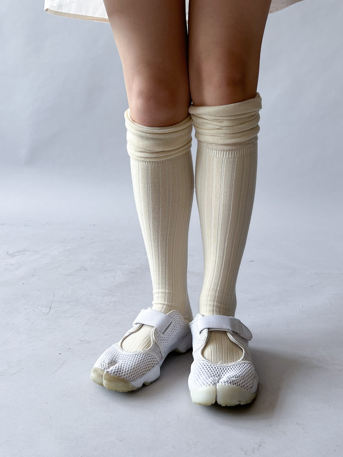 混合兩種布料 / 直坑紋修飾小腿 / 亦可拉低 作微泡泡襪穿着 /