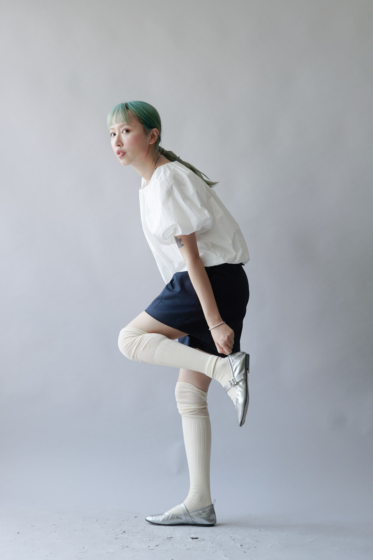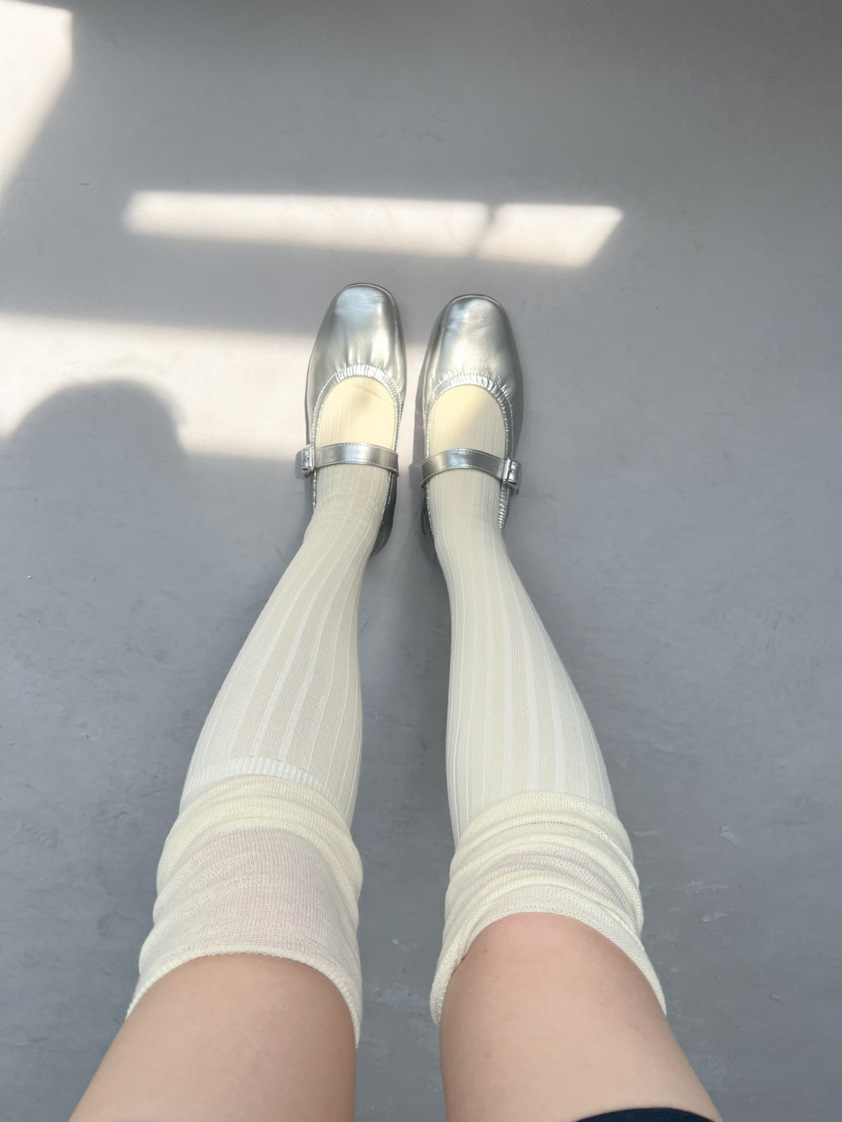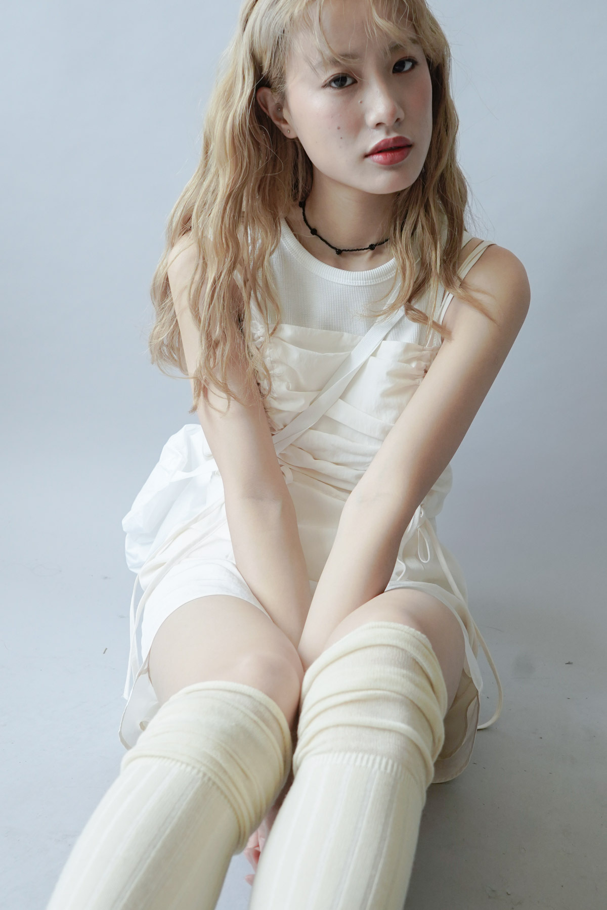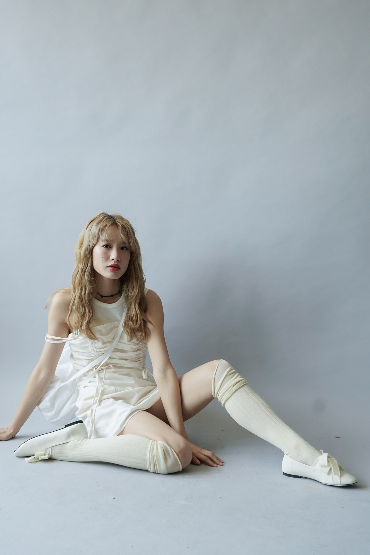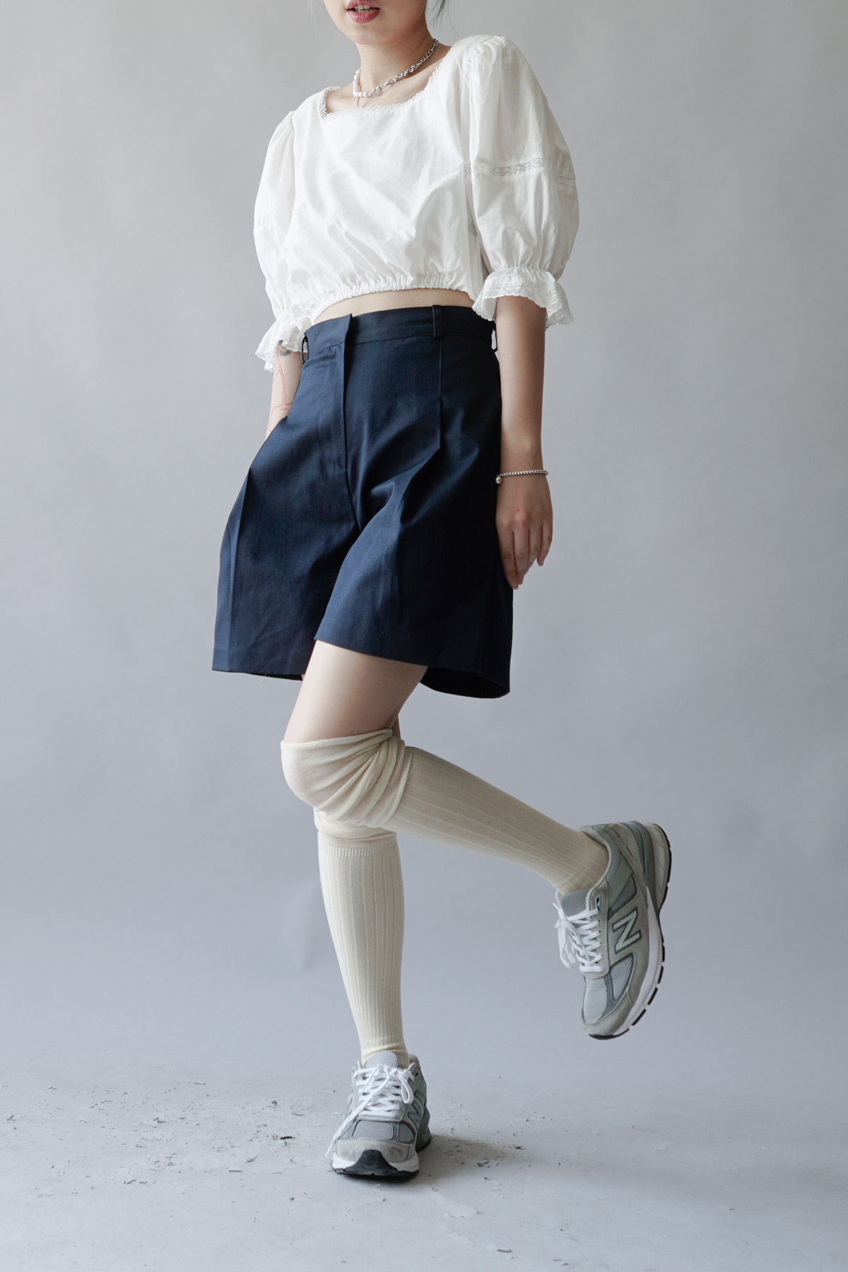 混合兩種布料 / 直坑紋修飾小腿 / 亦可拉低 作微泡泡襪穿着 /