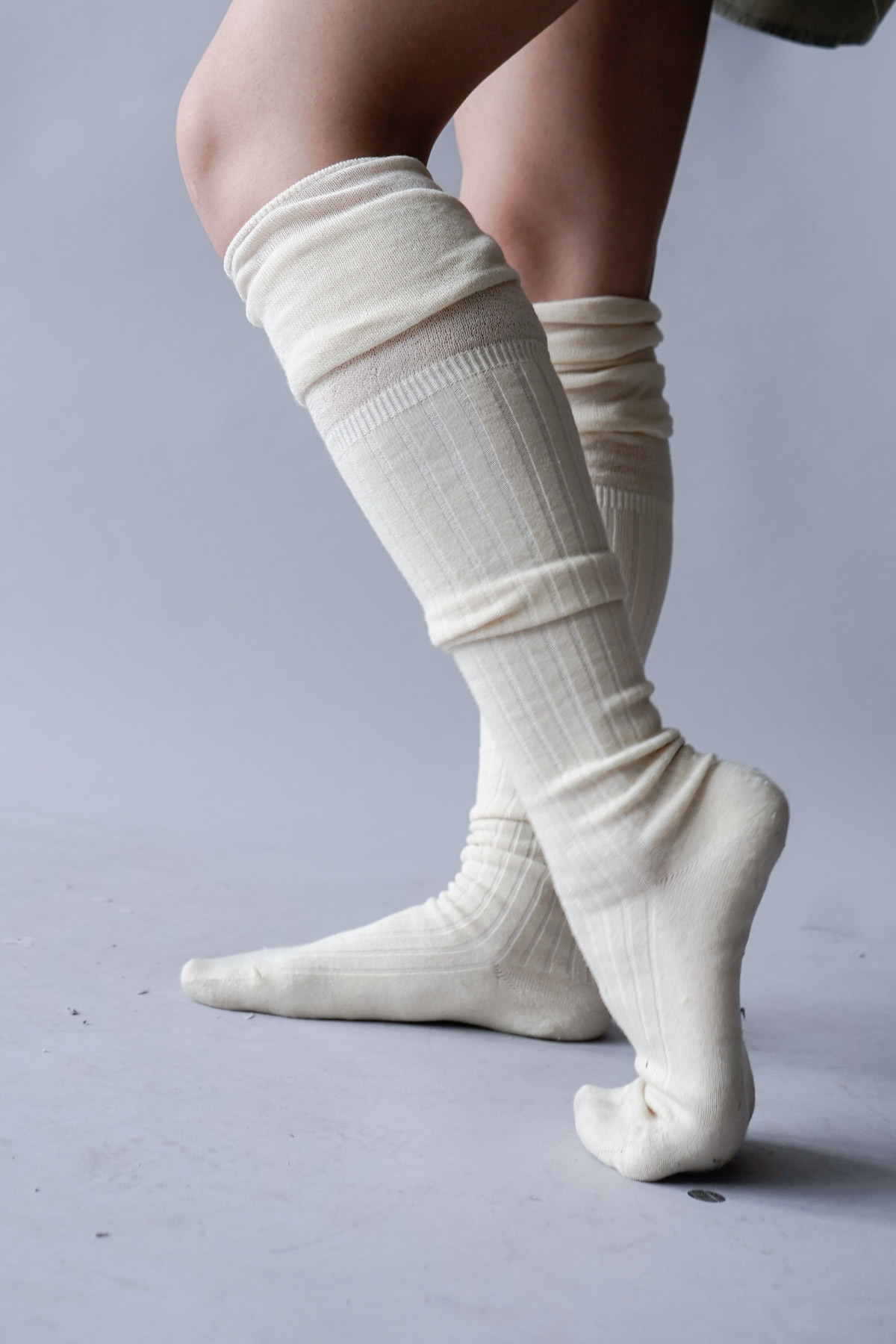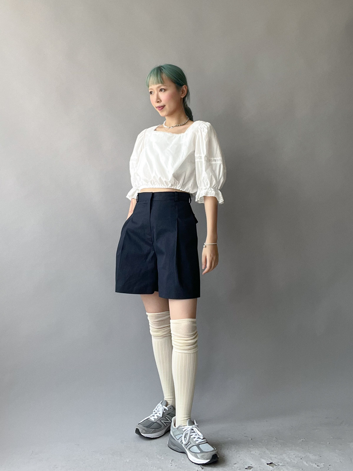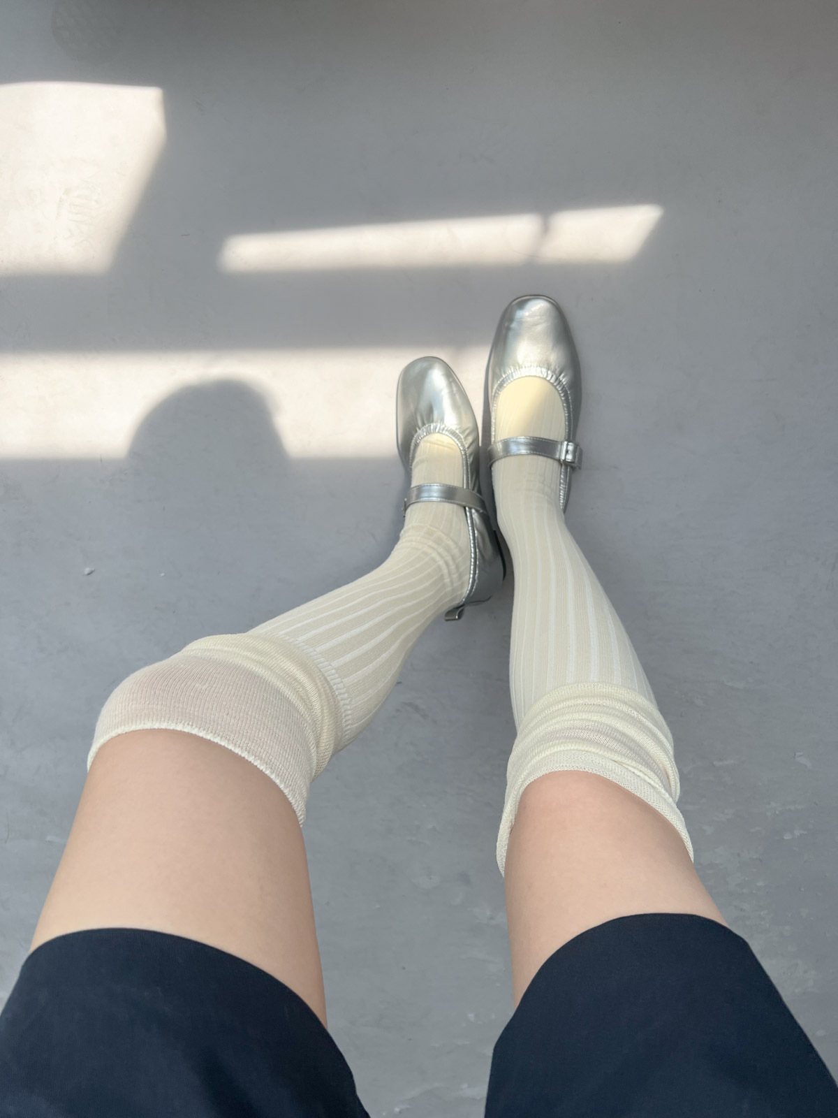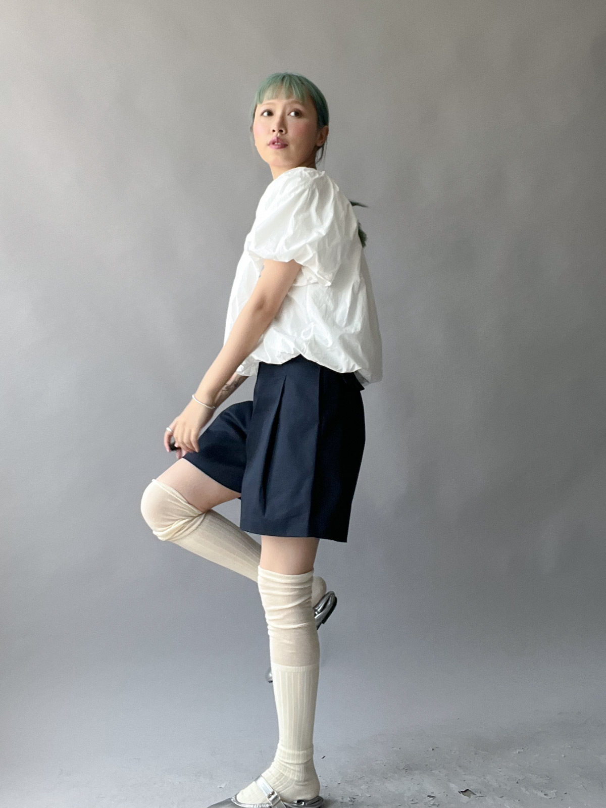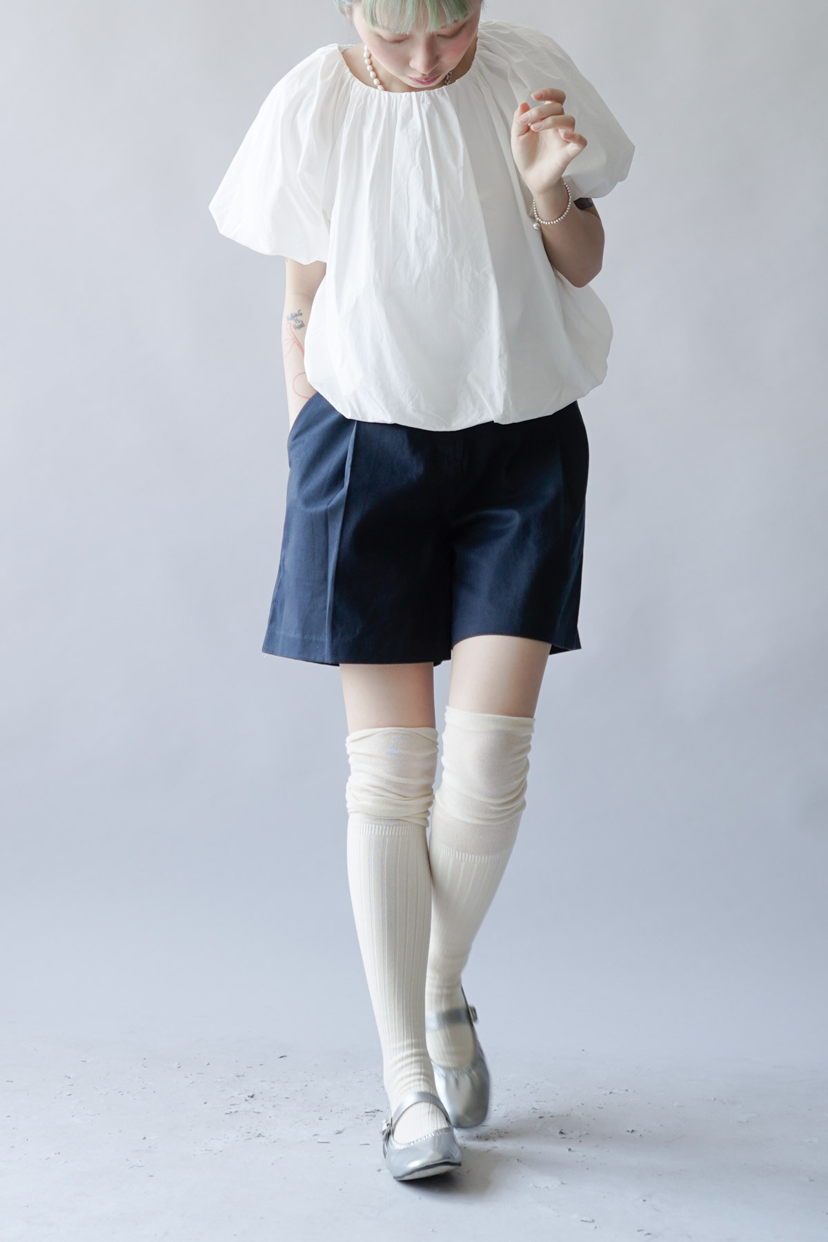 混合兩種布料 / 直坑紋修飾小腿 / 亦可拉低 作微泡泡襪穿着 /
