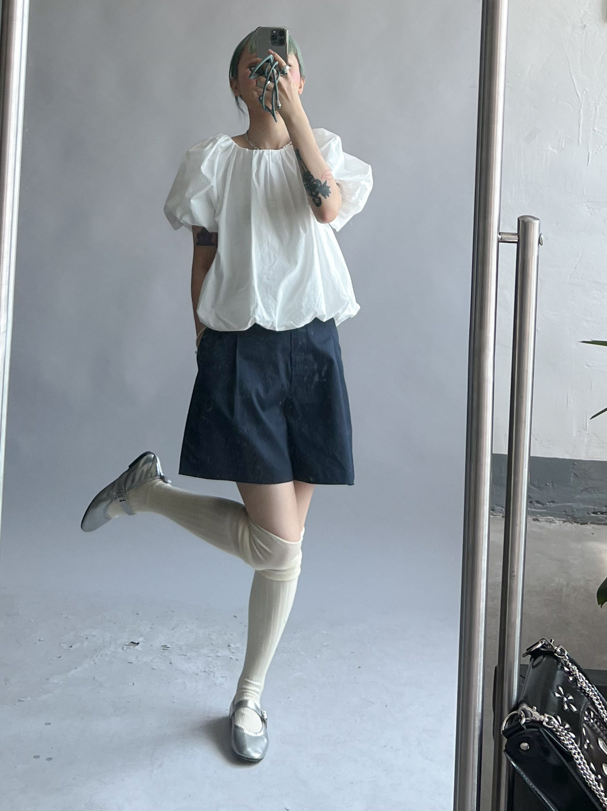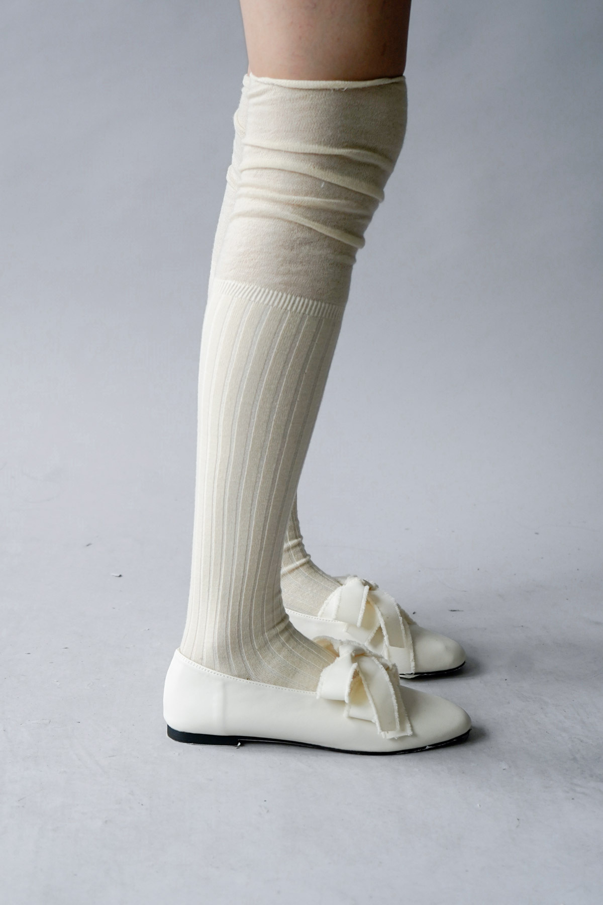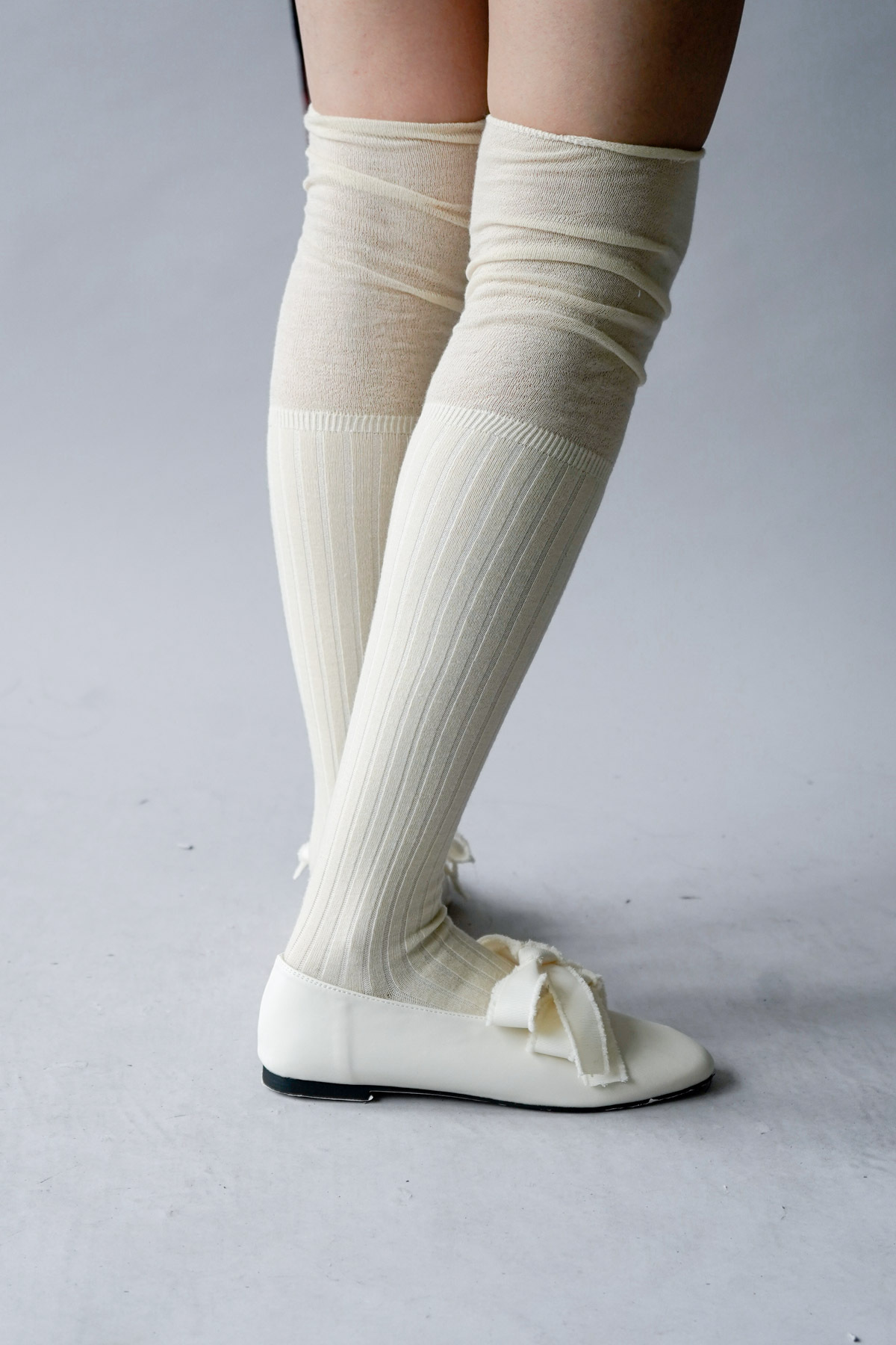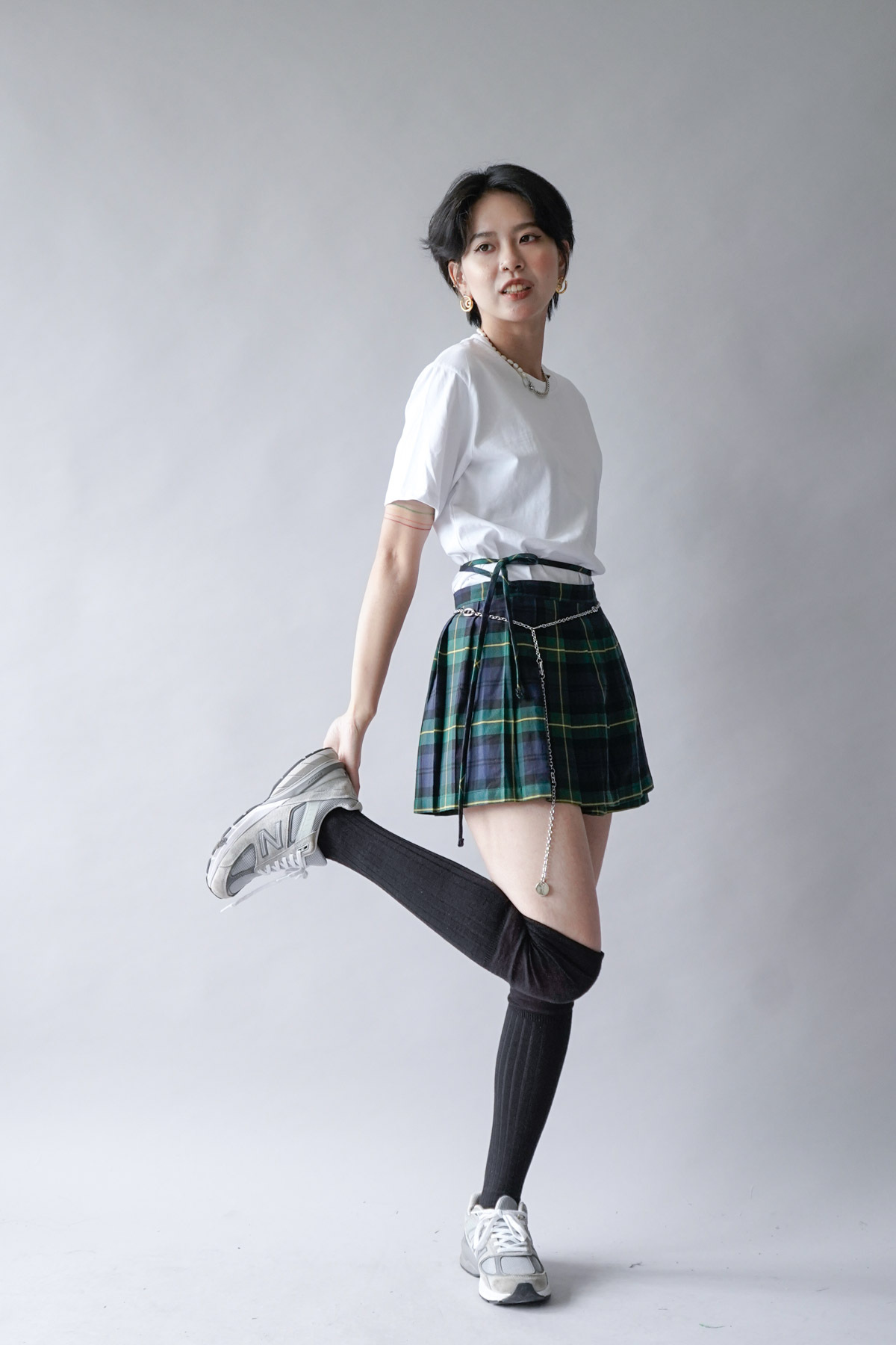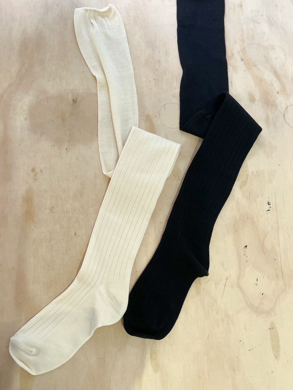 混合兩種布料 / 直坑紋修飾小腿 / 亦可拉低 作微泡泡襪穿着 /
