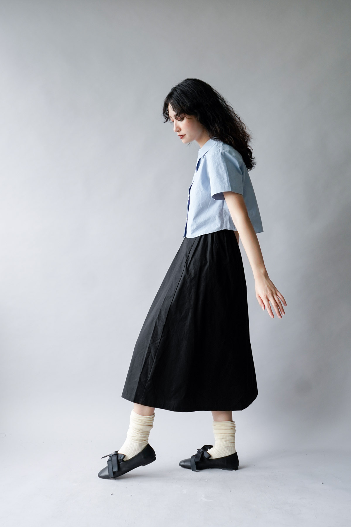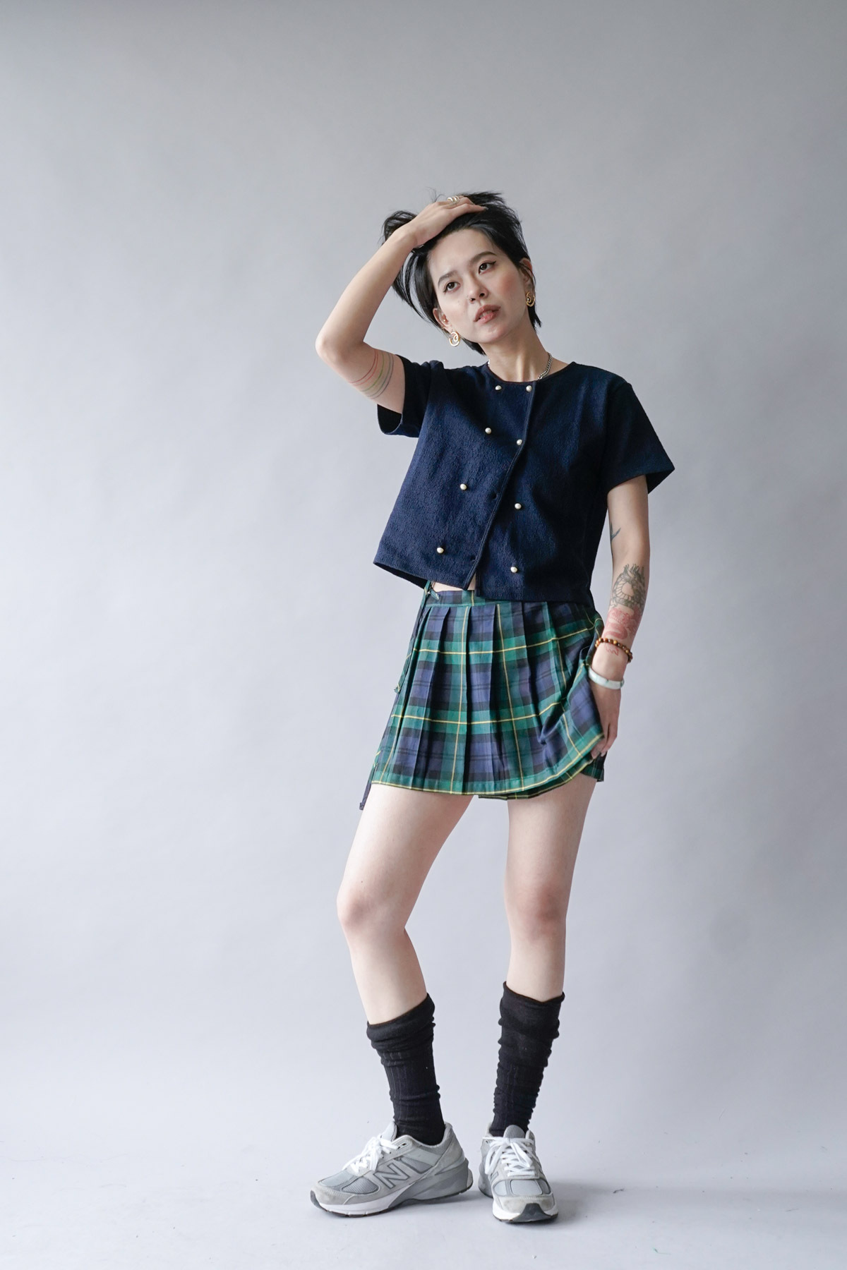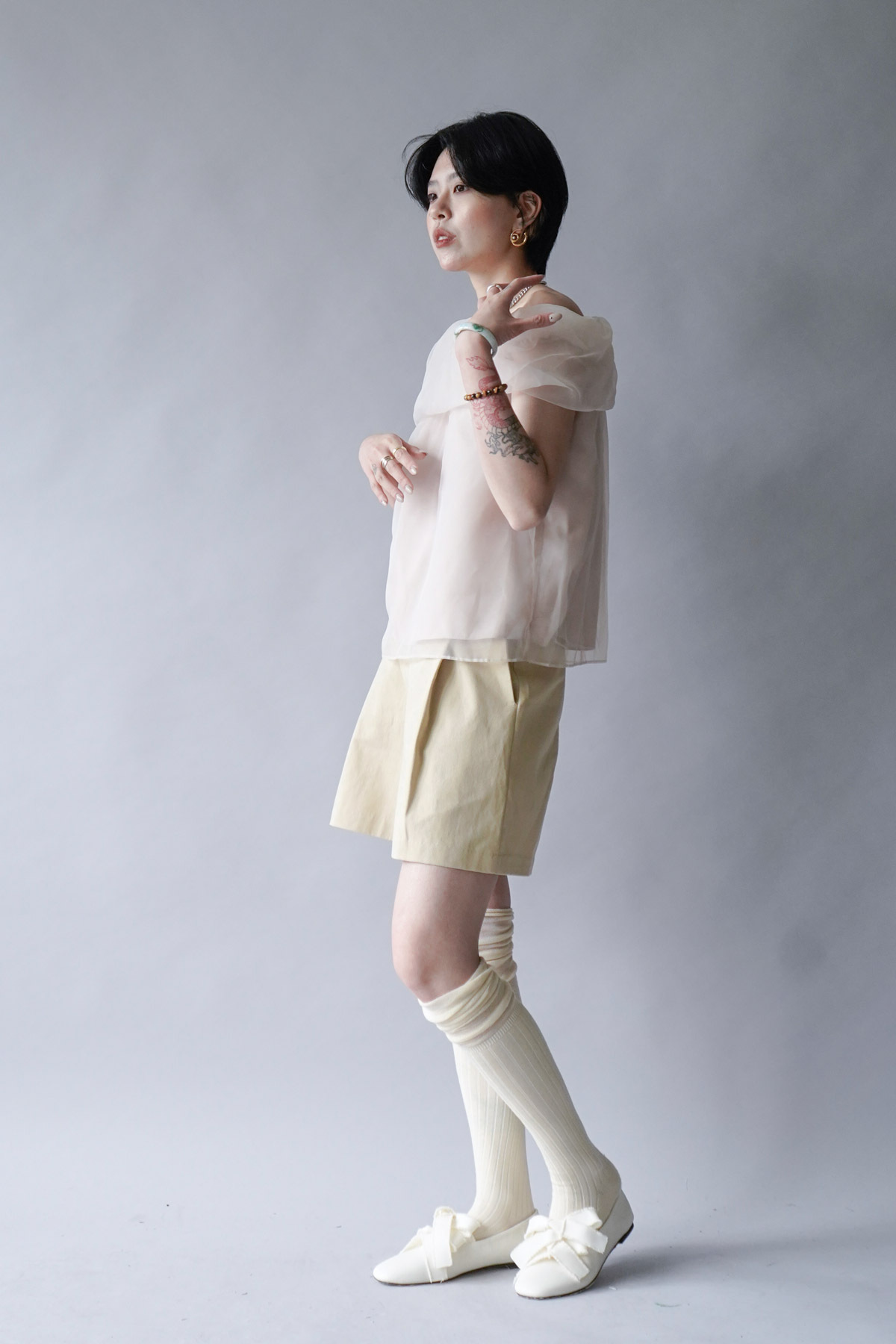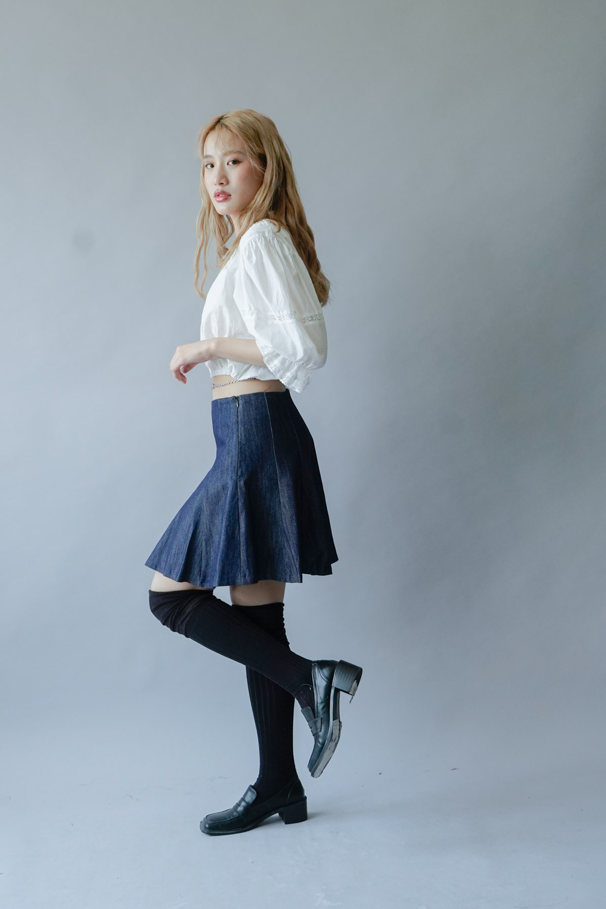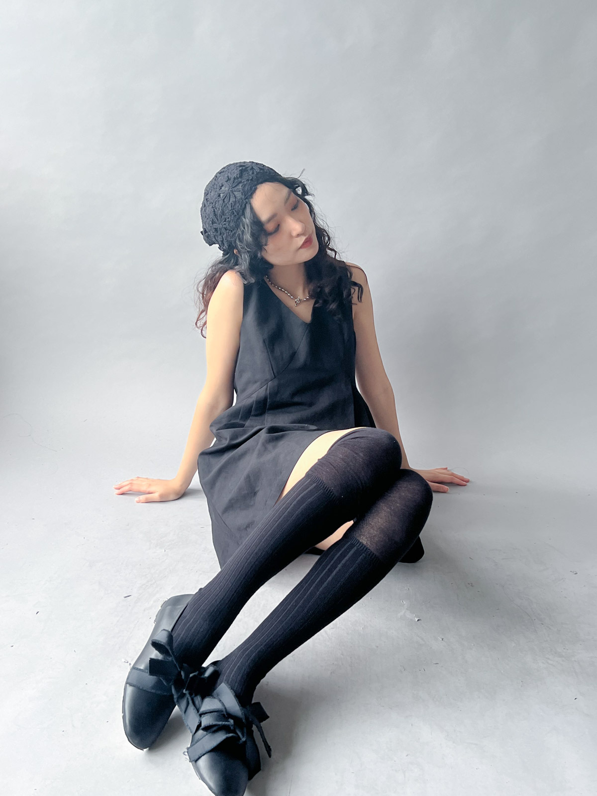 混合兩種布料 / 直坑紋修飾小腿 / 亦可拉低 作微泡泡襪穿着 /