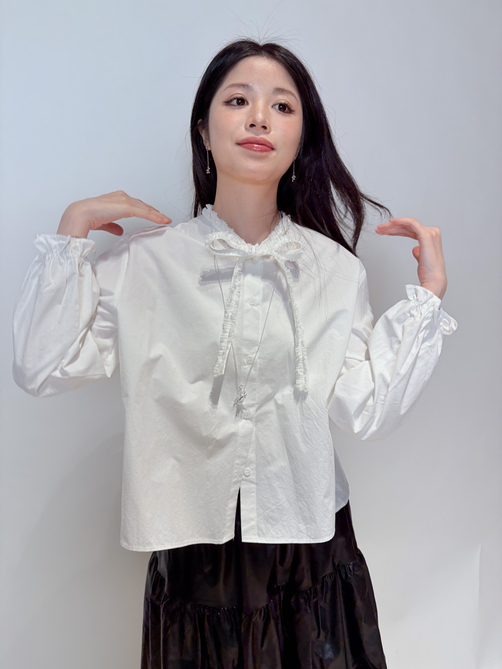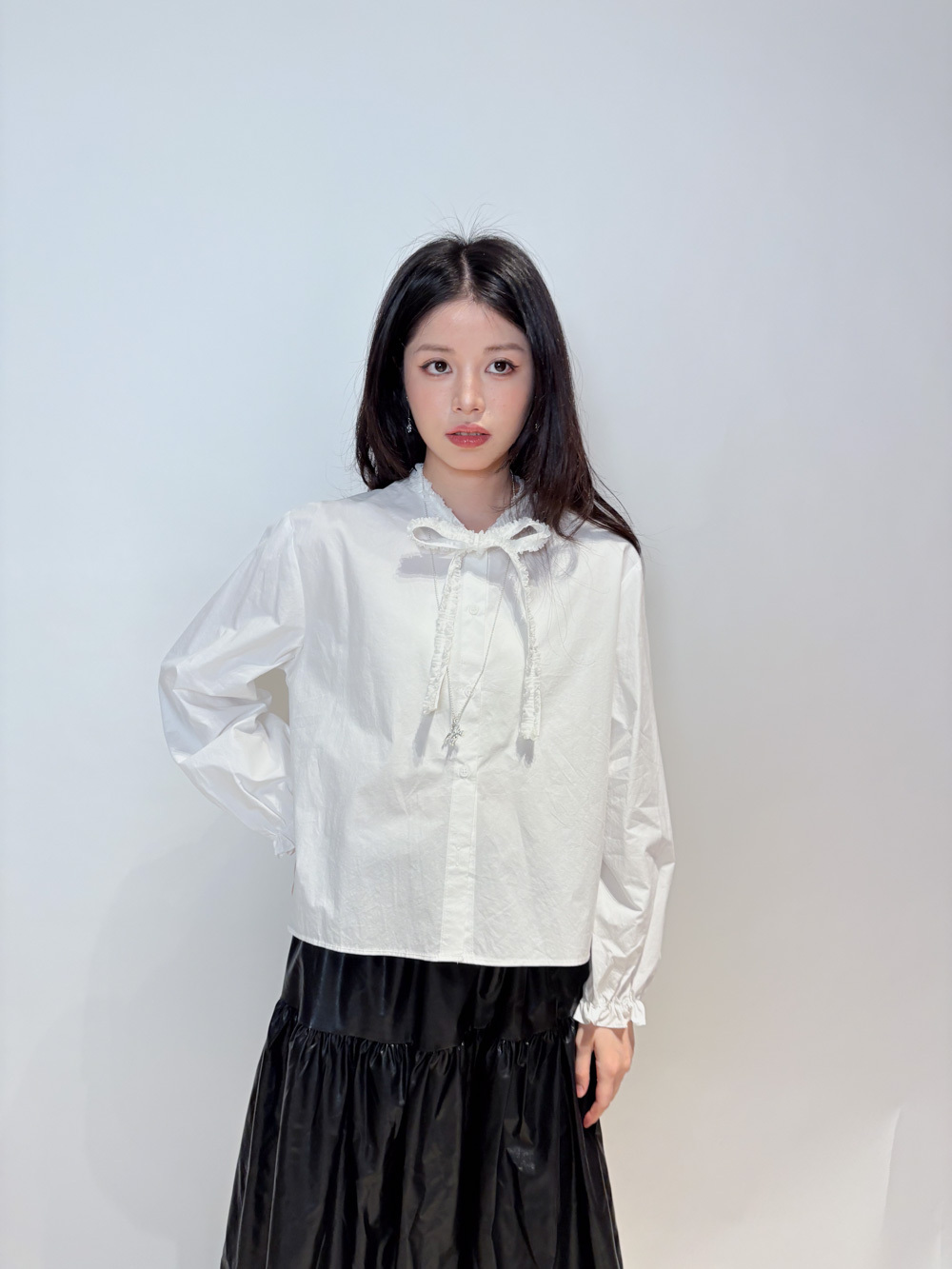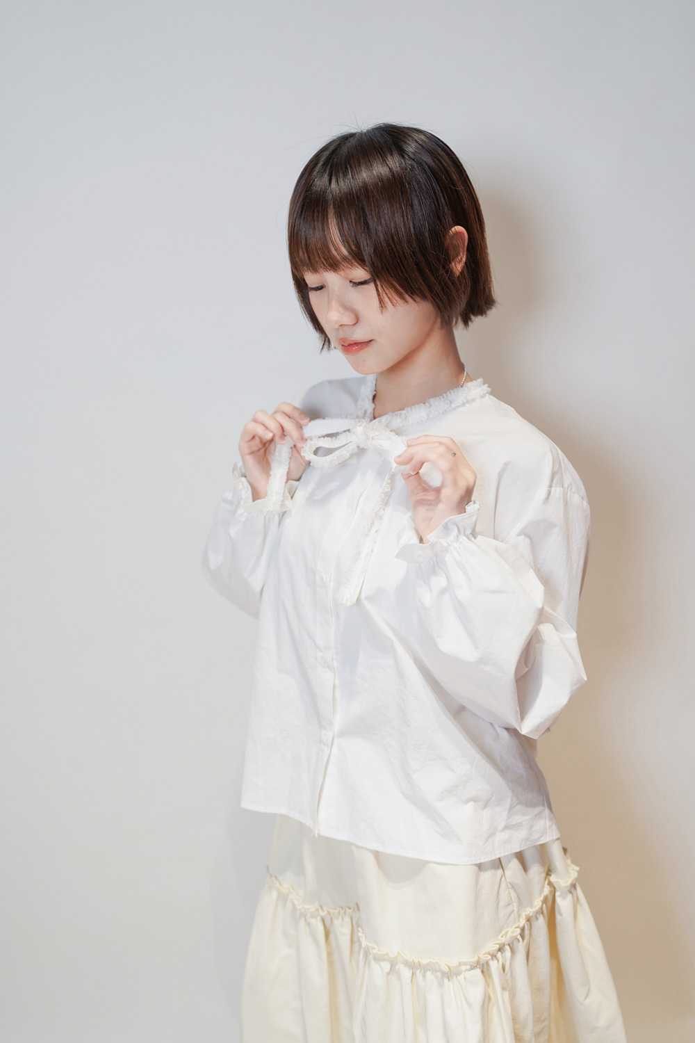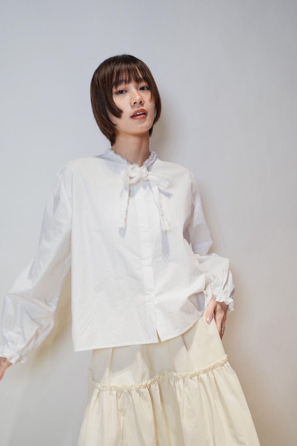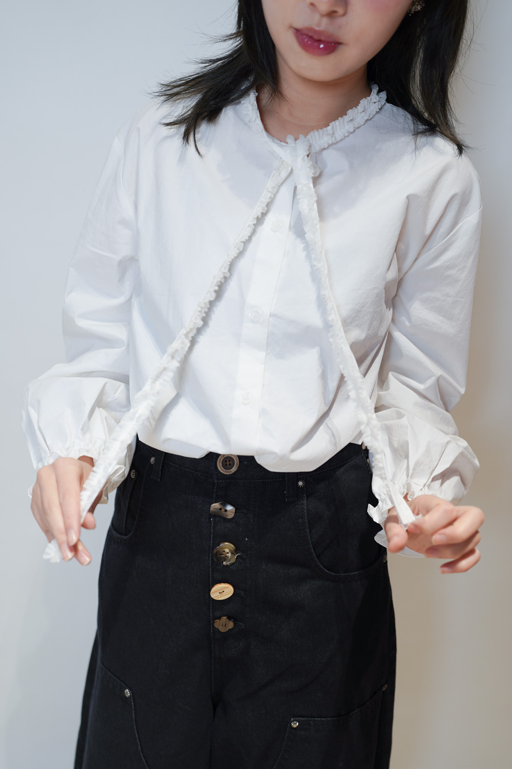領口ruffle邊長帶設計 可綁蝴蝶結也可隨意垂於領口前/