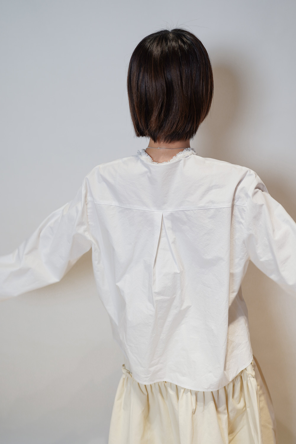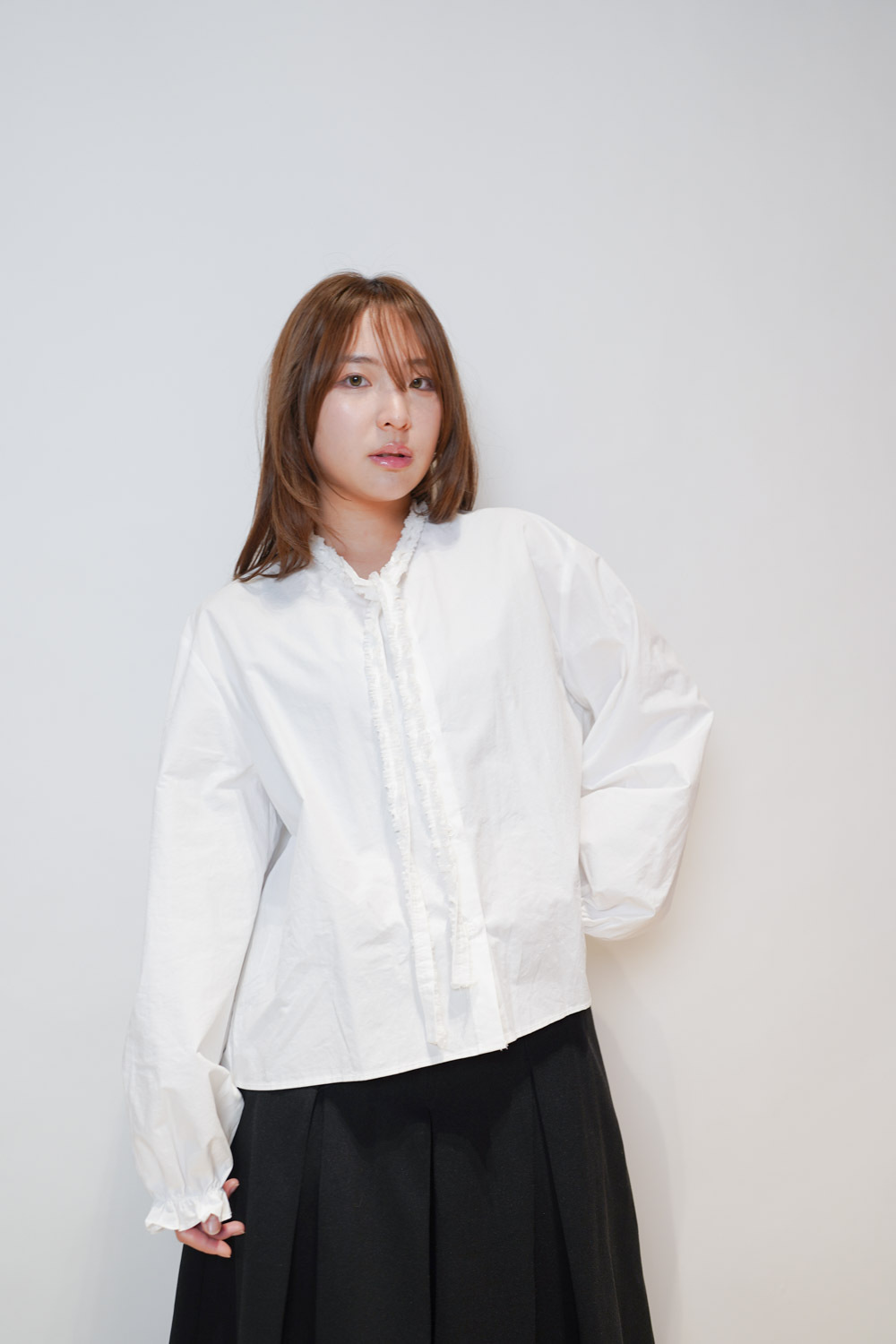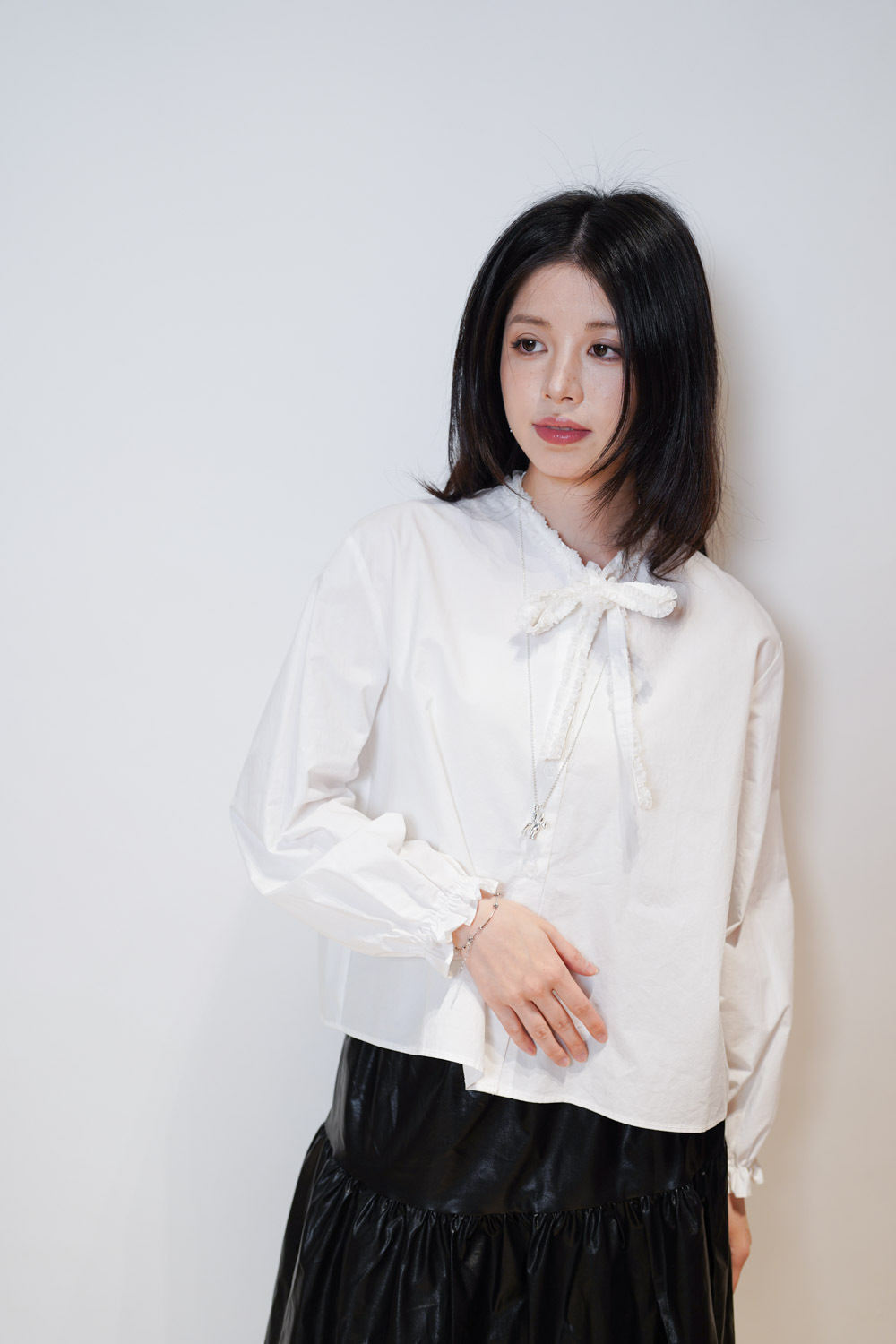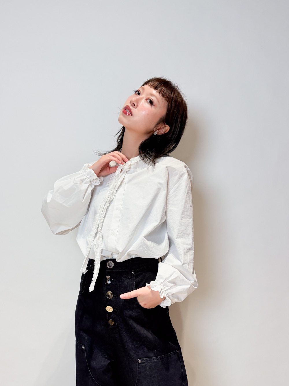 領口ruffle邊長帶設計 可綁蝴蝶結也可隨意垂於領口前/