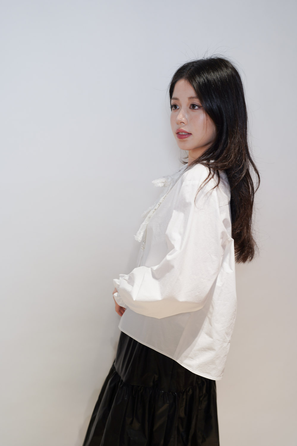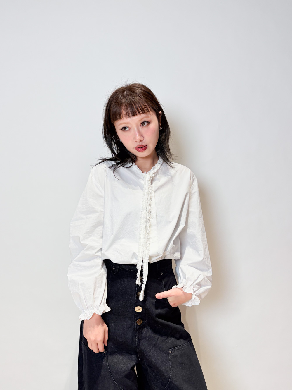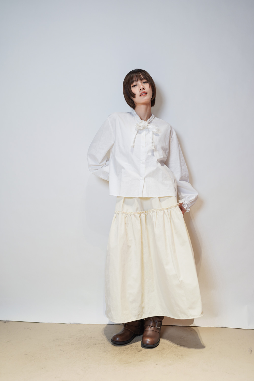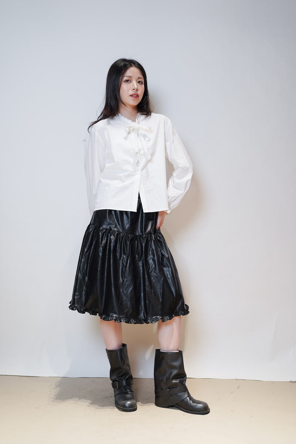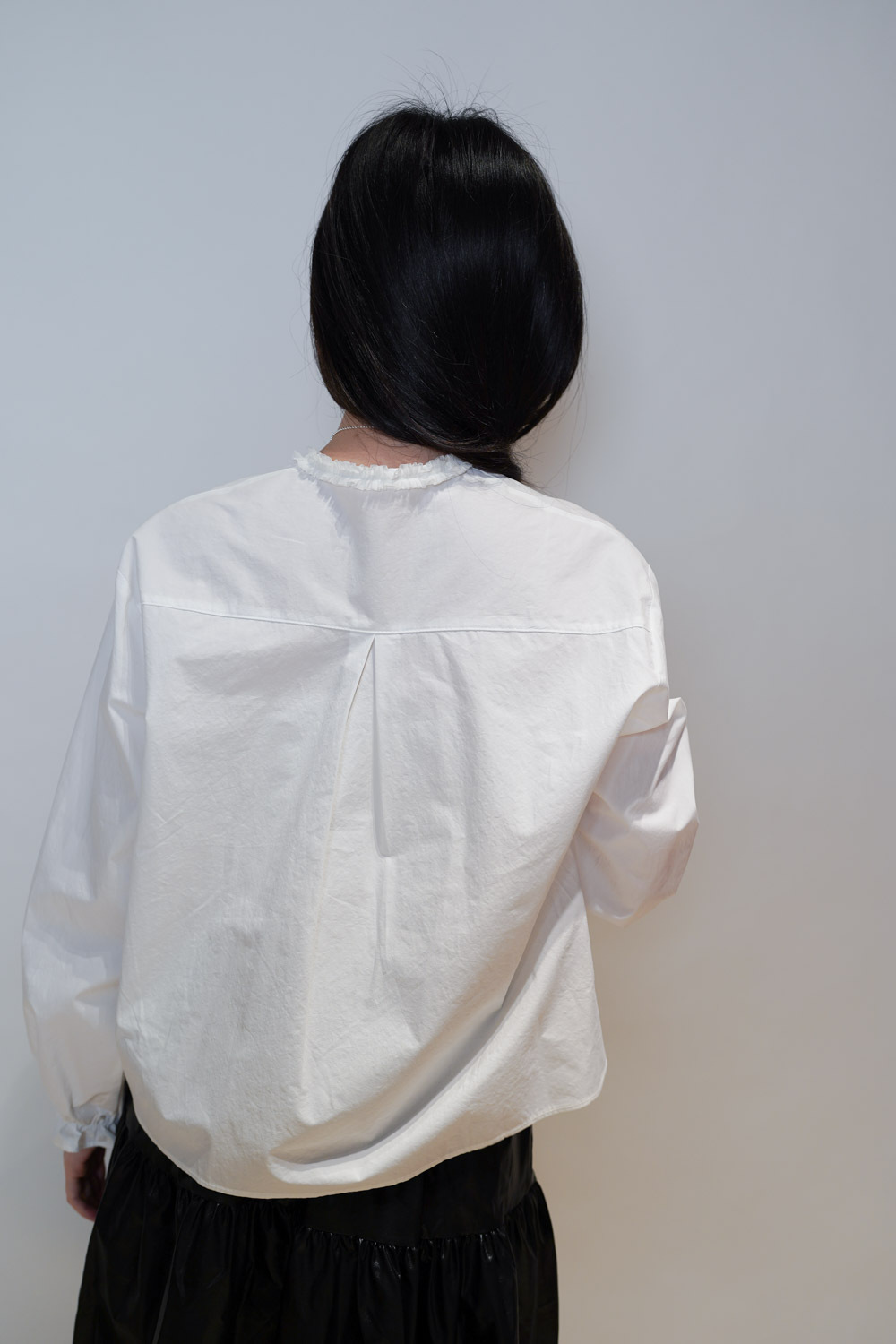 領口ruffle邊長帶設計 可綁蝴蝶結也可隨意垂於領口前/