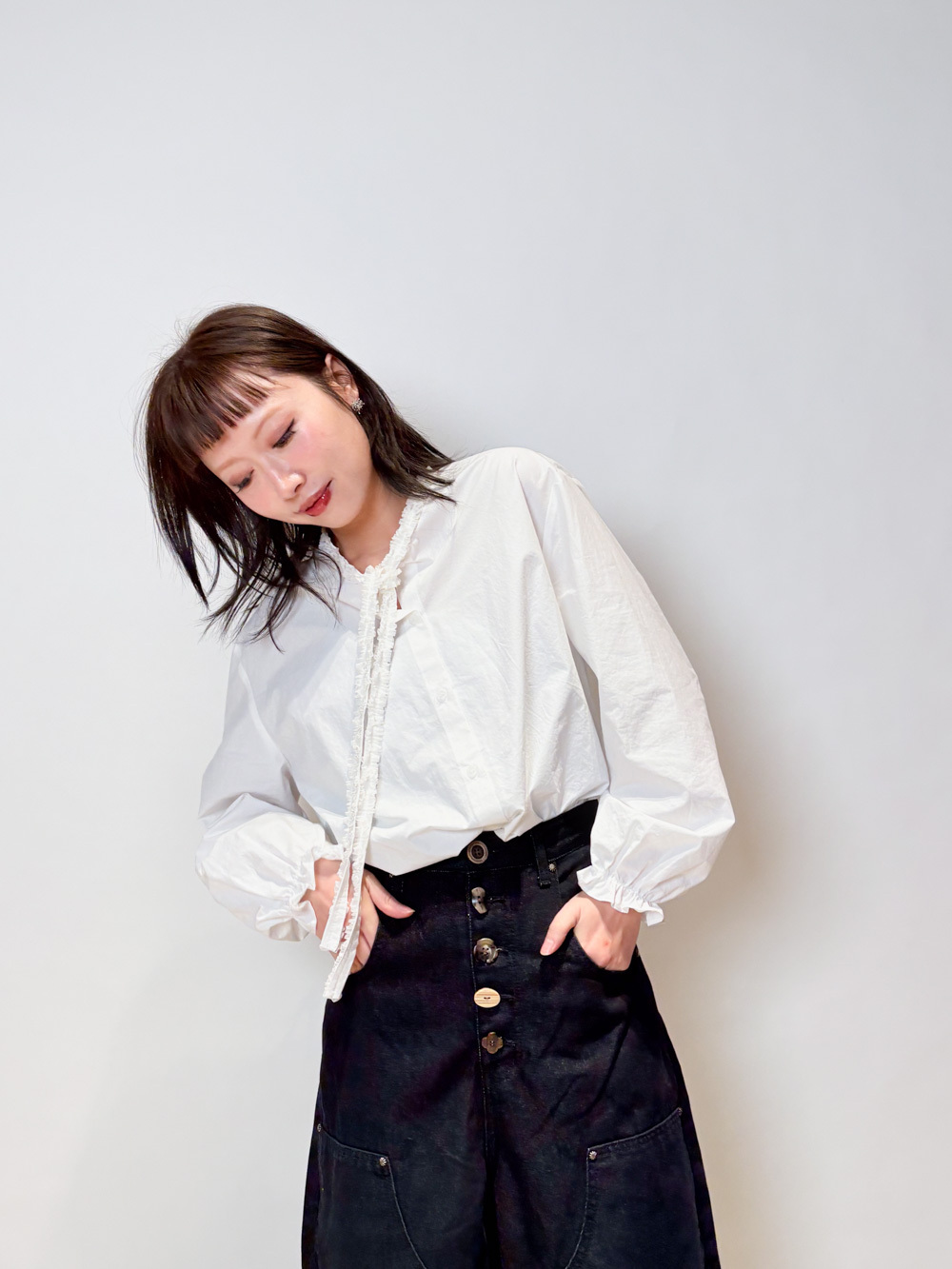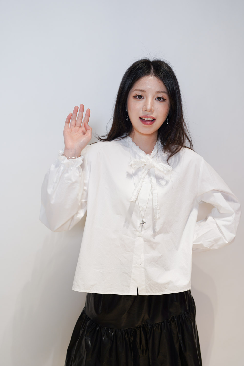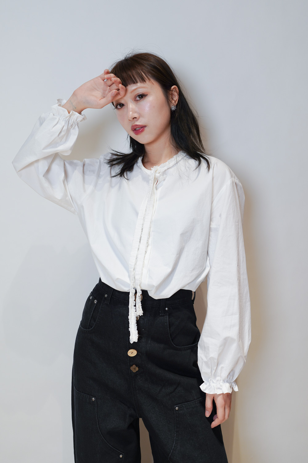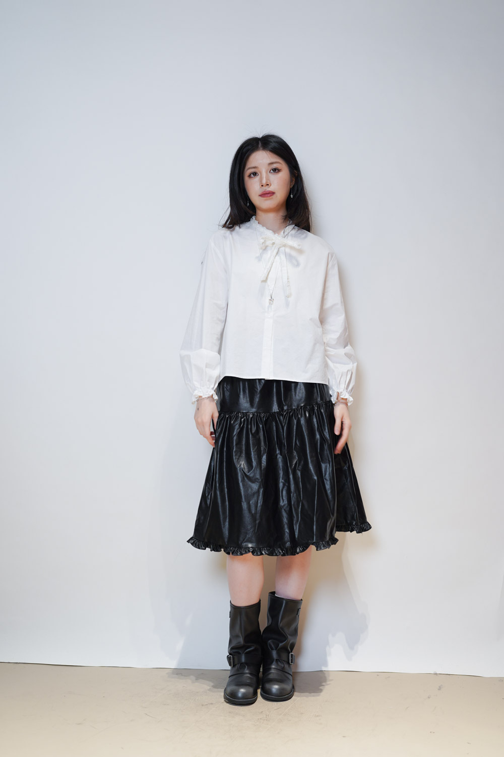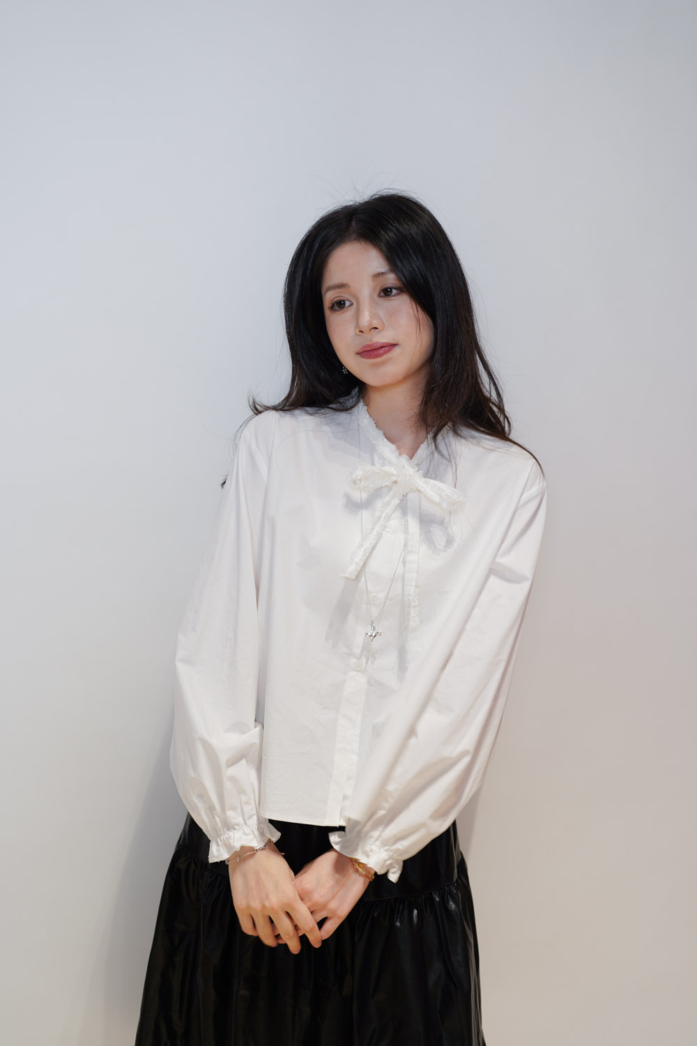 領口ruffle邊長帶設計 可綁蝴蝶結也可隨意垂於領口前/