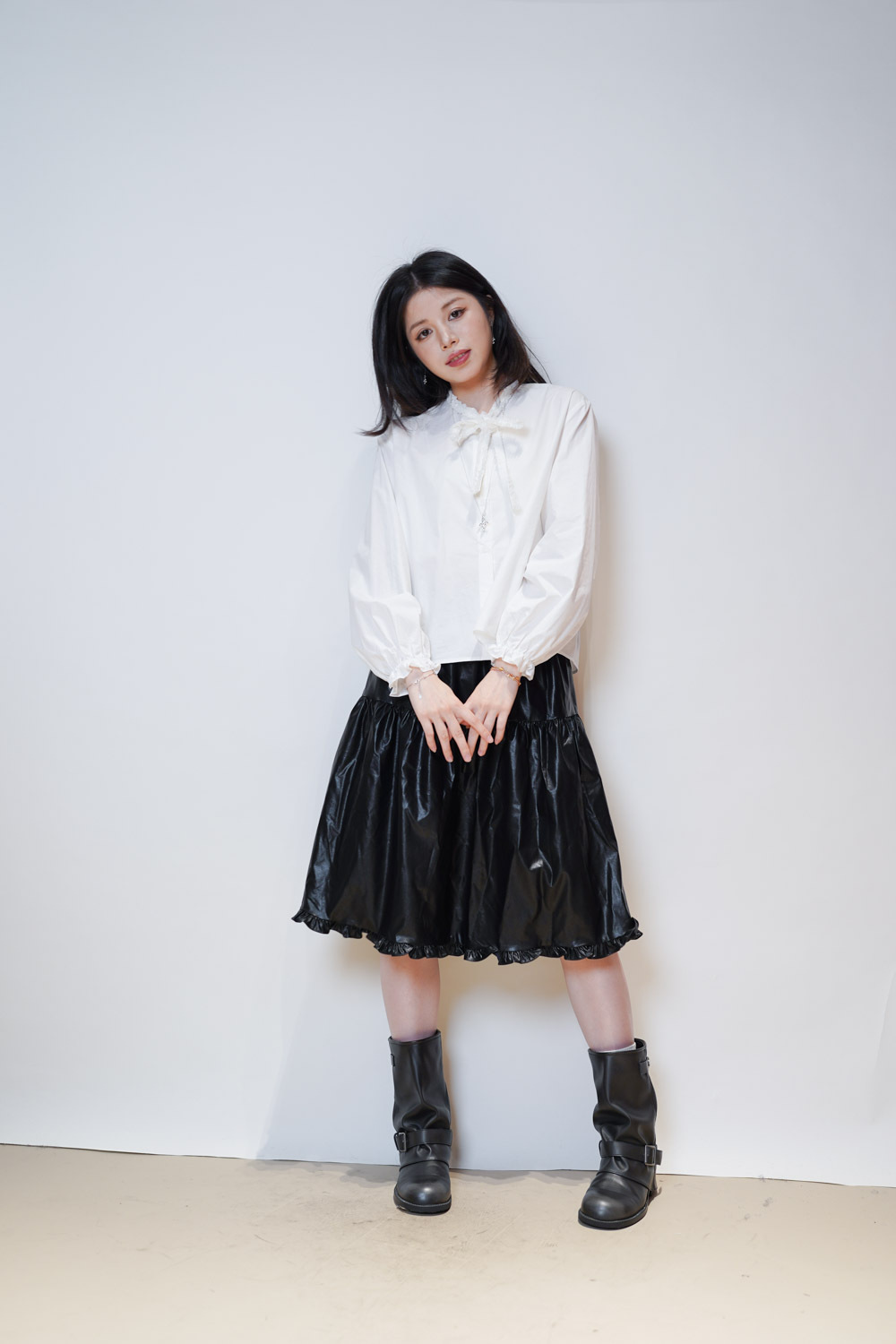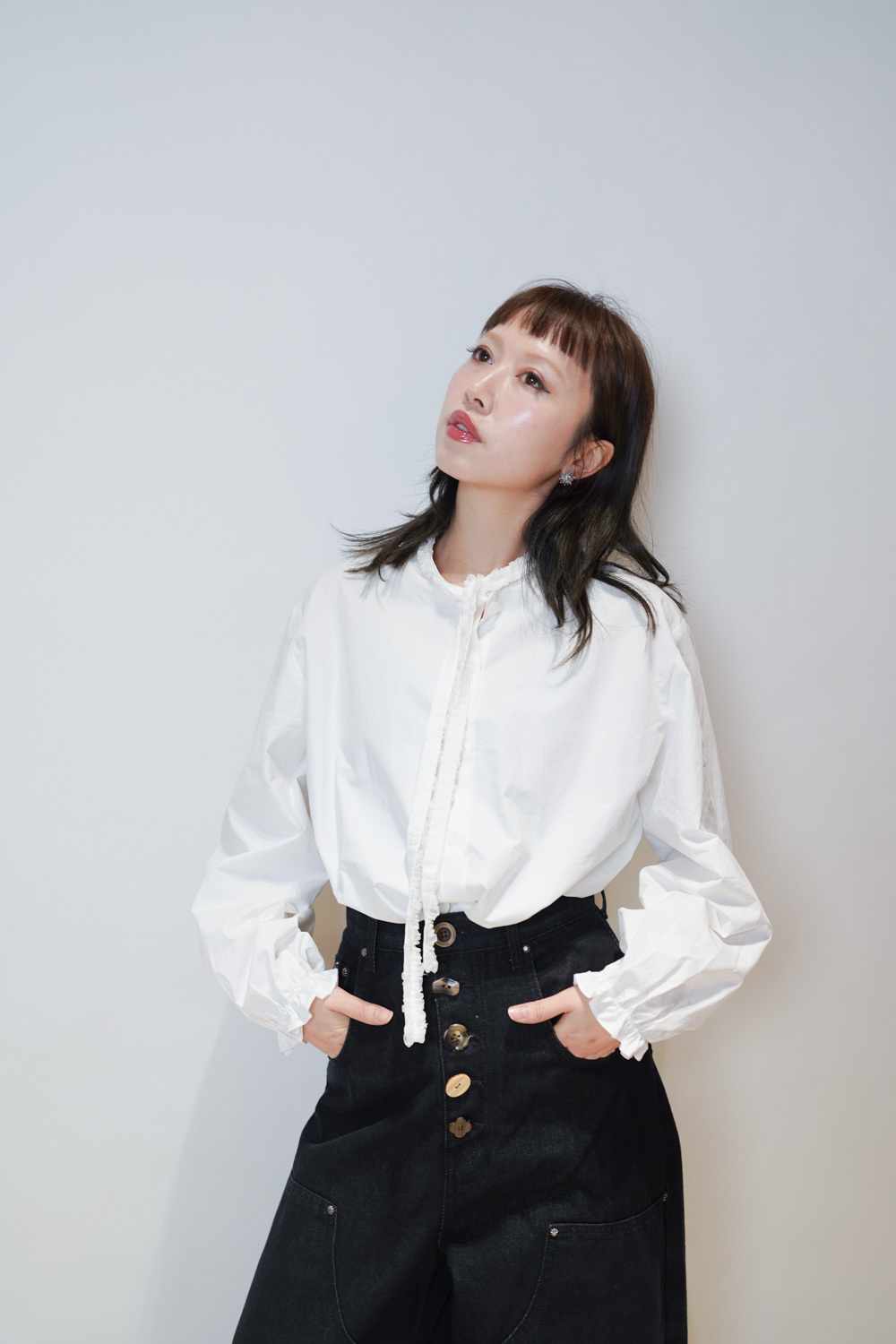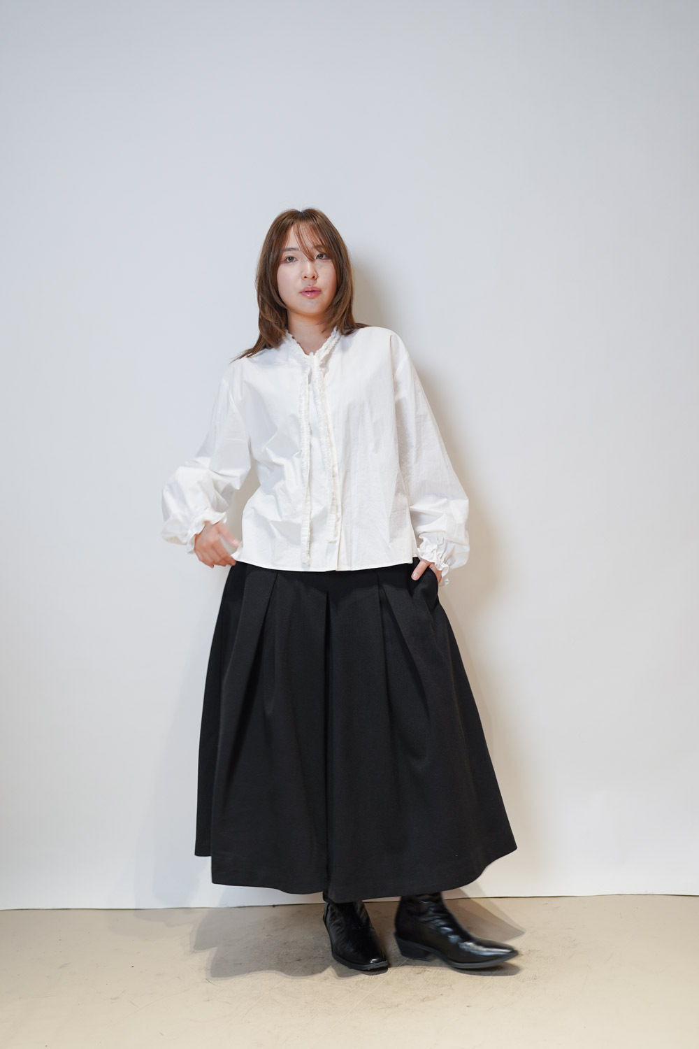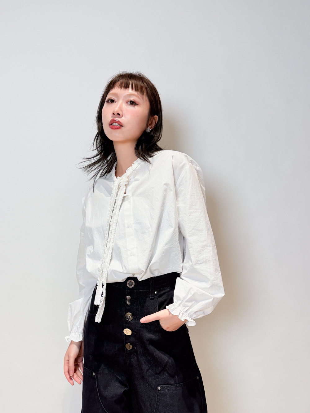 領口ruffle邊長帶設計 可綁蝴蝶結也可隨意垂於領口前/
