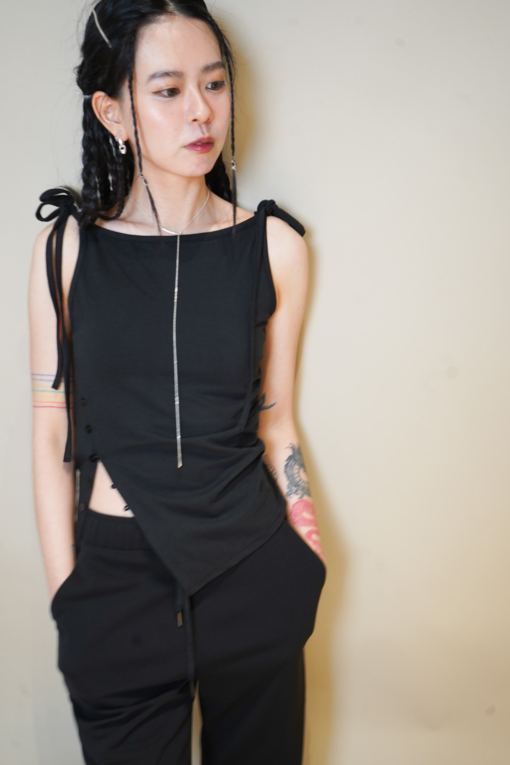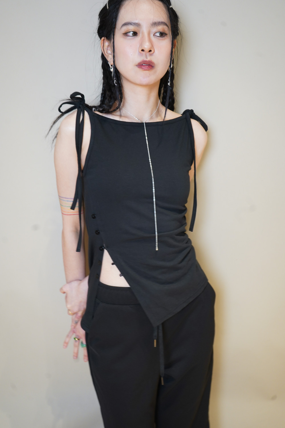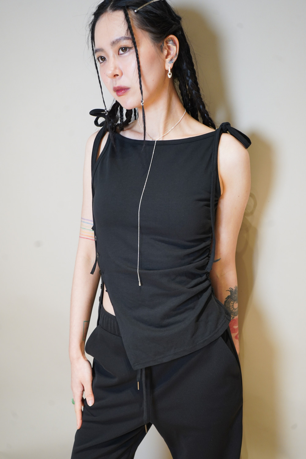 Side cut button tank top (WHITE/ BLACK)