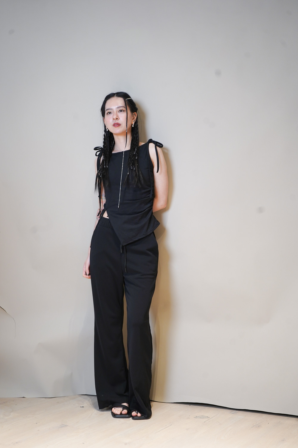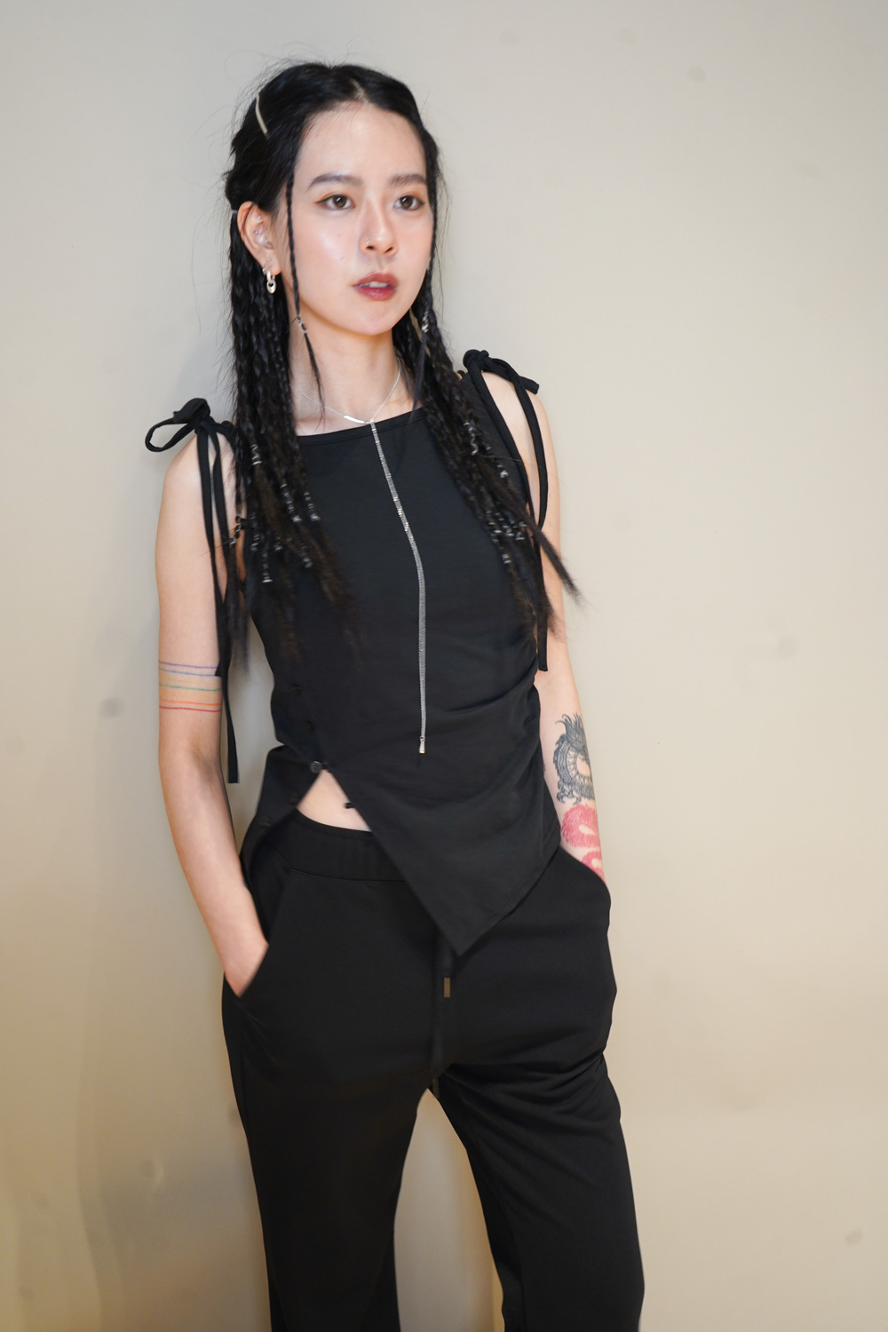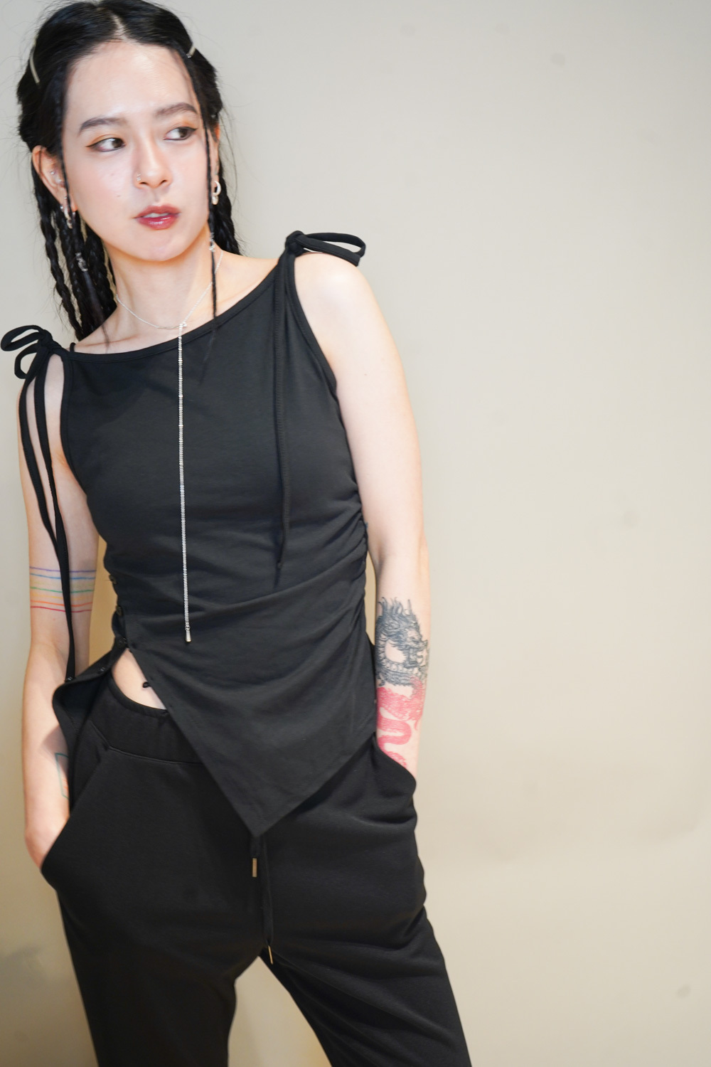 Side cut button tank top (WHITE/ BLACK)