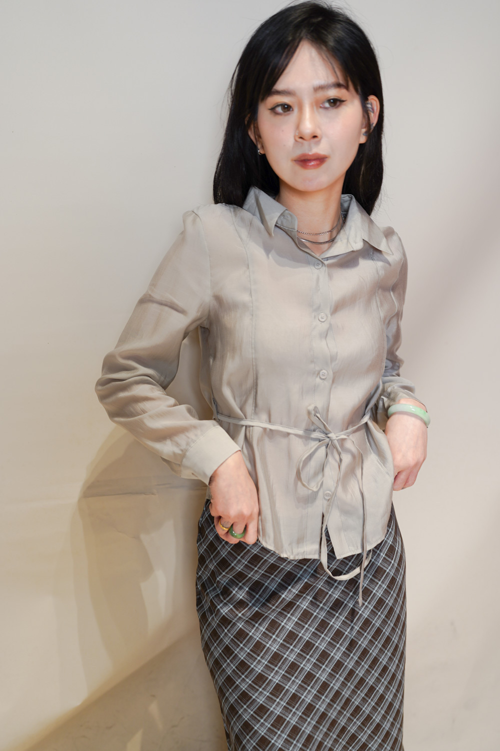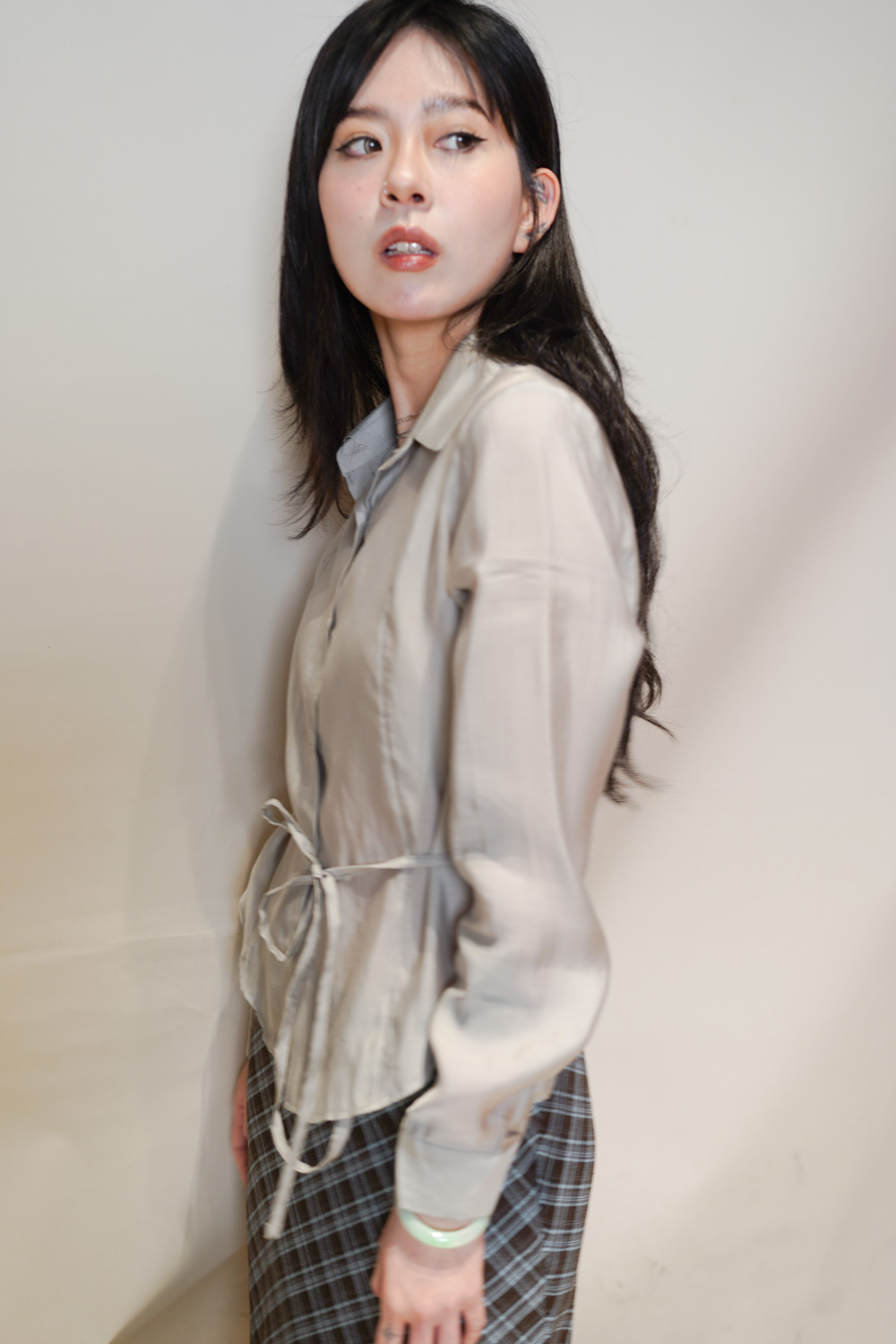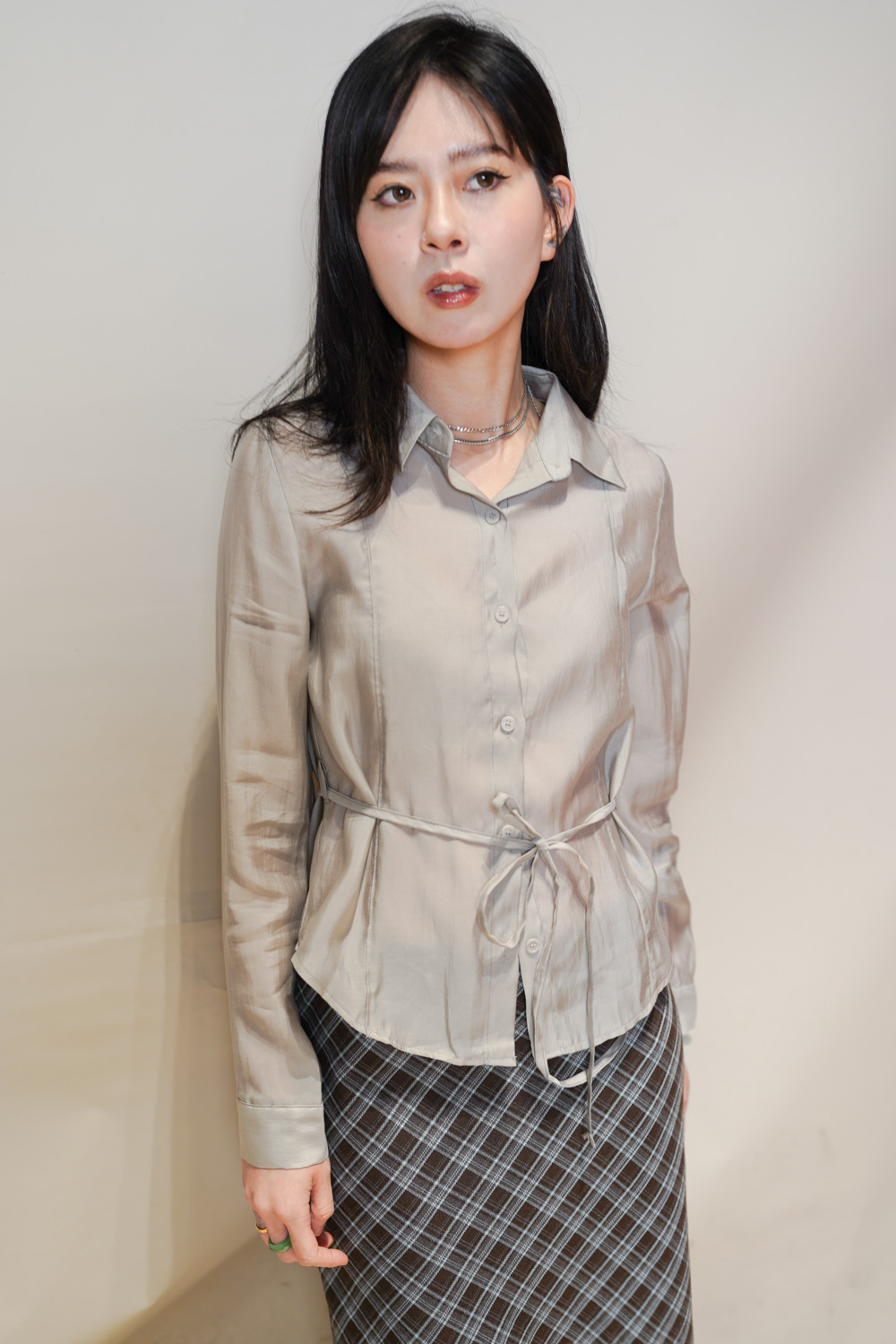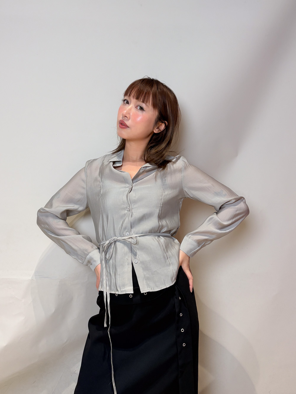 Side seam sheer shirt with waist belt (IVORY/GREY/BROWN)