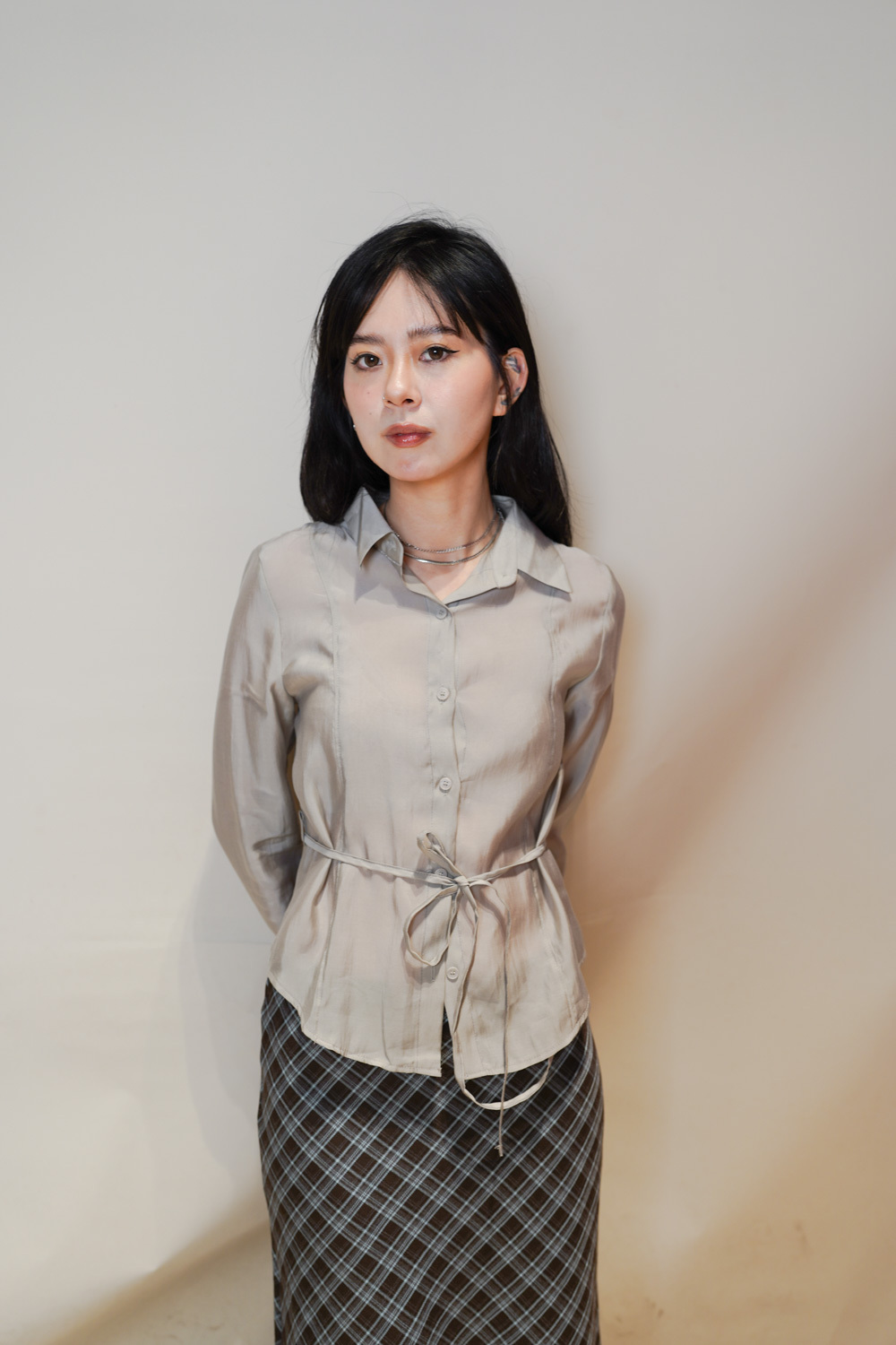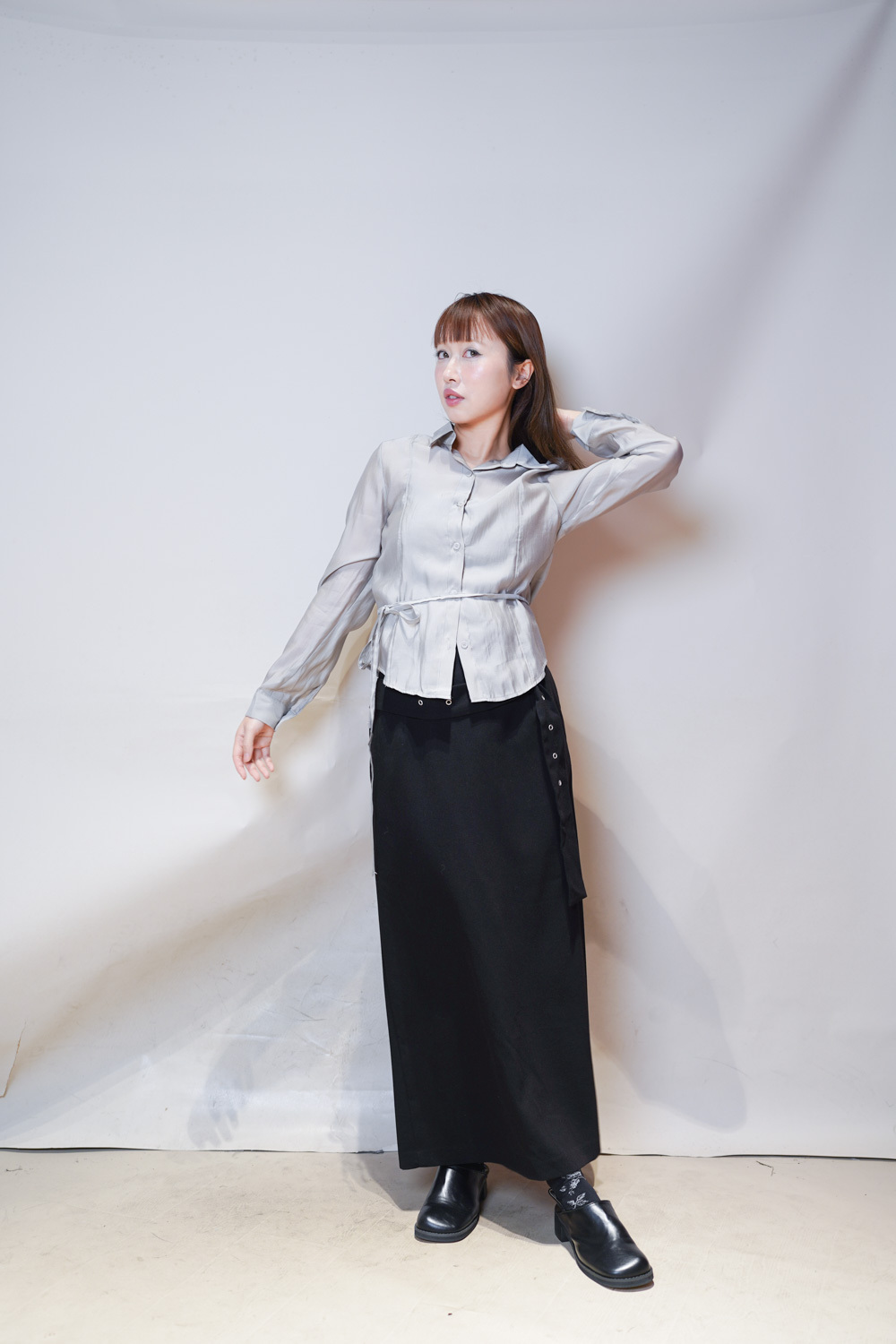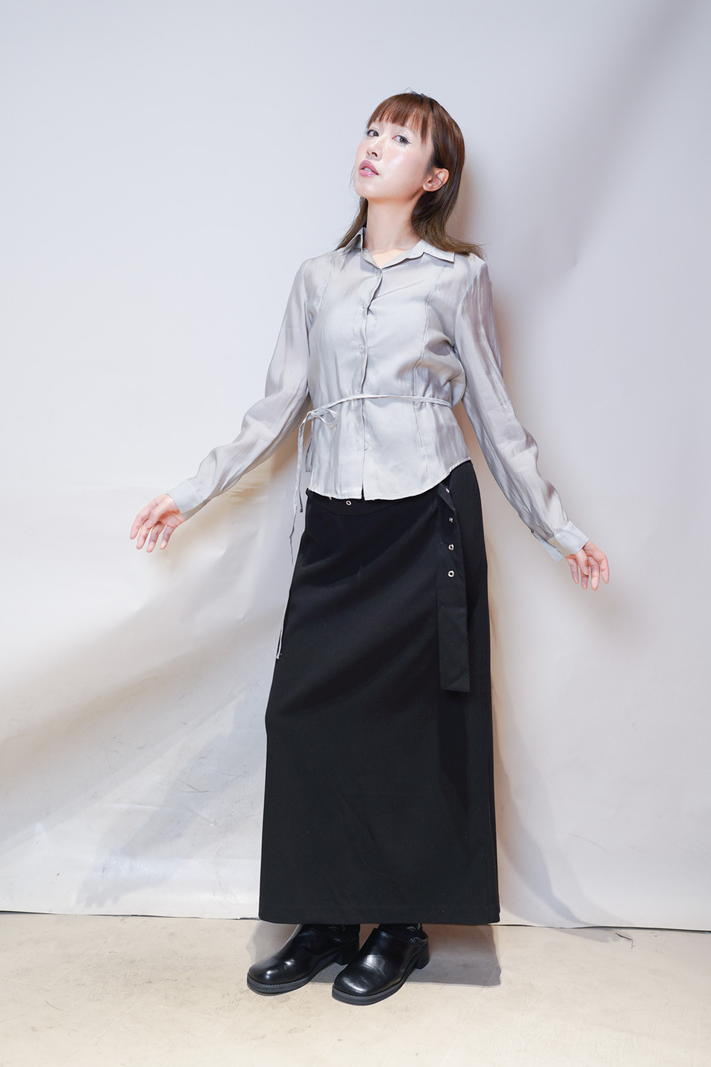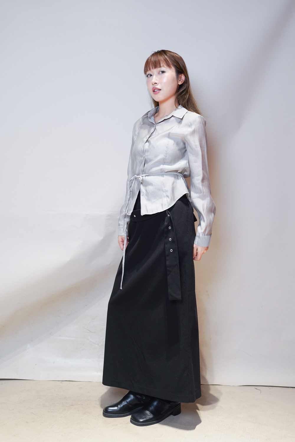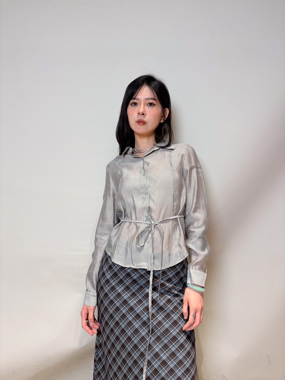 Side seam sheer shirt with waist belt (IVORY/GREY/BROWN)