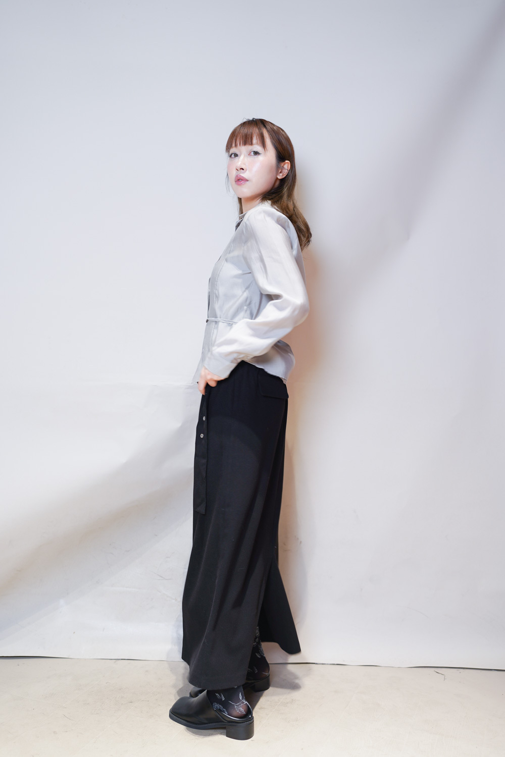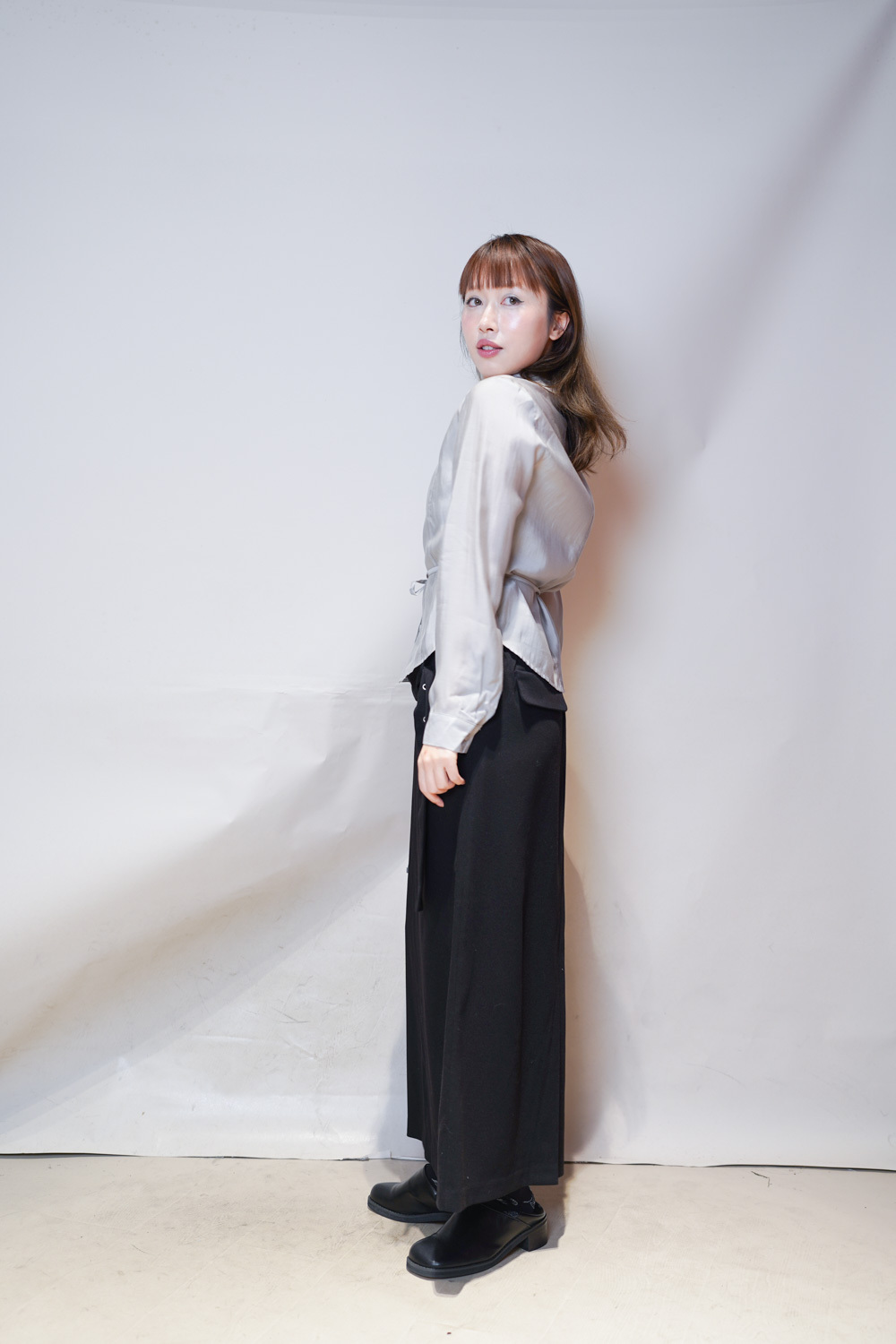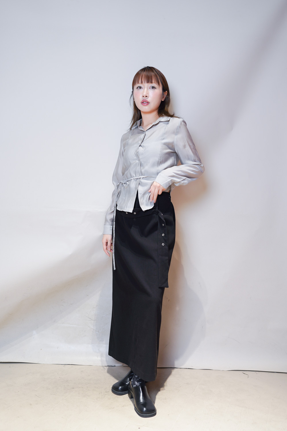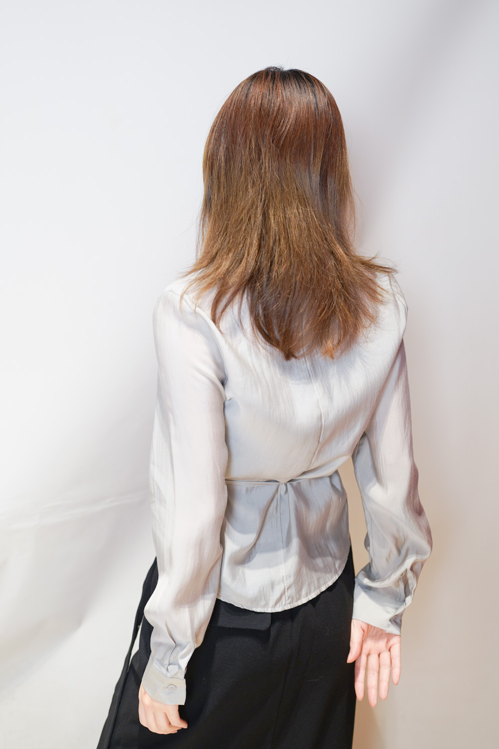 Side seam sheer shirt with waist belt (IVORY/GREY/BROWN)