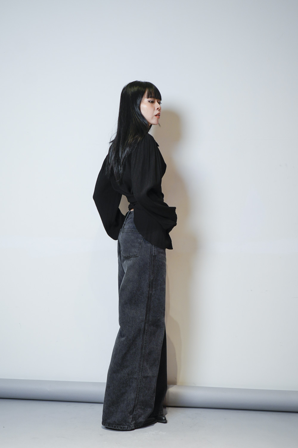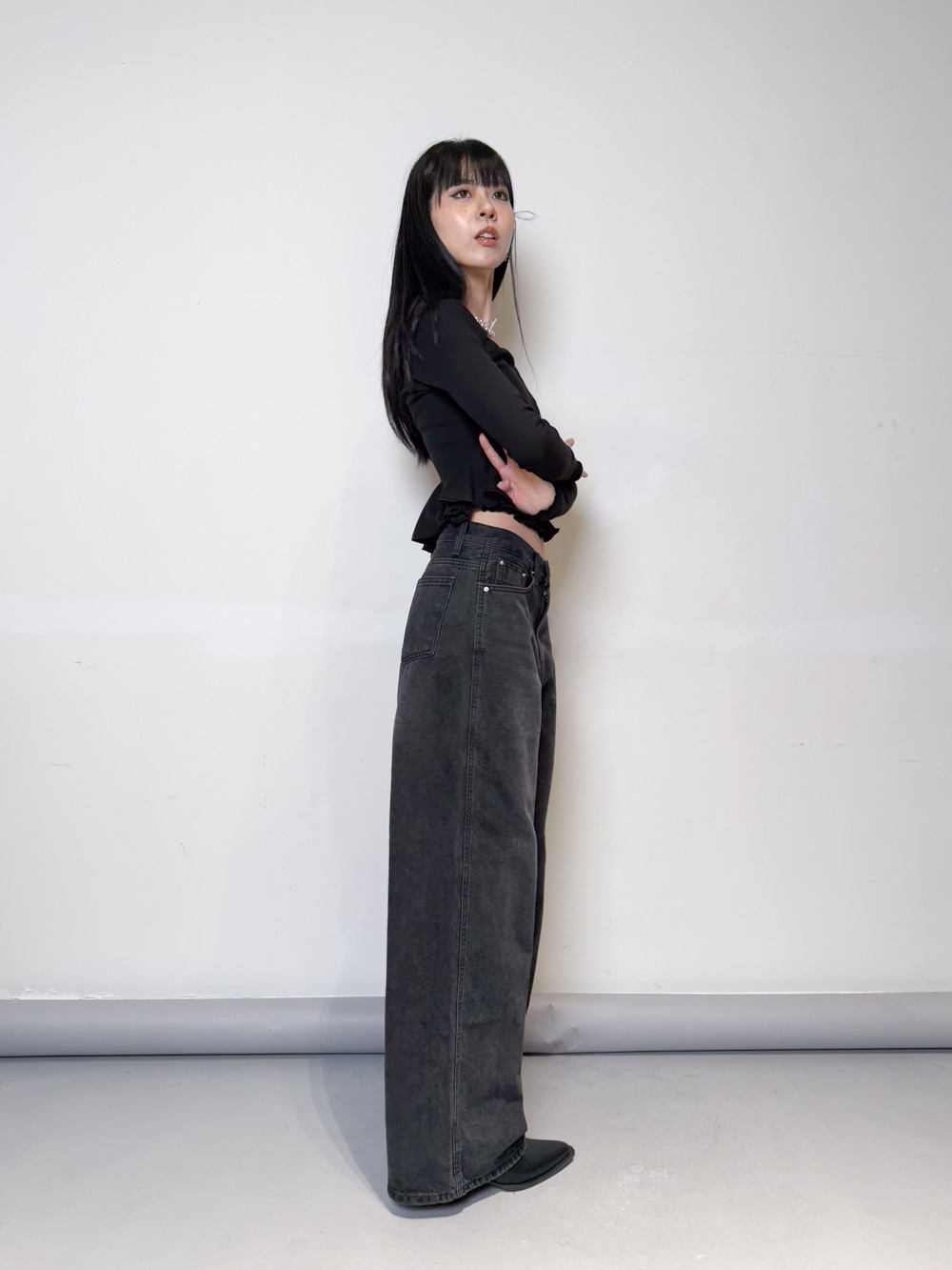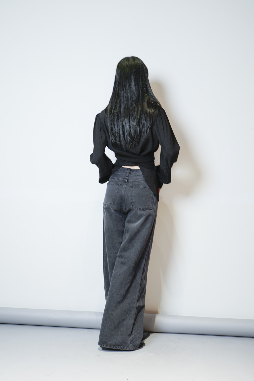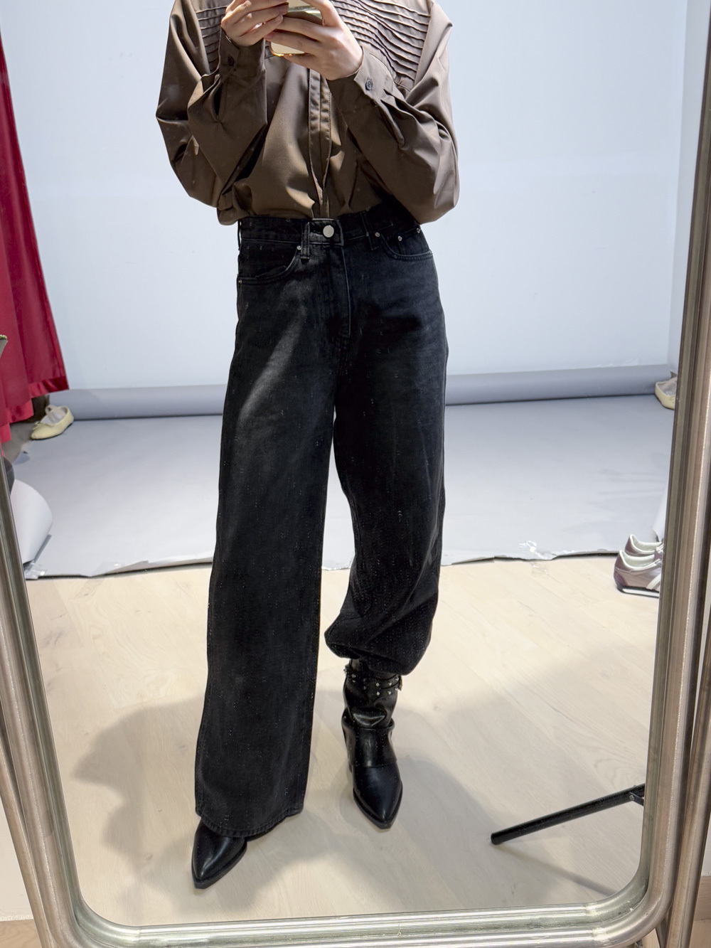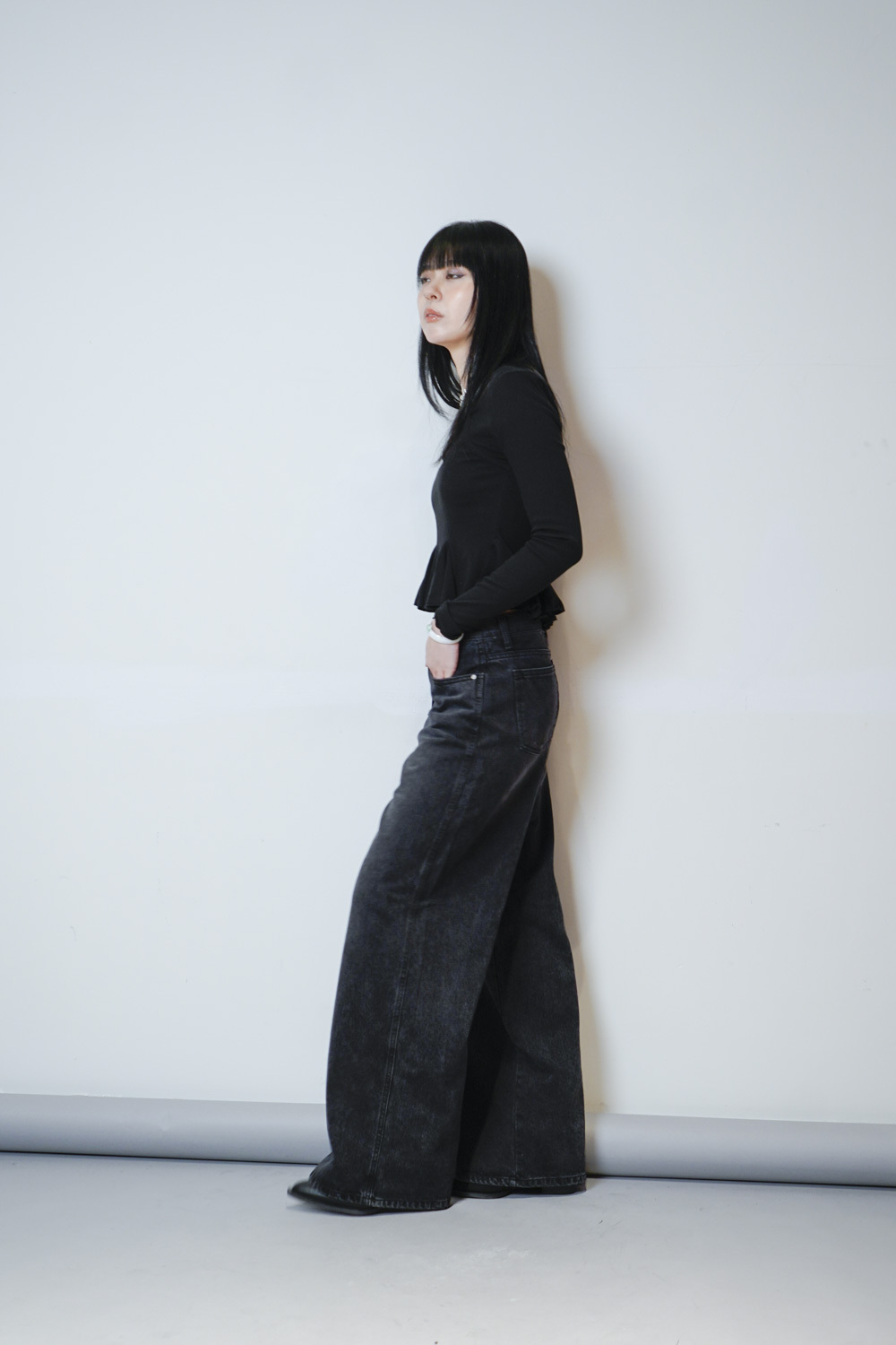 L: Waist: 74cm (29.5”) / Hip: 110cm (43”) / Rise:34cm / Length: 103.5cm / Thigh: 68cm / Hem: 60cm