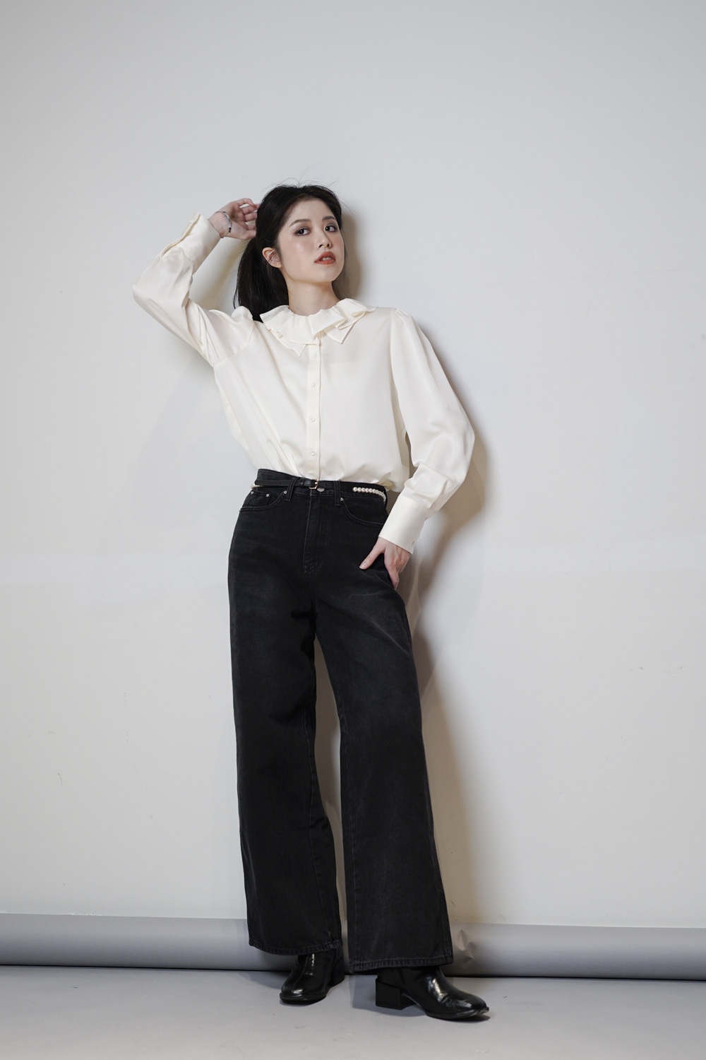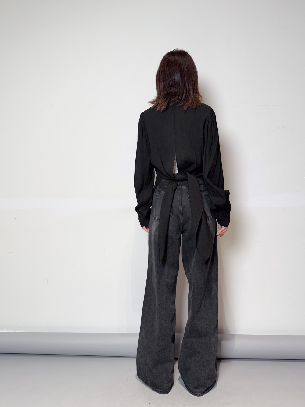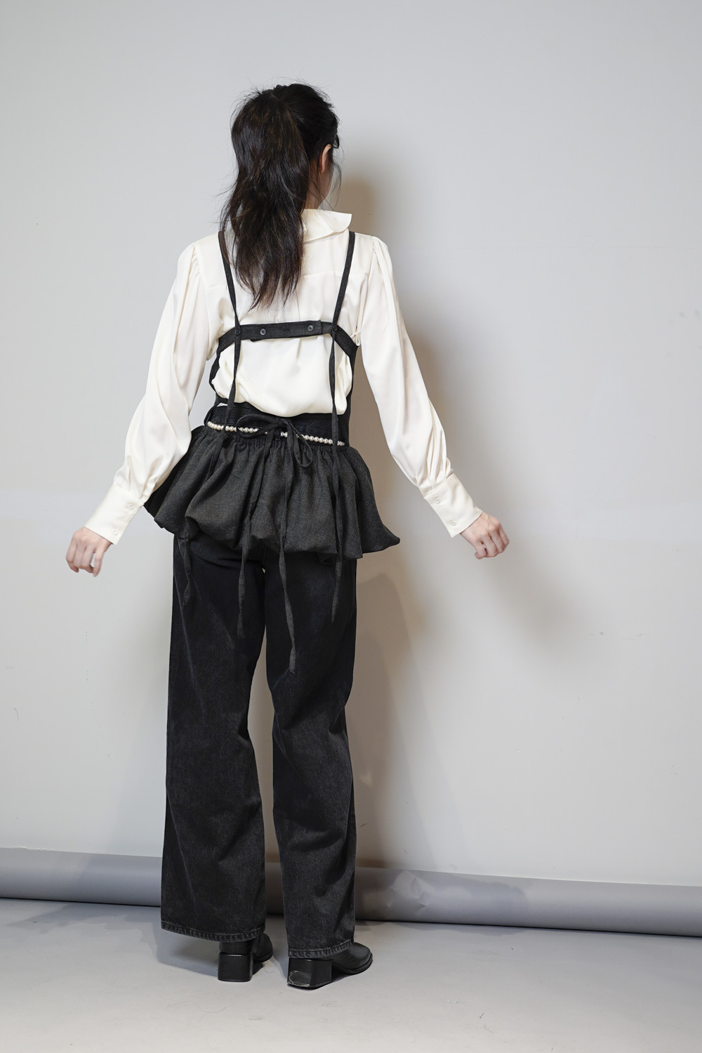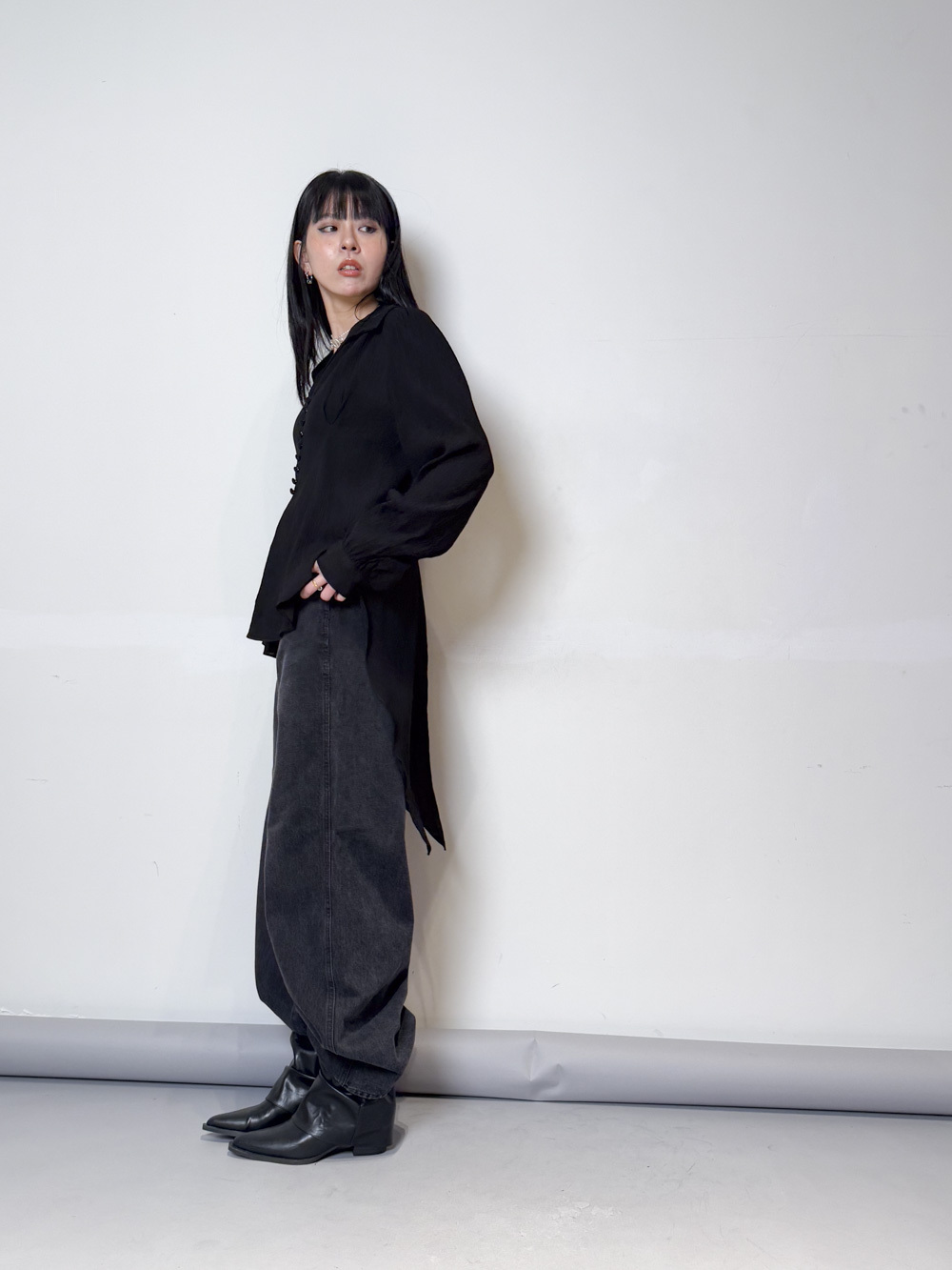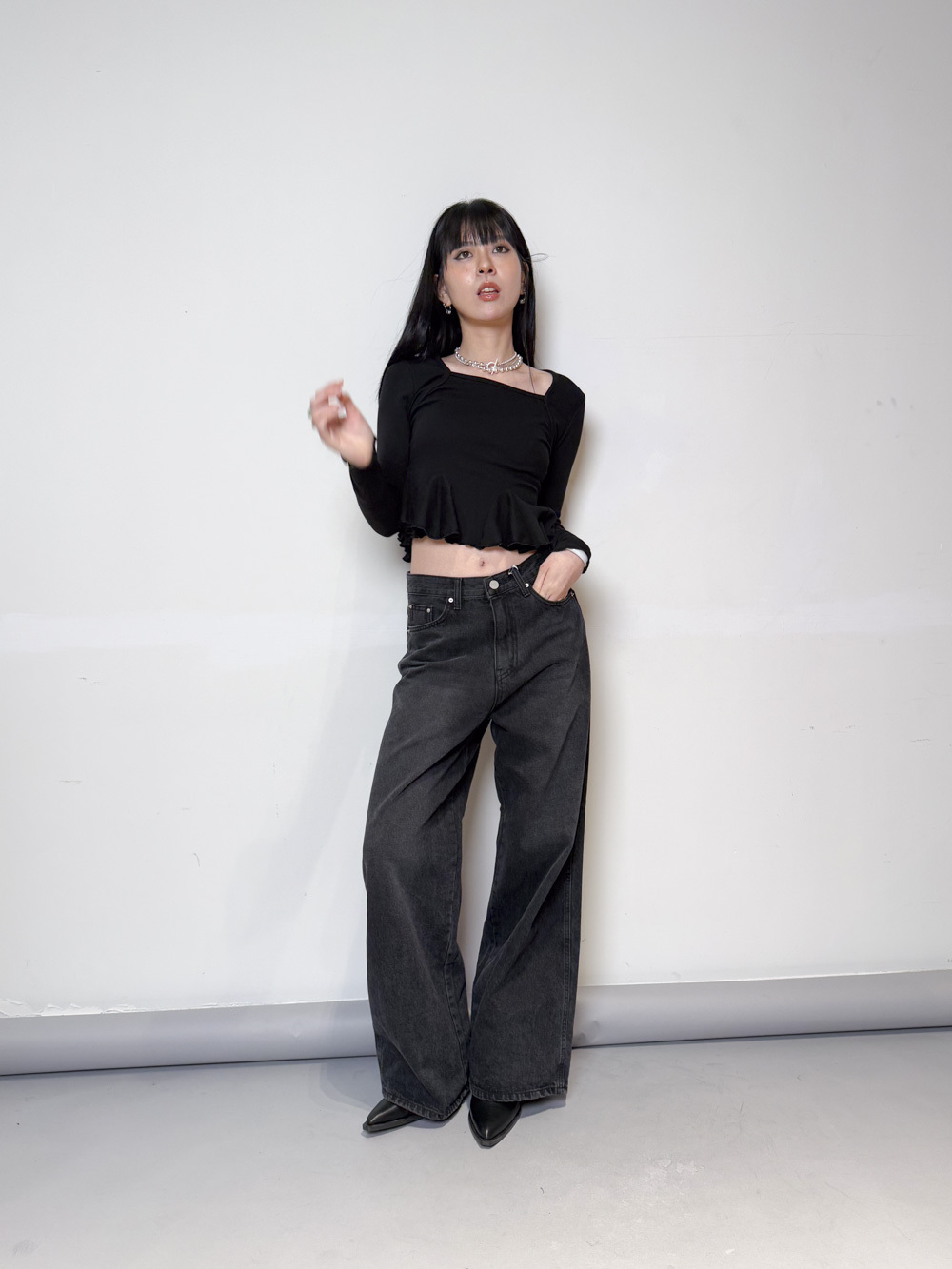 L: Waist: 74cm (29.5”) / Hip: 110cm (43”) / Rise:34cm / Length: 103.5cm / Thigh: 68cm / Hem: 60cm