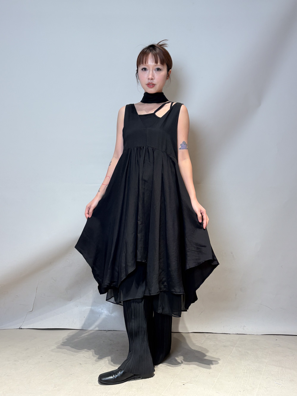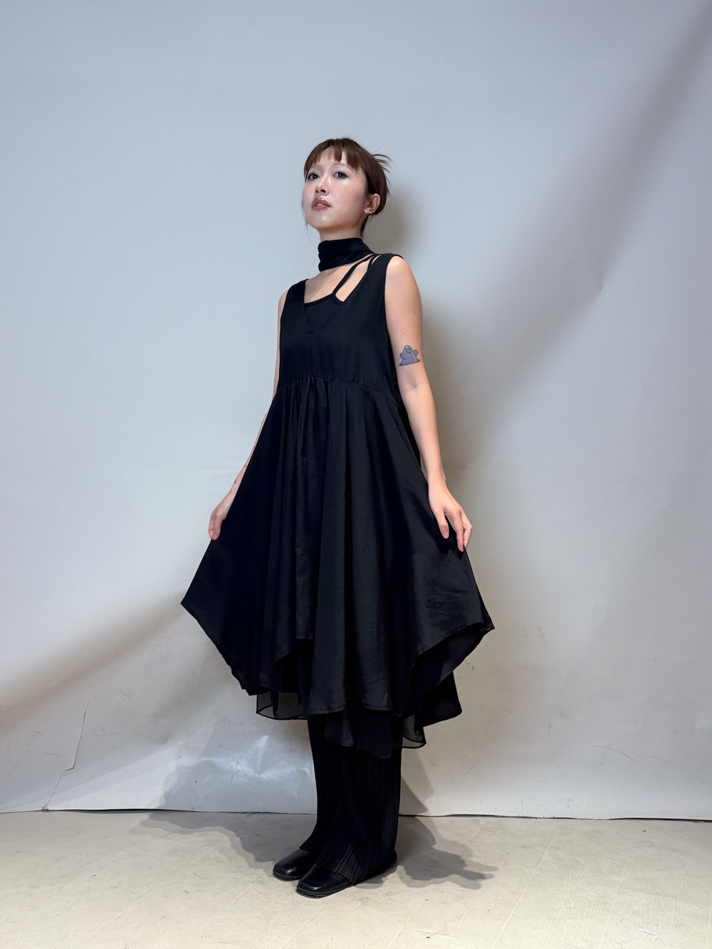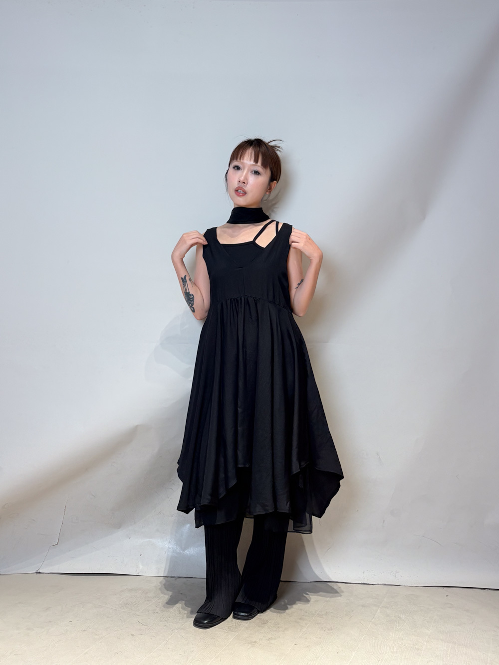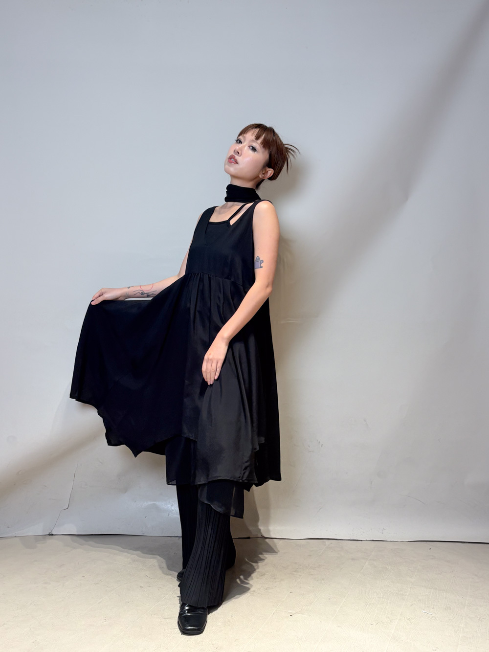 ③ 寬鬆無袖剪裁 腋下開口高度適中,內搭一件小背心(如 Model 示範的淺灰色) 就能穿出層次感,同時保持清爽。
