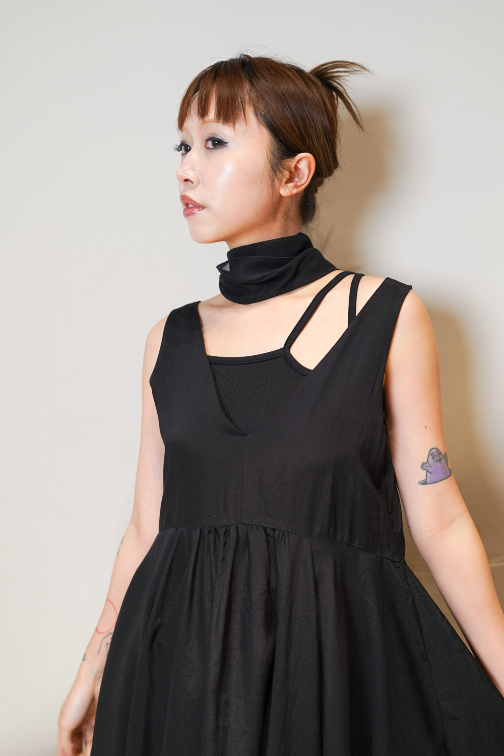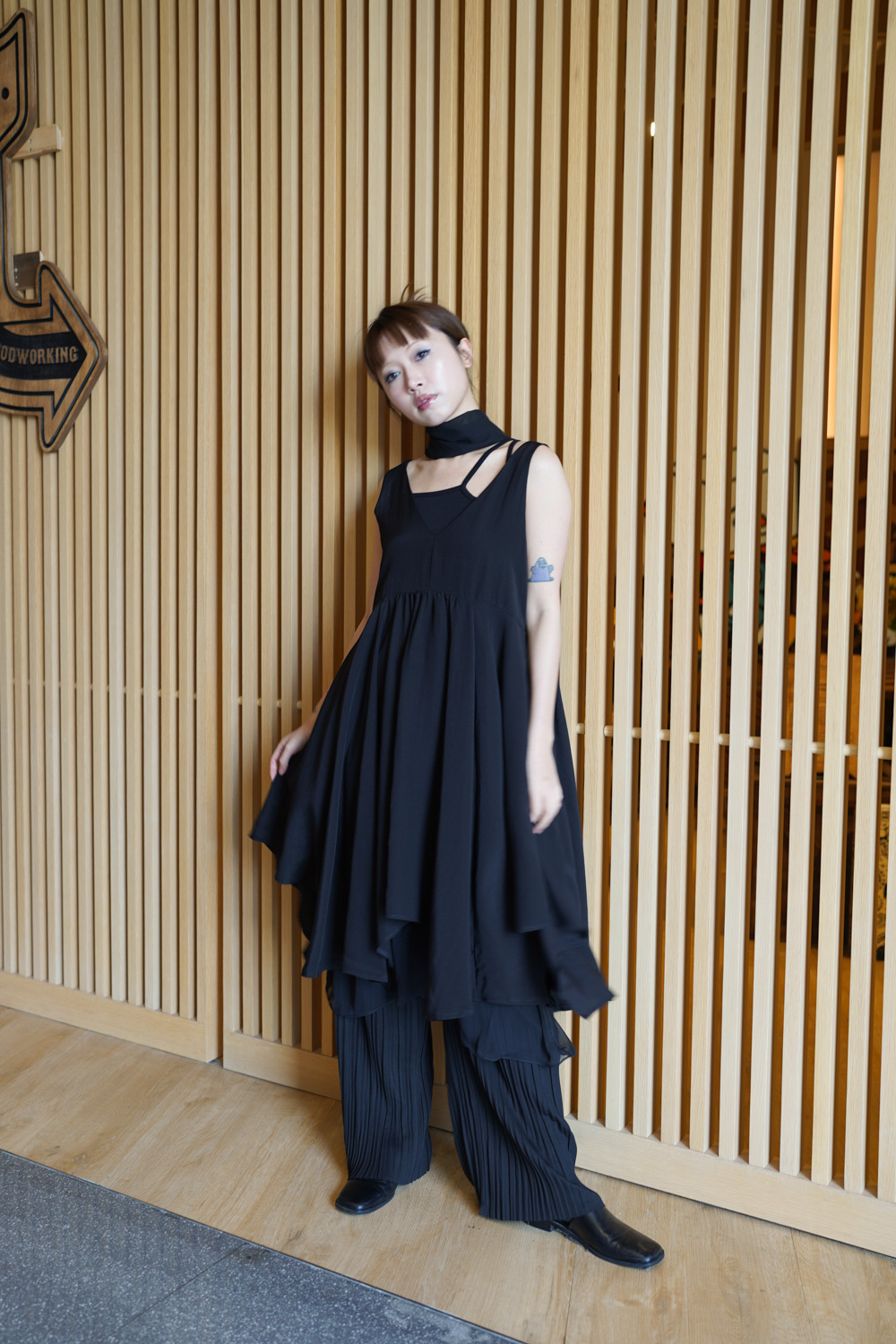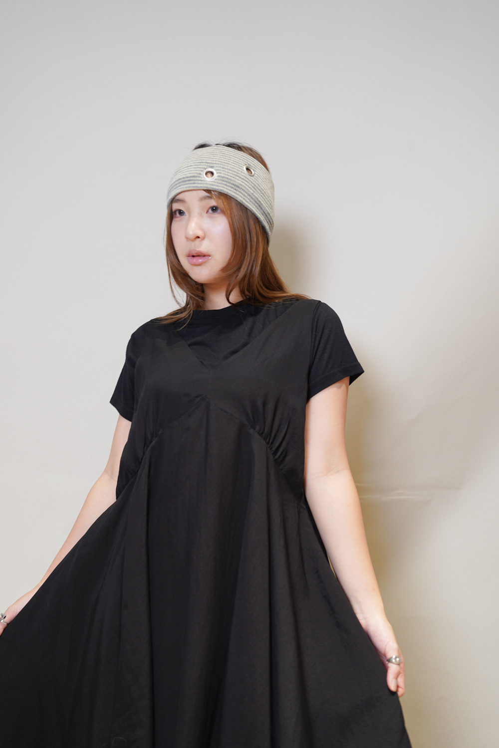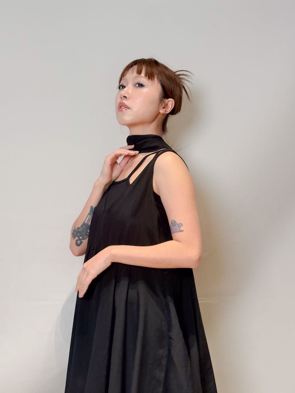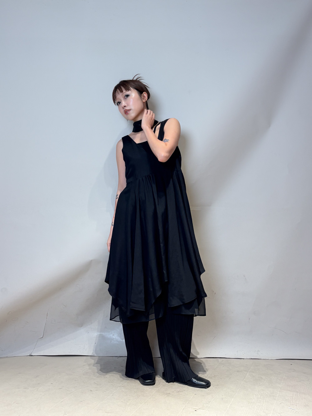 ③ 寬鬆無袖剪裁 腋下開口高度適中,內搭一件小背心(如 Model 示範的淺灰色) 就能穿出層次感,同時保持清爽。