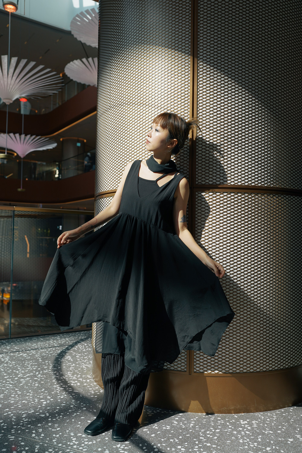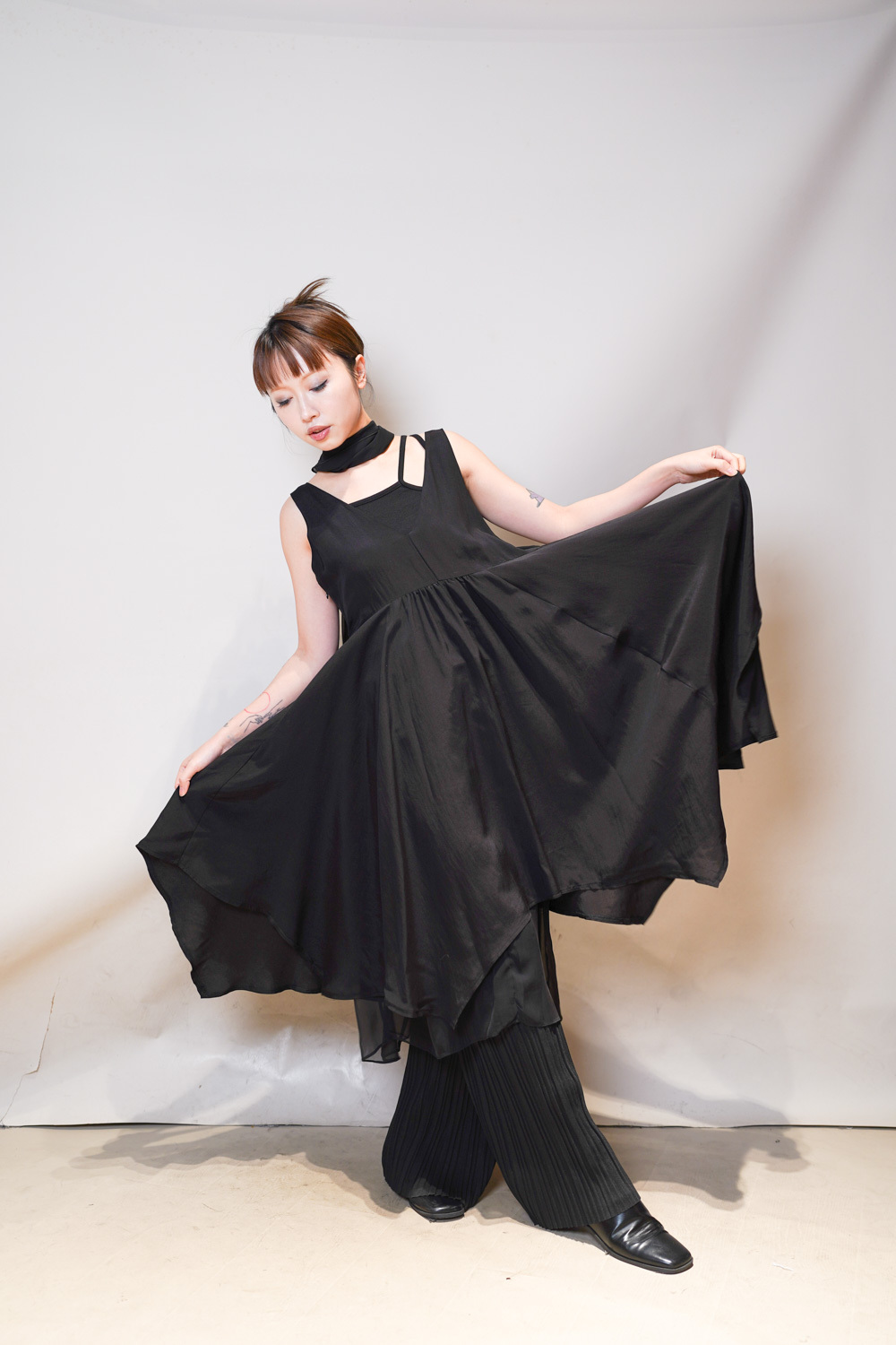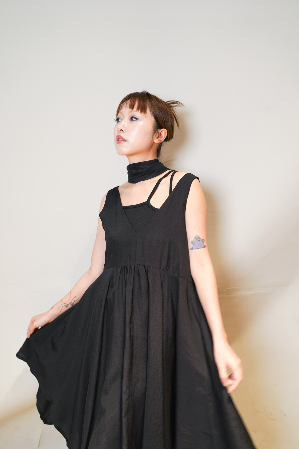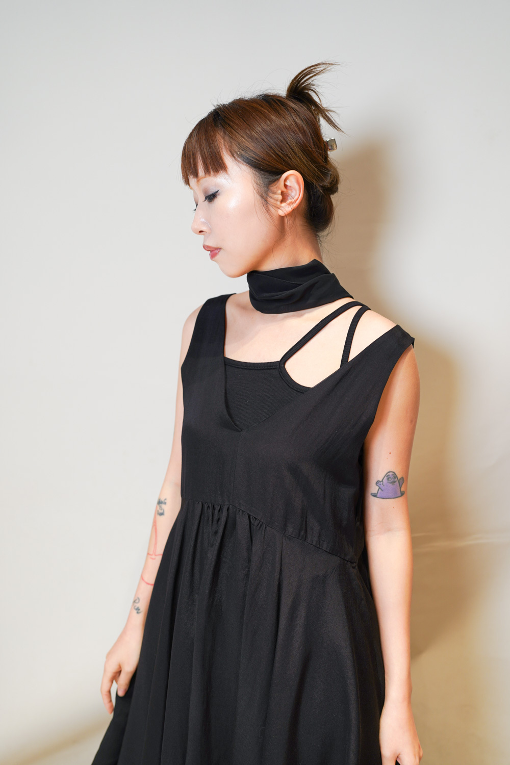 ③ 寬鬆無袖剪裁 腋下開口高度適中,內搭一件小背心(如 Model 示範的淺灰色) 就能穿出層次感,同時保持清爽。