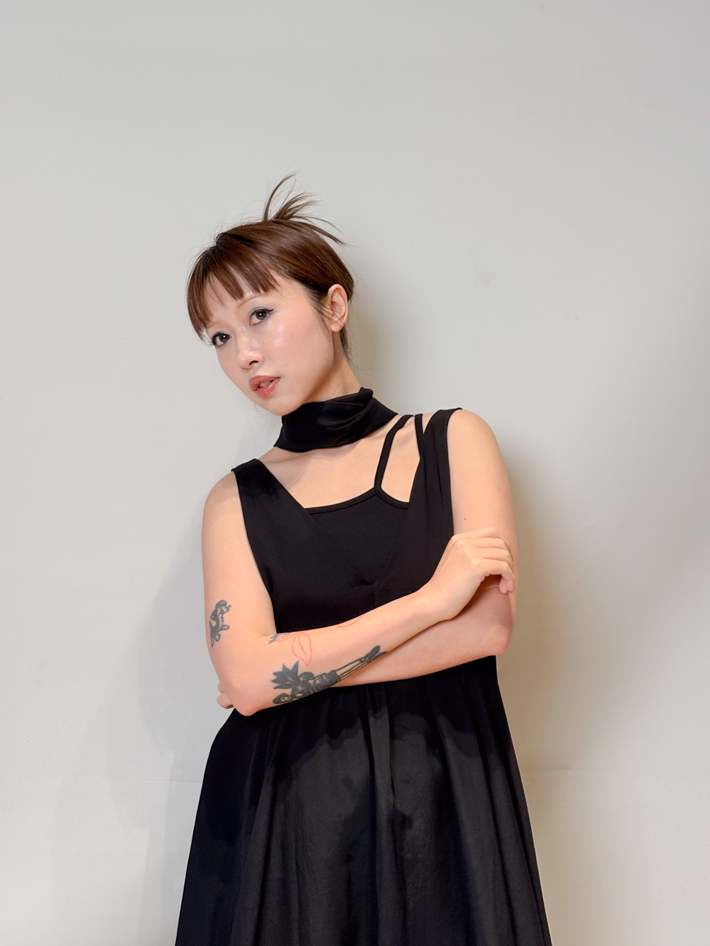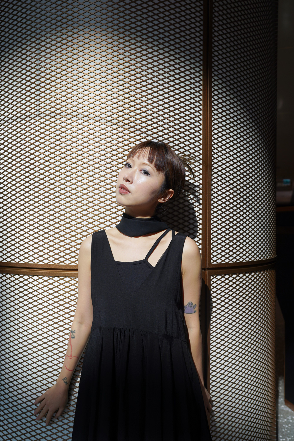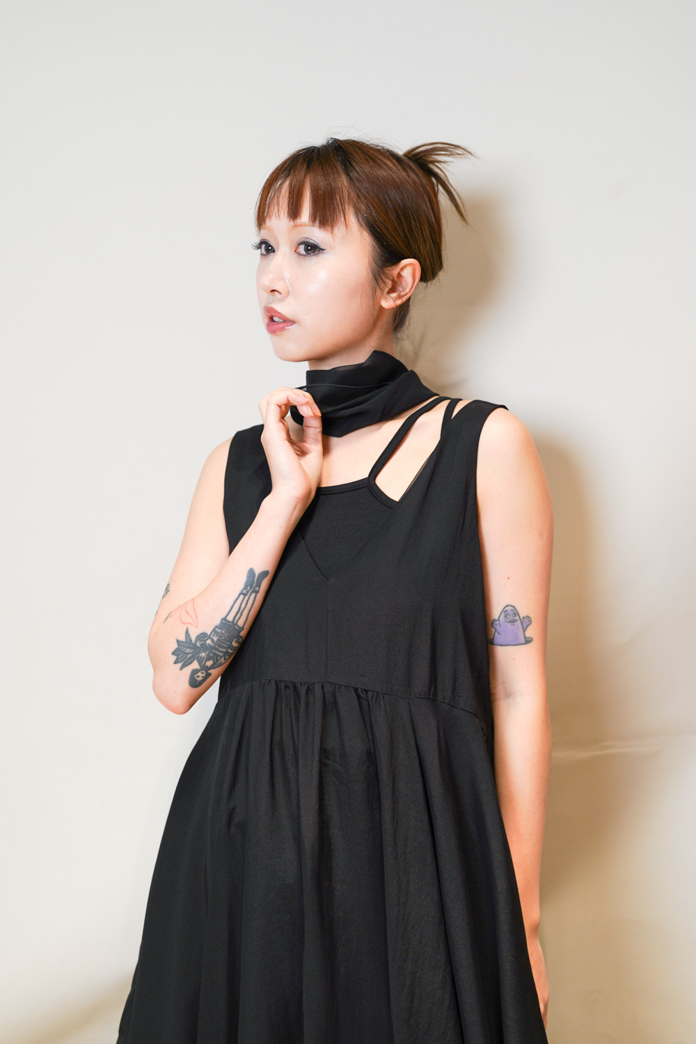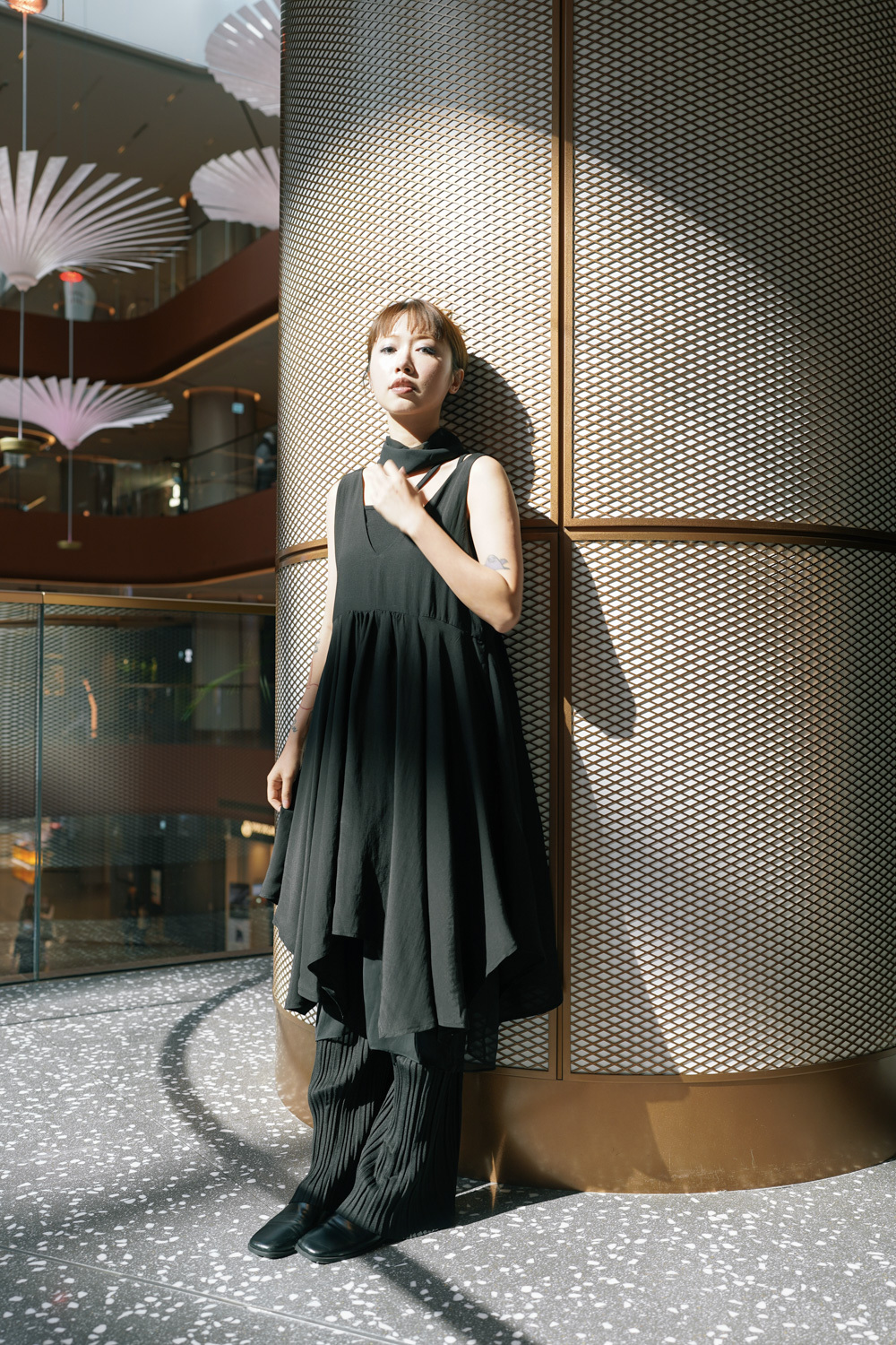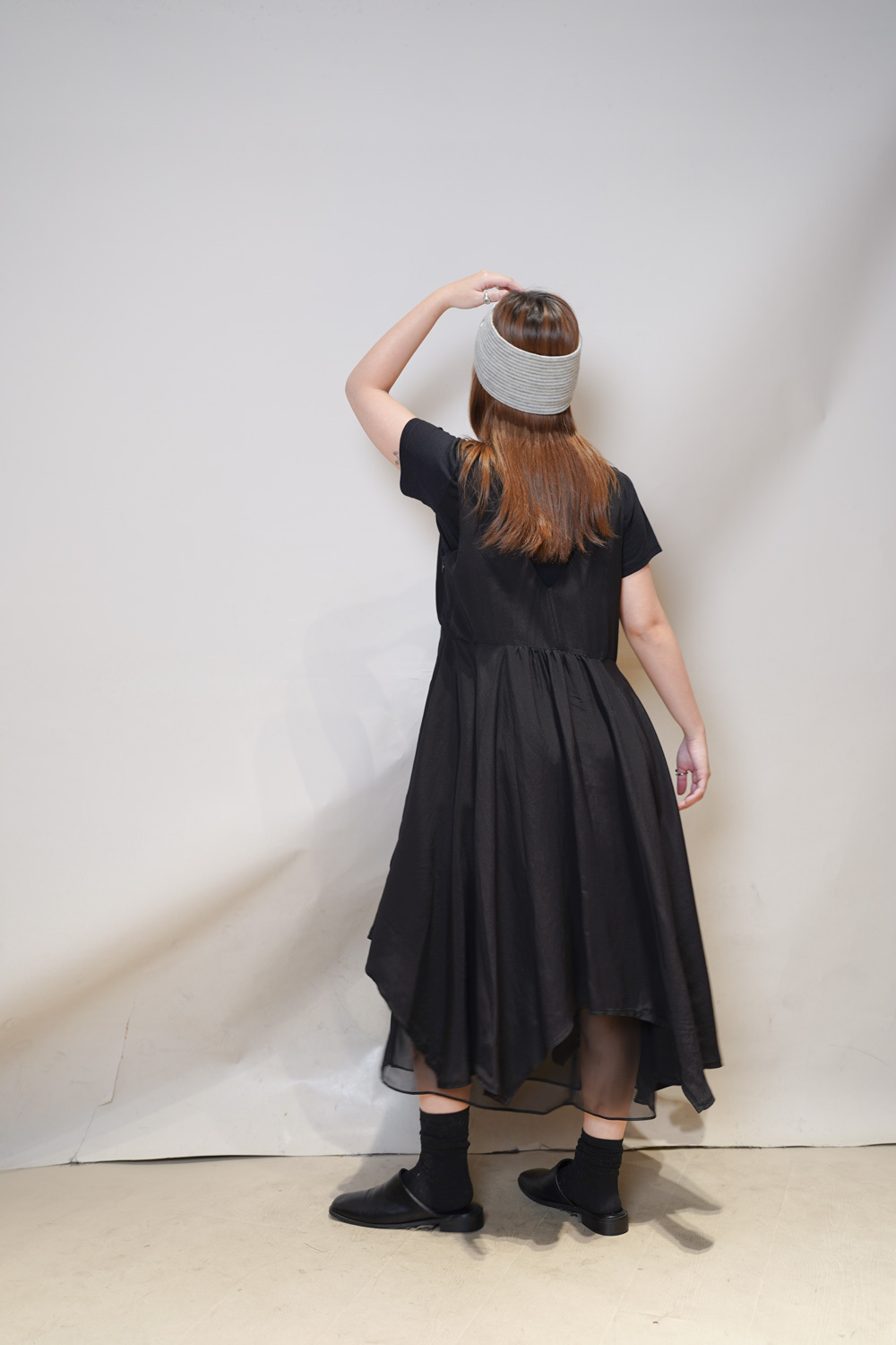 ③ 寬鬆無袖剪裁 腋下開口高度適中,內搭一件小背心(如 Model 示範的淺灰色) 就能穿出層次感,同時保持清爽。