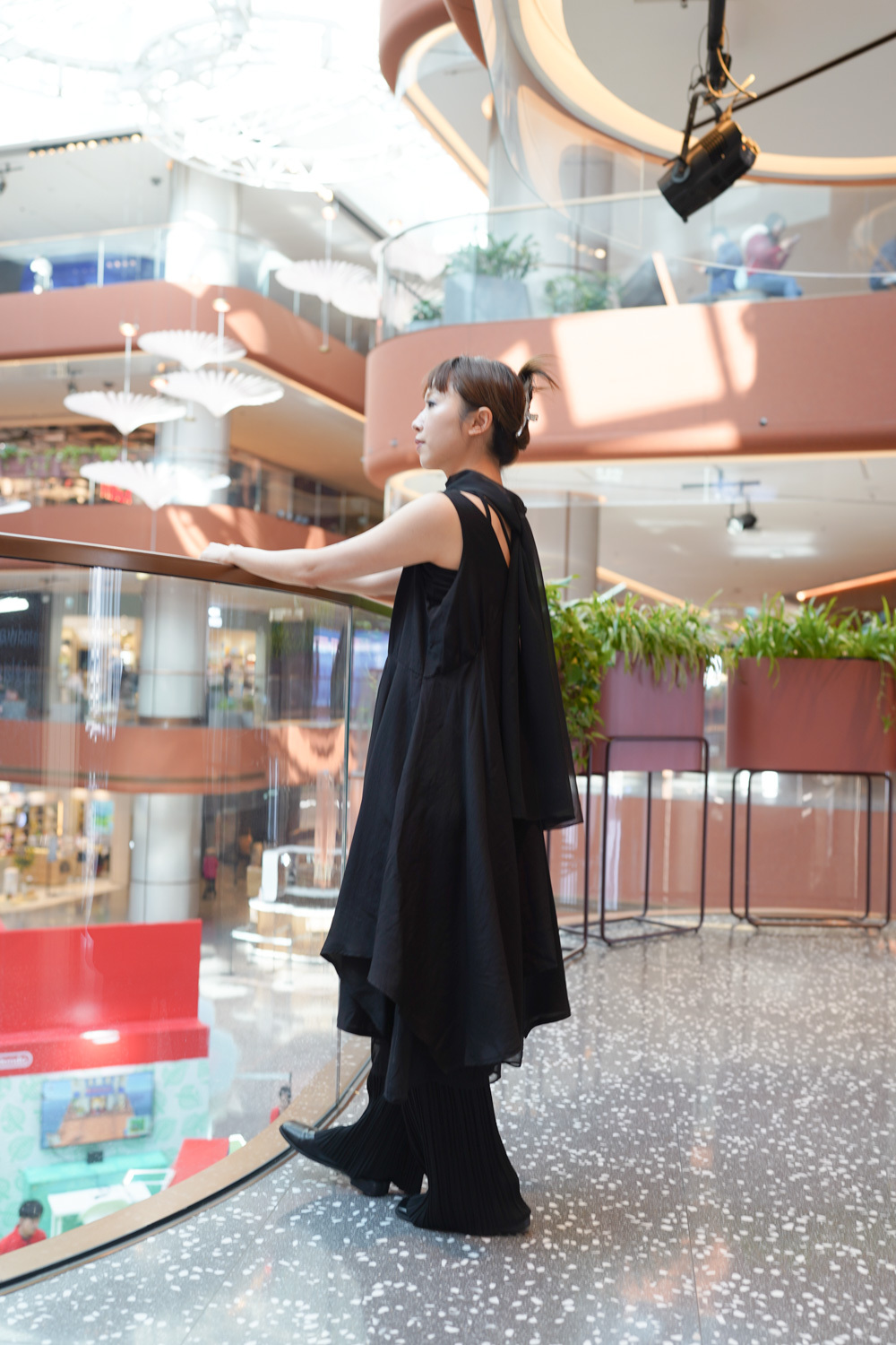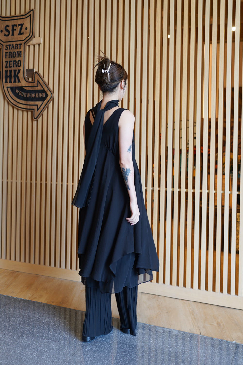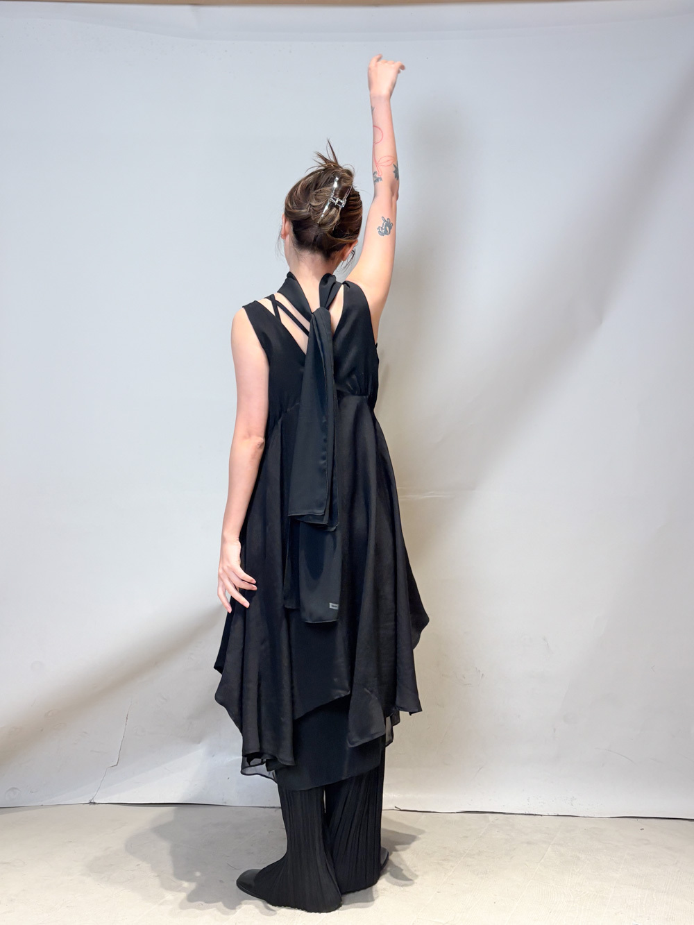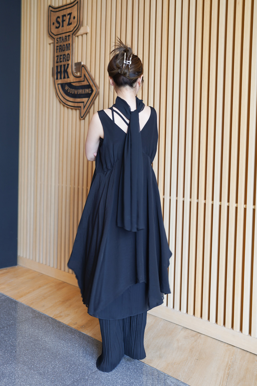 ③ 寬鬆無袖剪裁 腋下開口高度適中,內搭一件小背心(如 Model 示範的淺灰色) 就能穿出層次感,同時保持清爽。