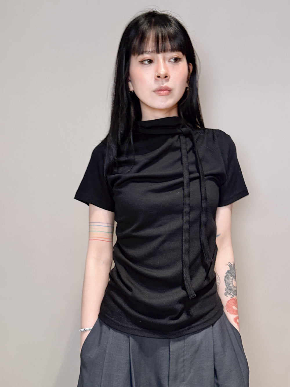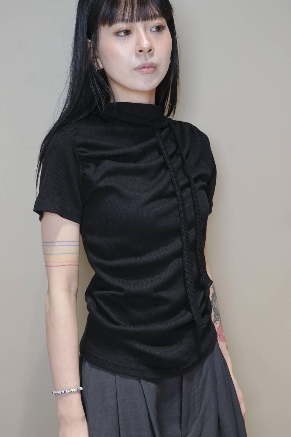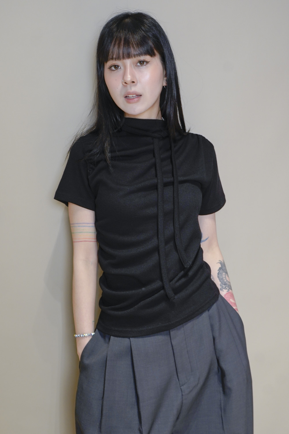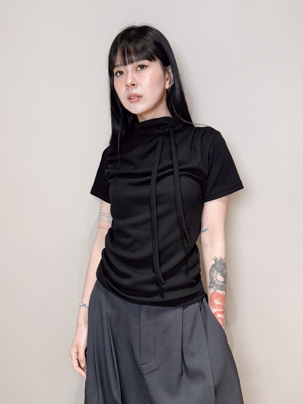 Stand Collar Tee With Thin Tie (BEIGE/ BLACK)