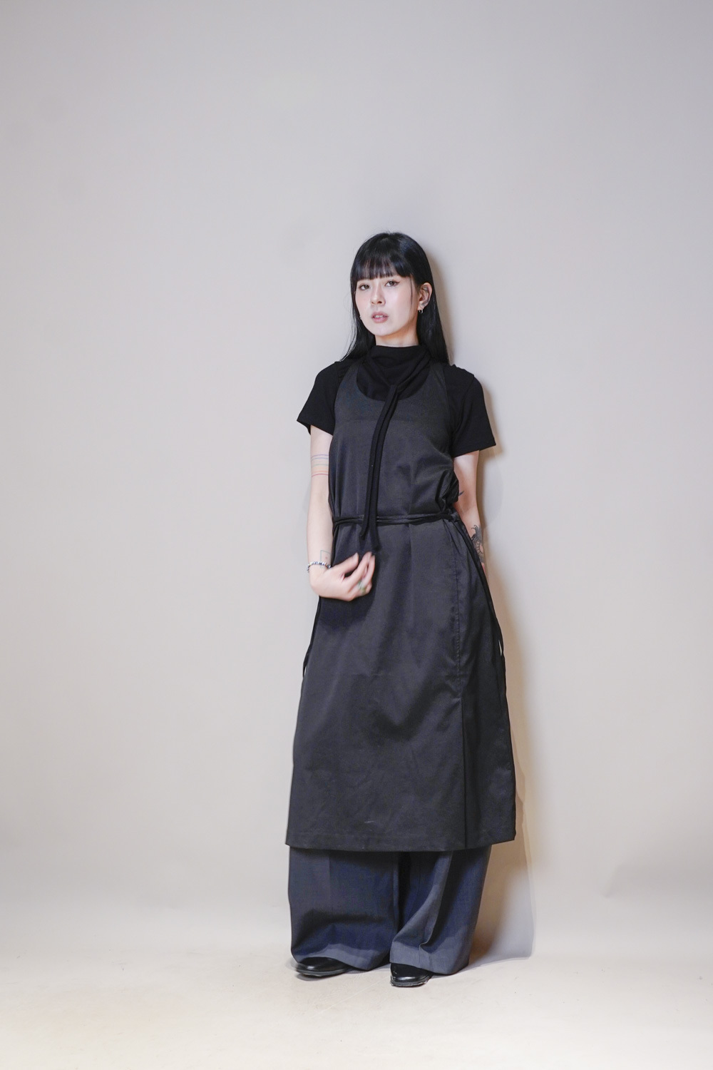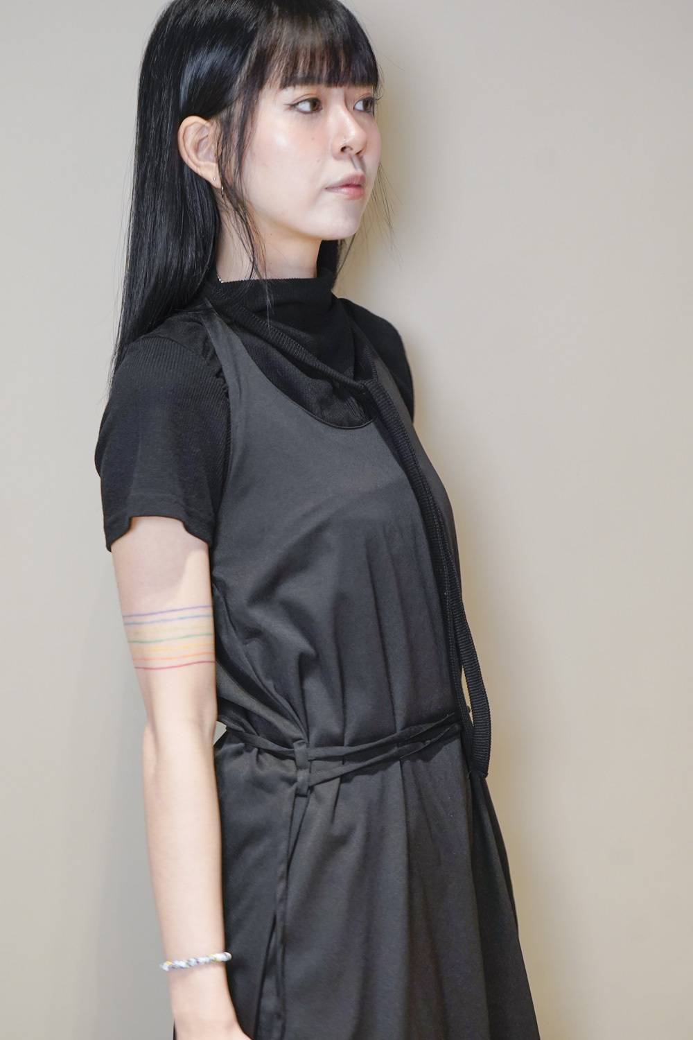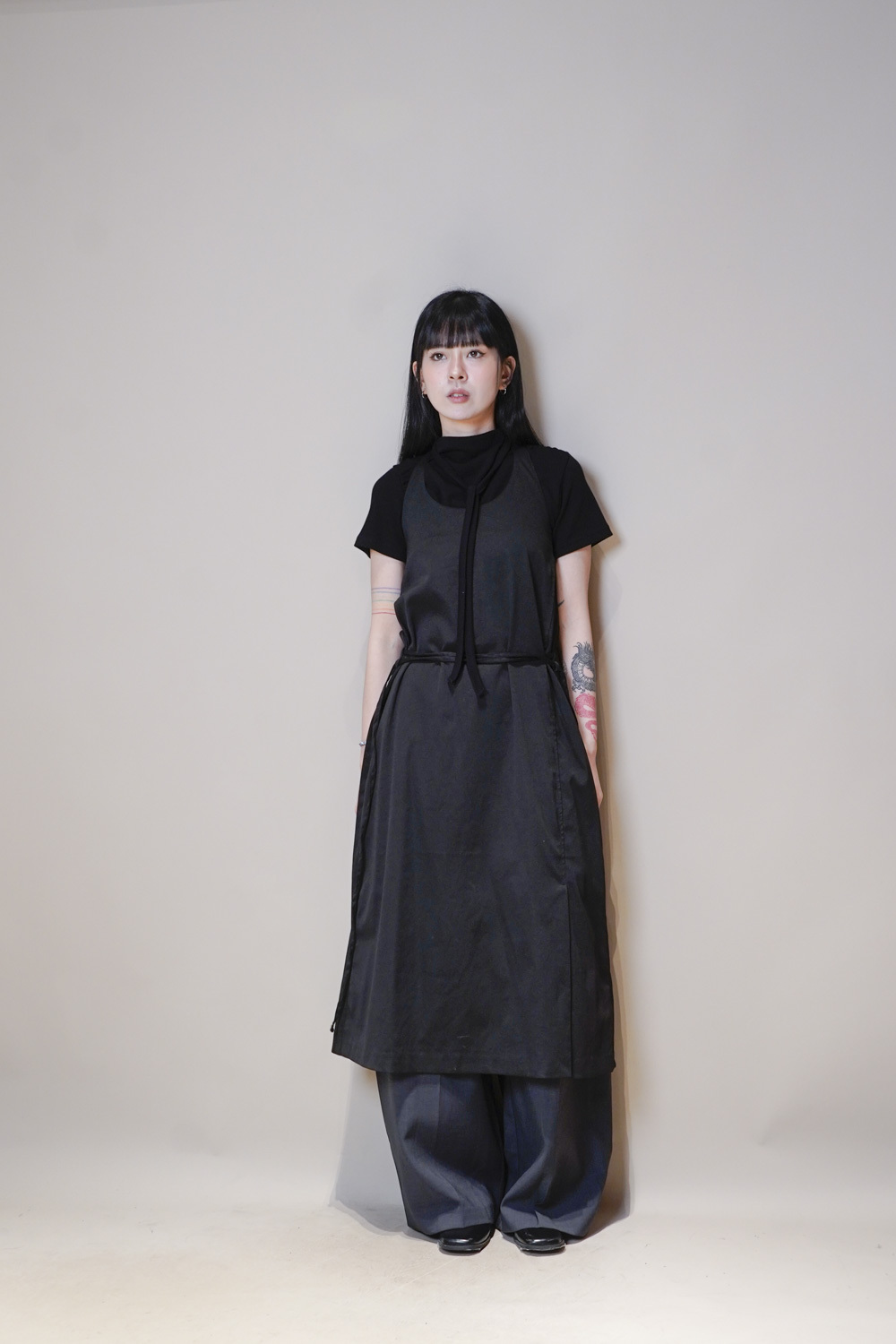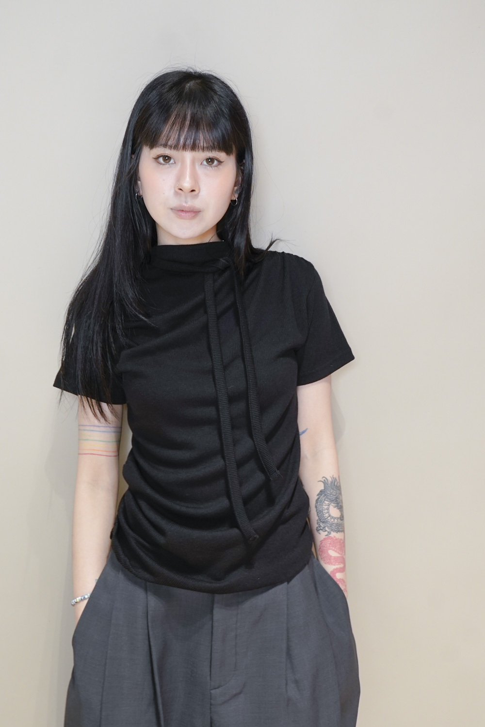 Stand Collar Tee With Thin Tie (BEIGE/ BLACK)