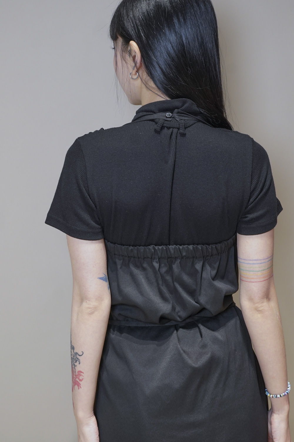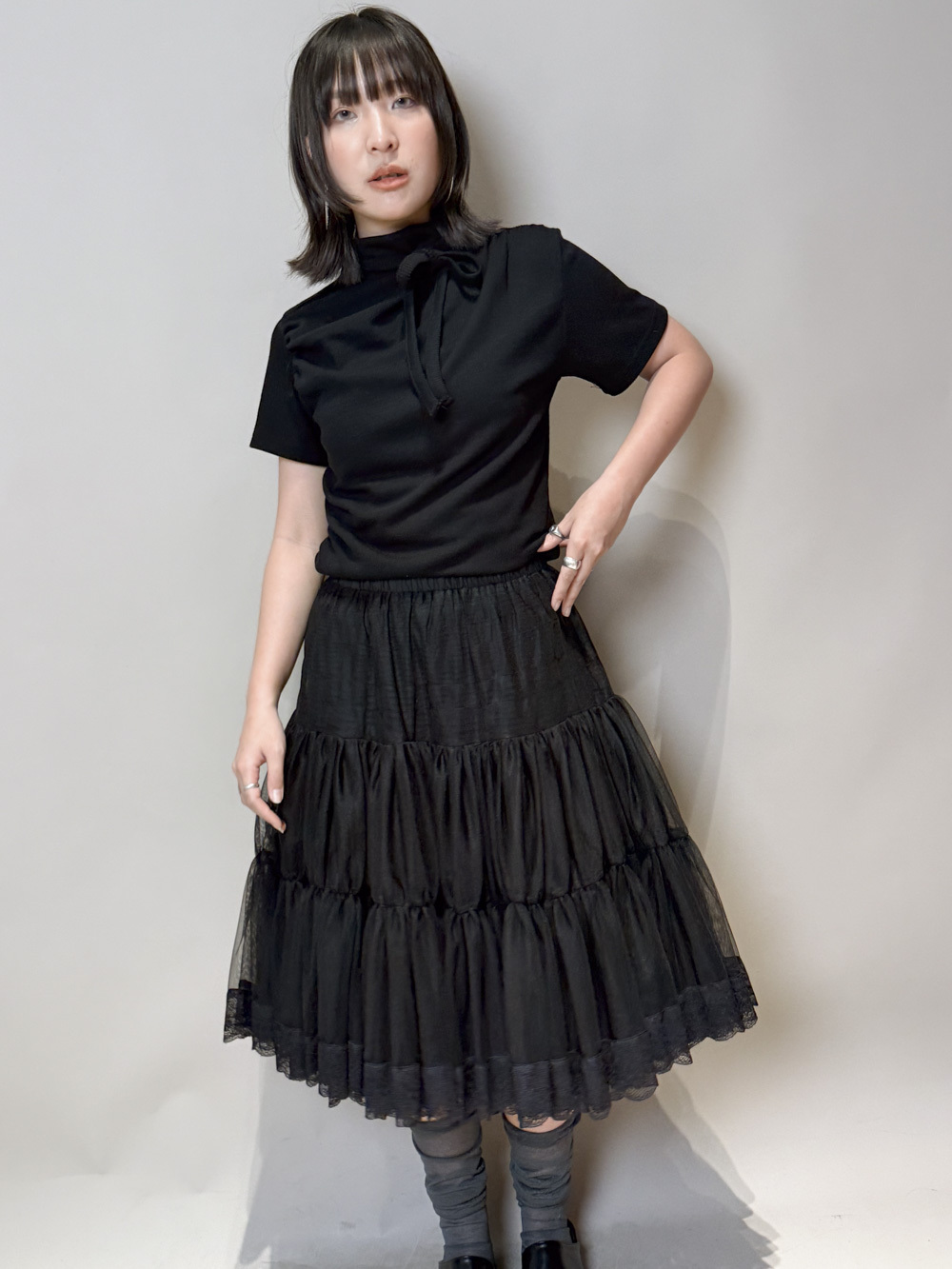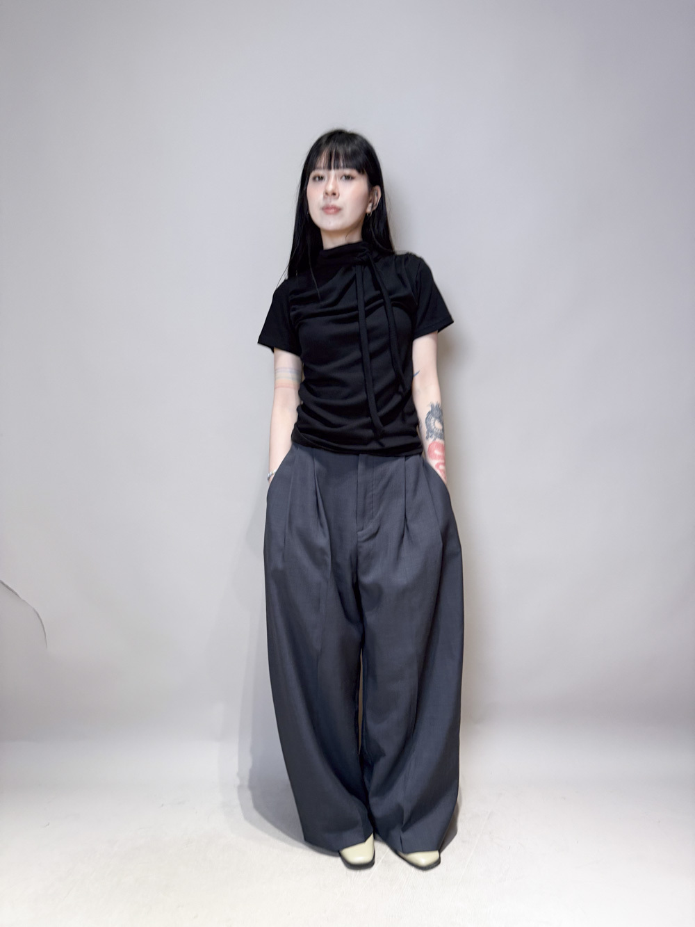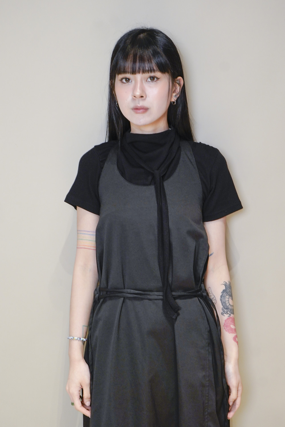 Stand Collar Tee With Thin Tie (BEIGE/ BLACK)