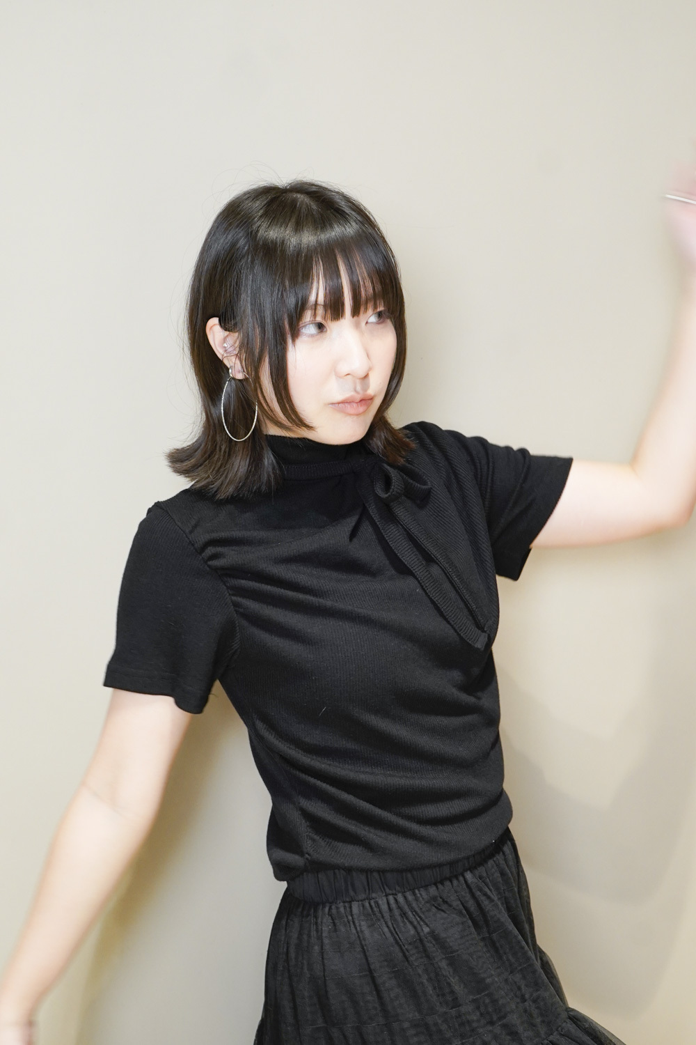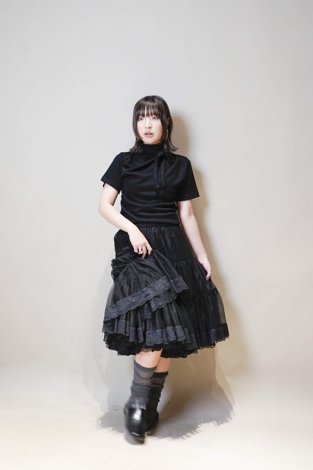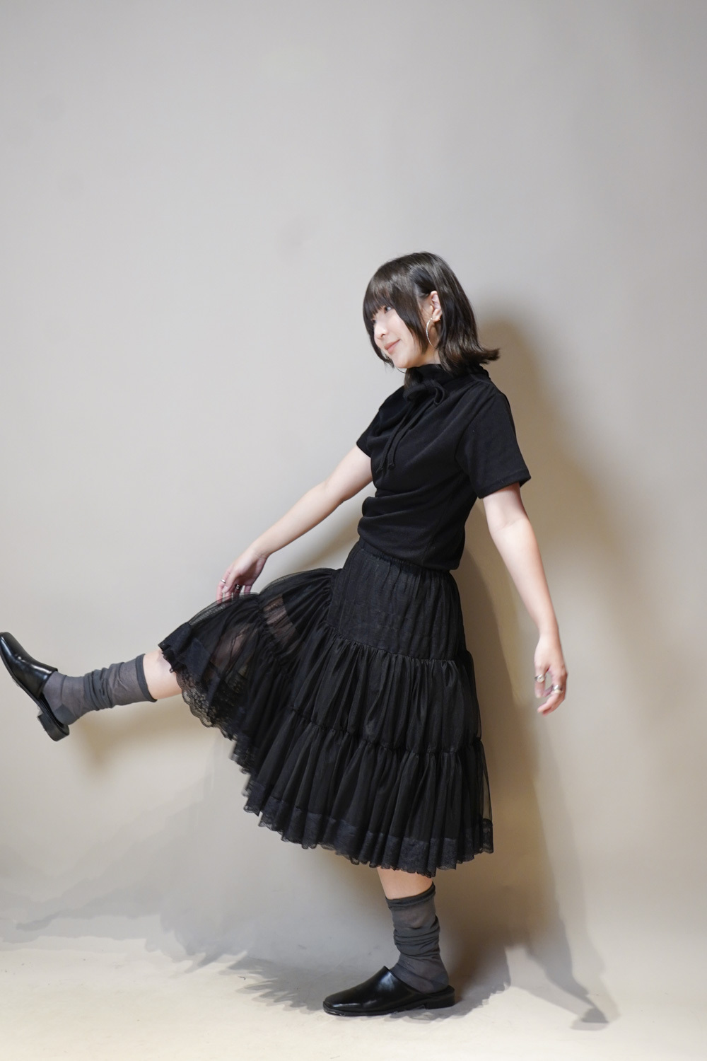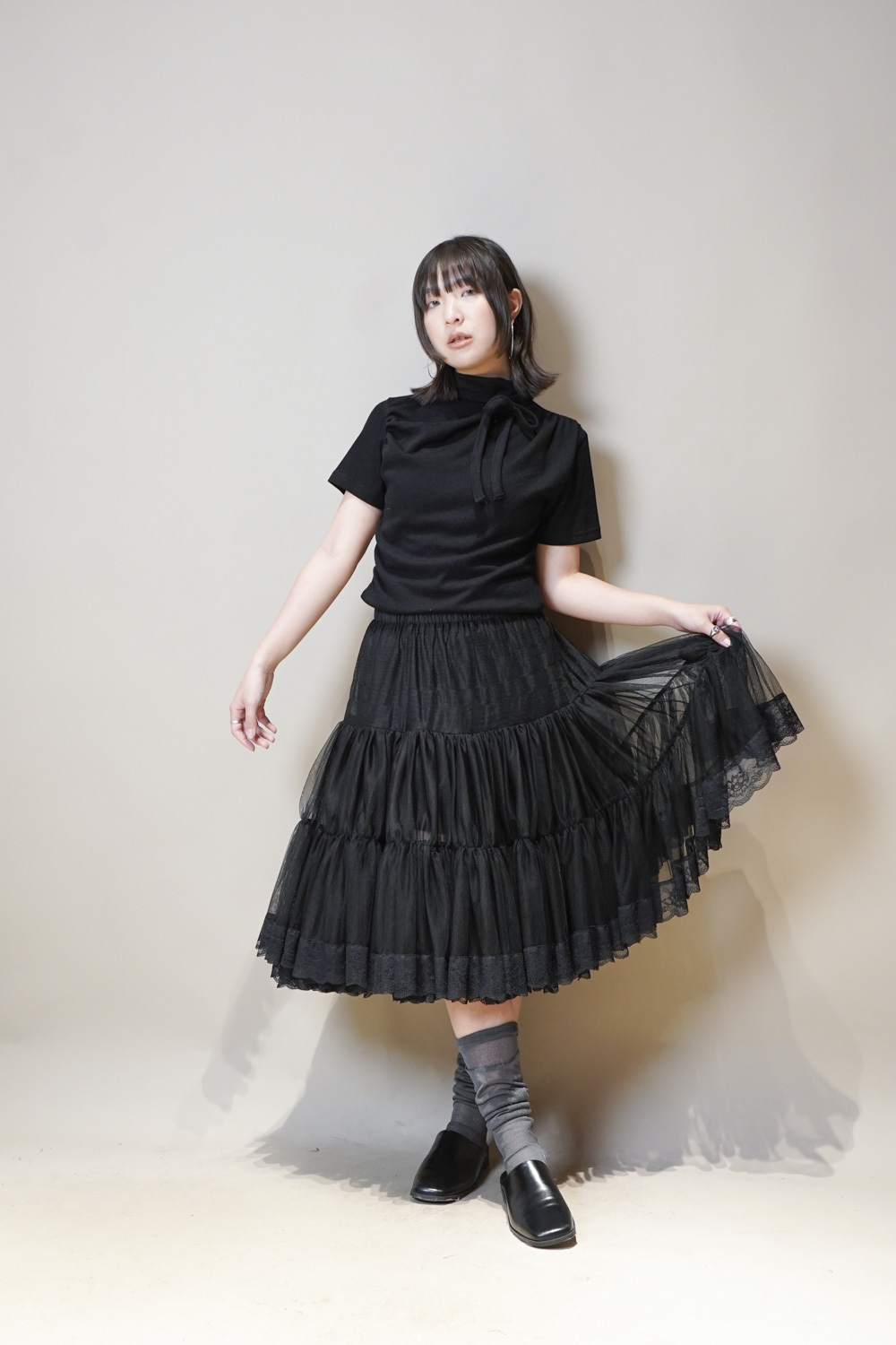 Stand Collar Tee With Thin Tie (BEIGE/ BLACK)
