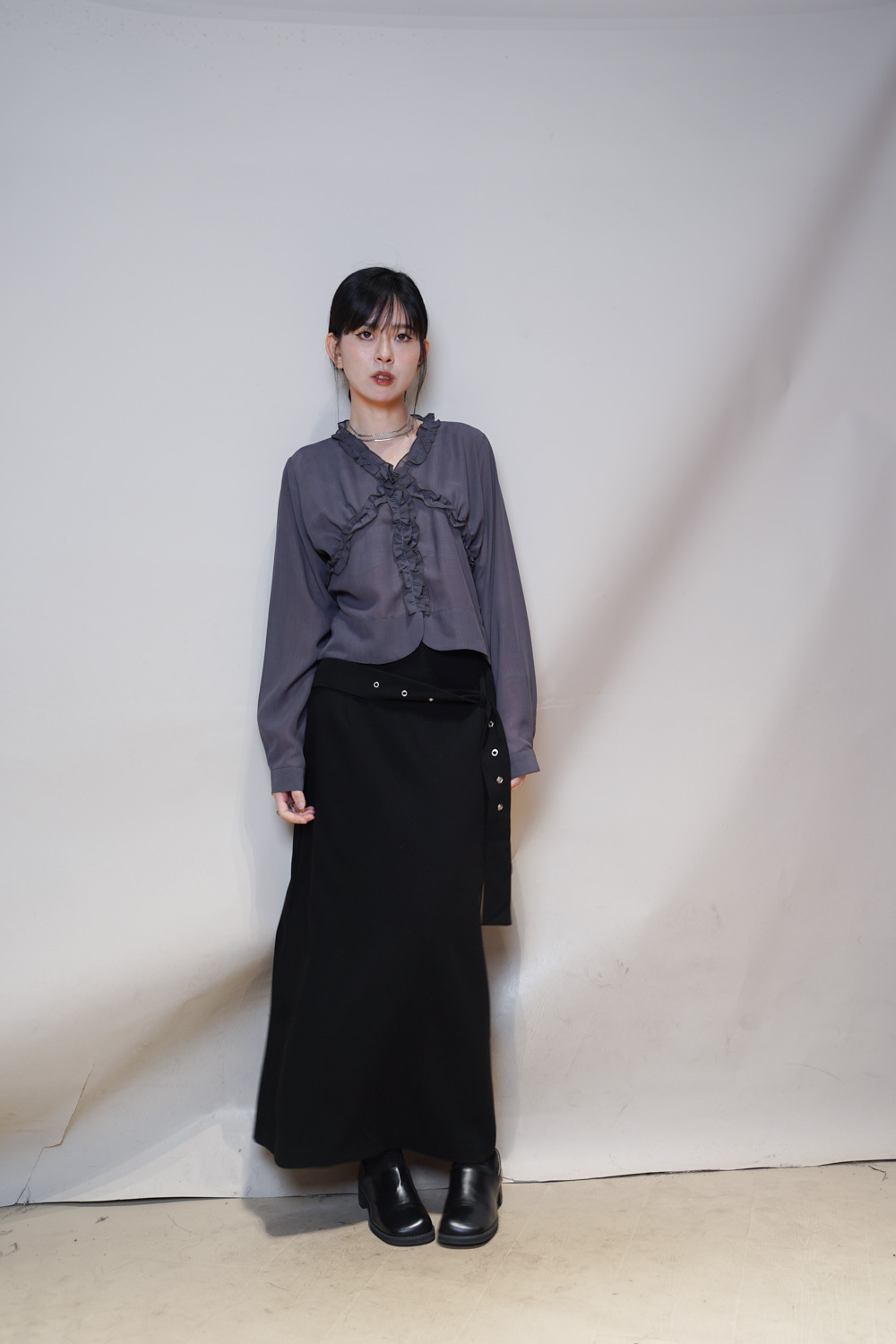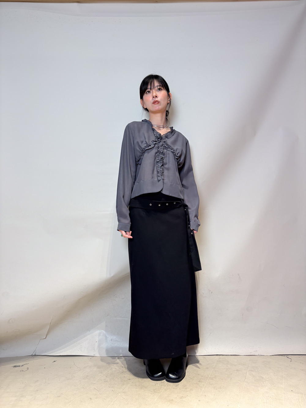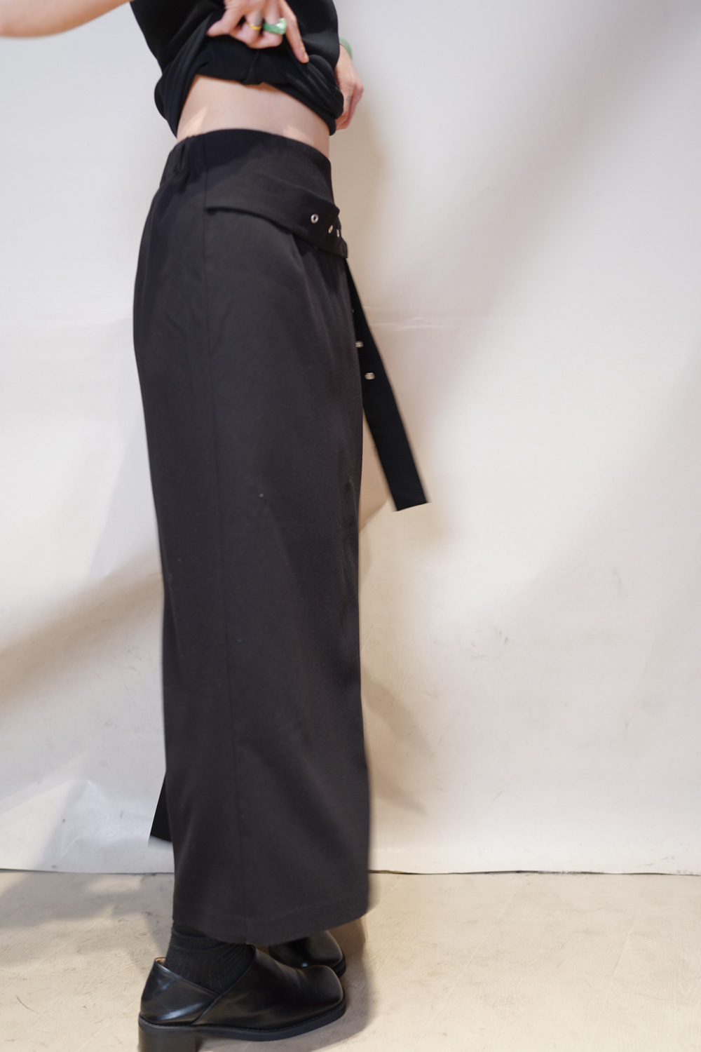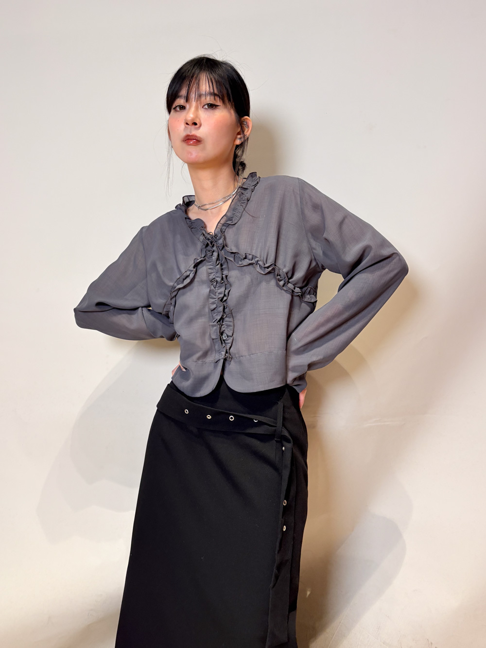 Stylish eyelet belt mid length skirt (GREY/BLACK) - Free size
