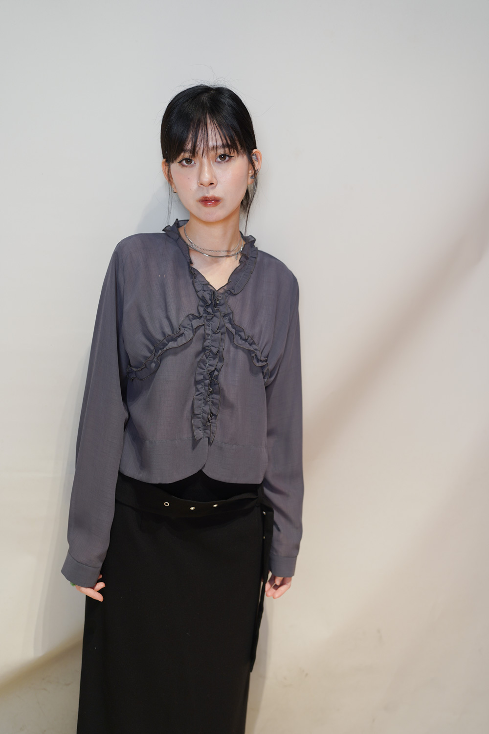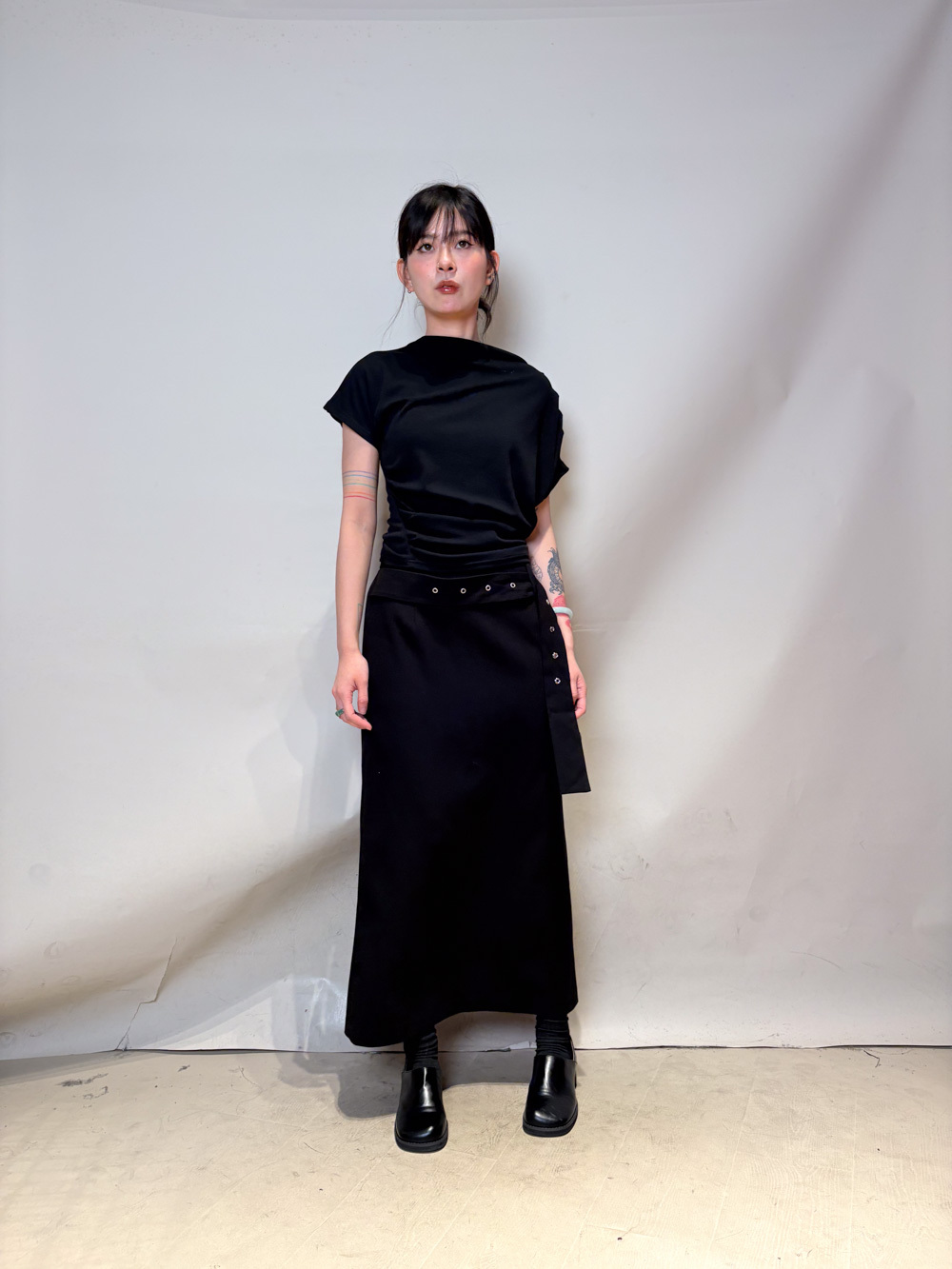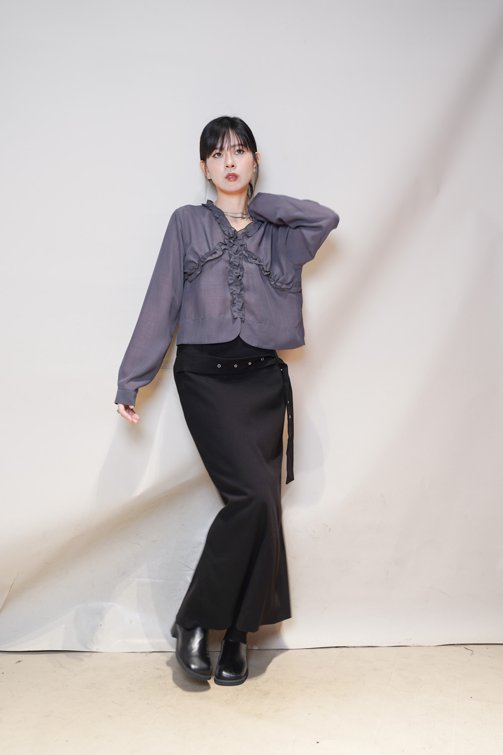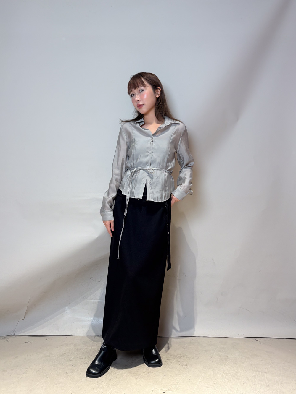 Stylish eyelet belt mid length skirt (GREY/BLACK) - Free size