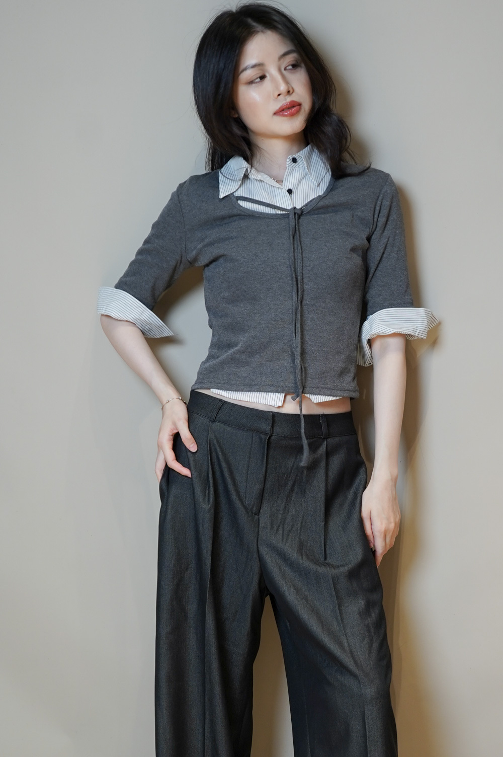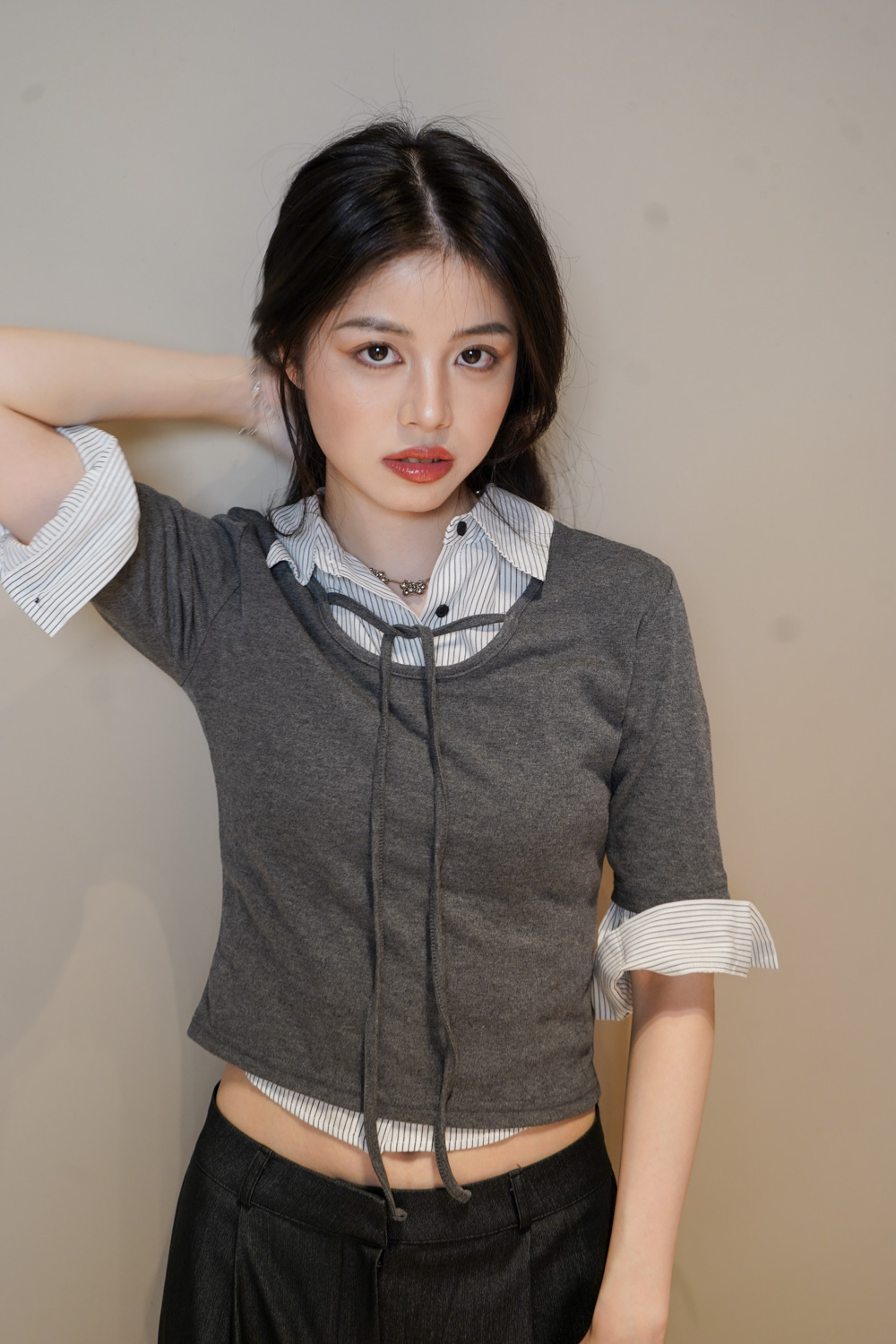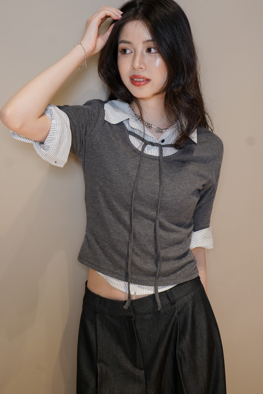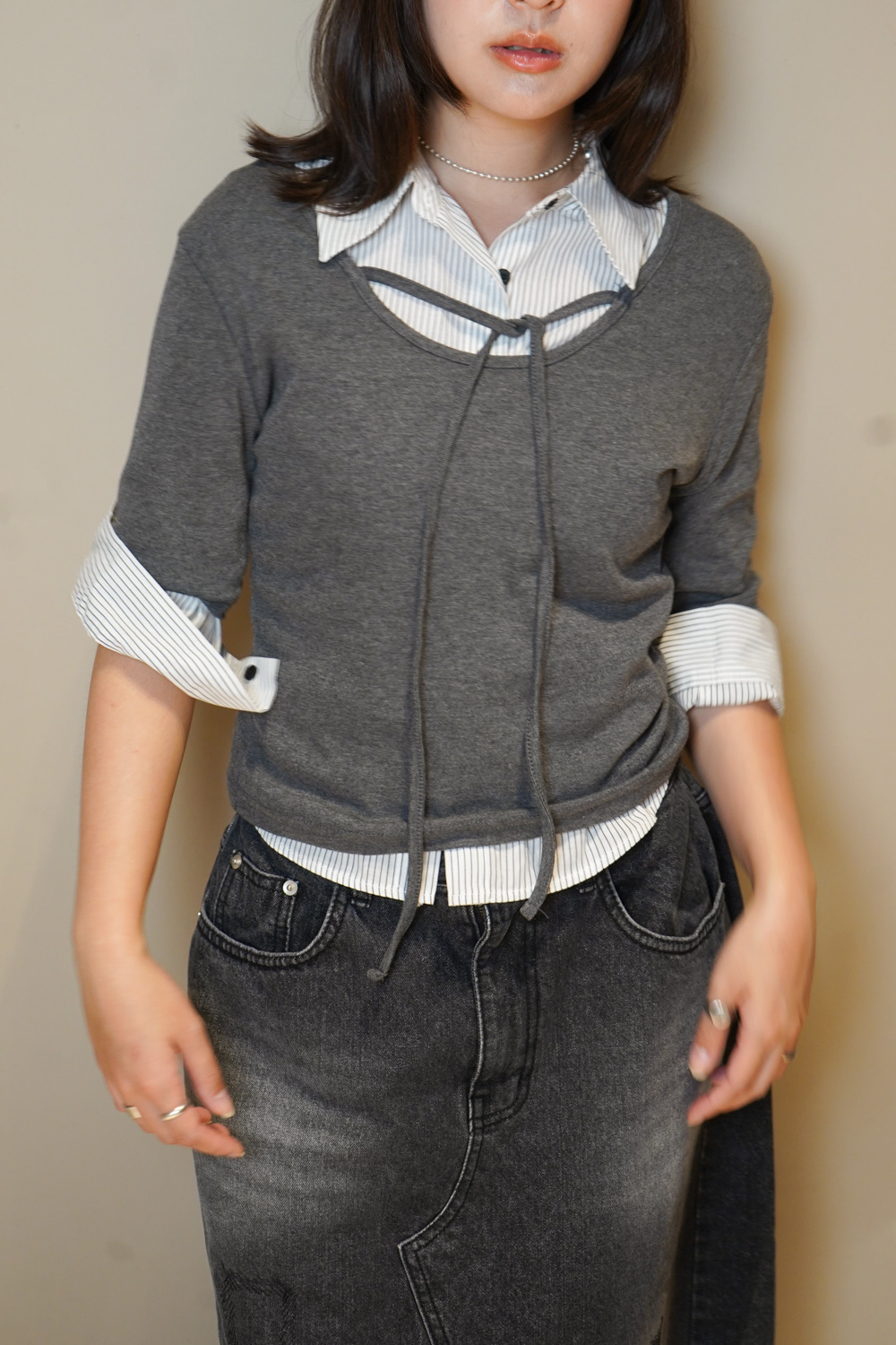 Tie-Front layering top (CHARCOAL/BLACK)