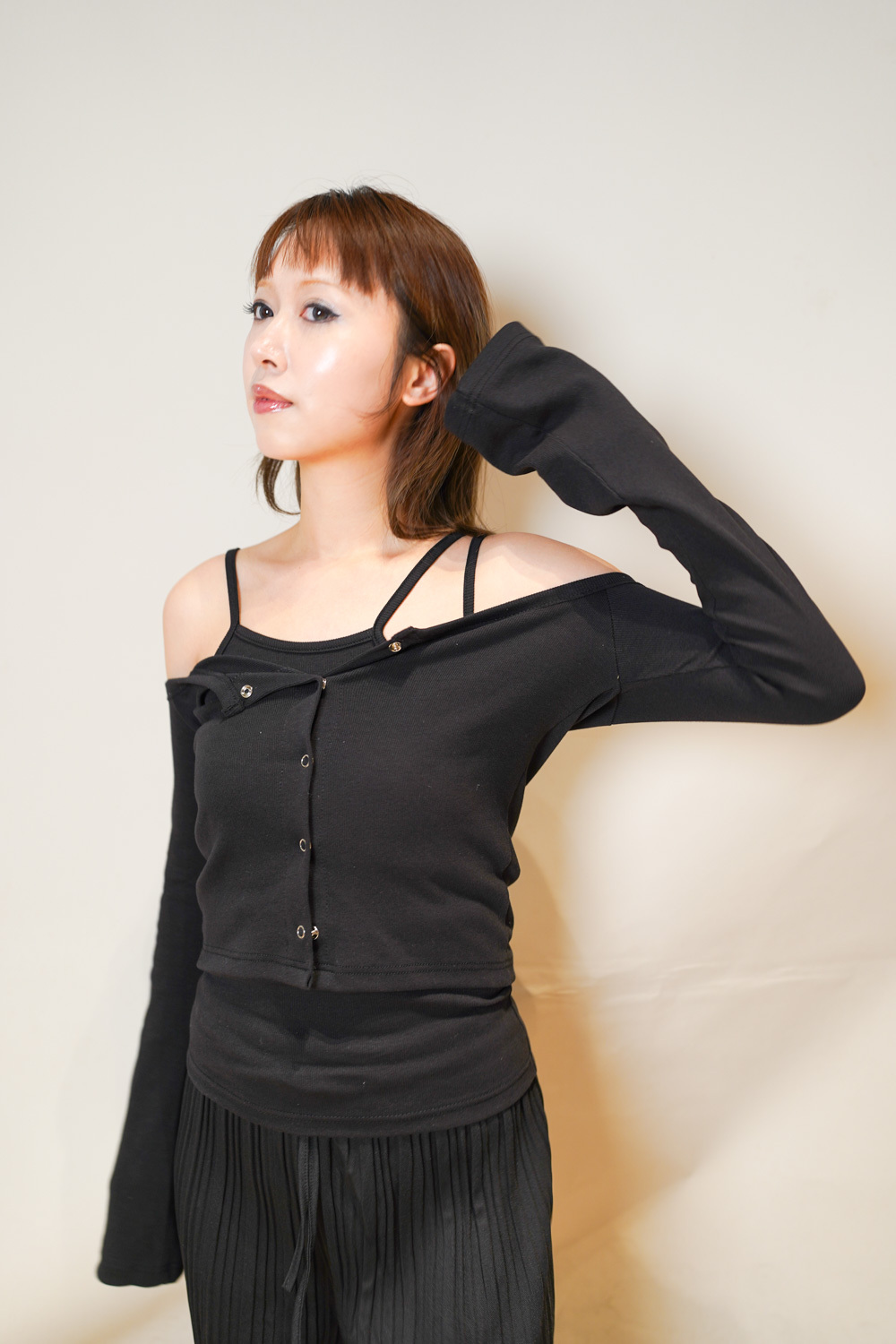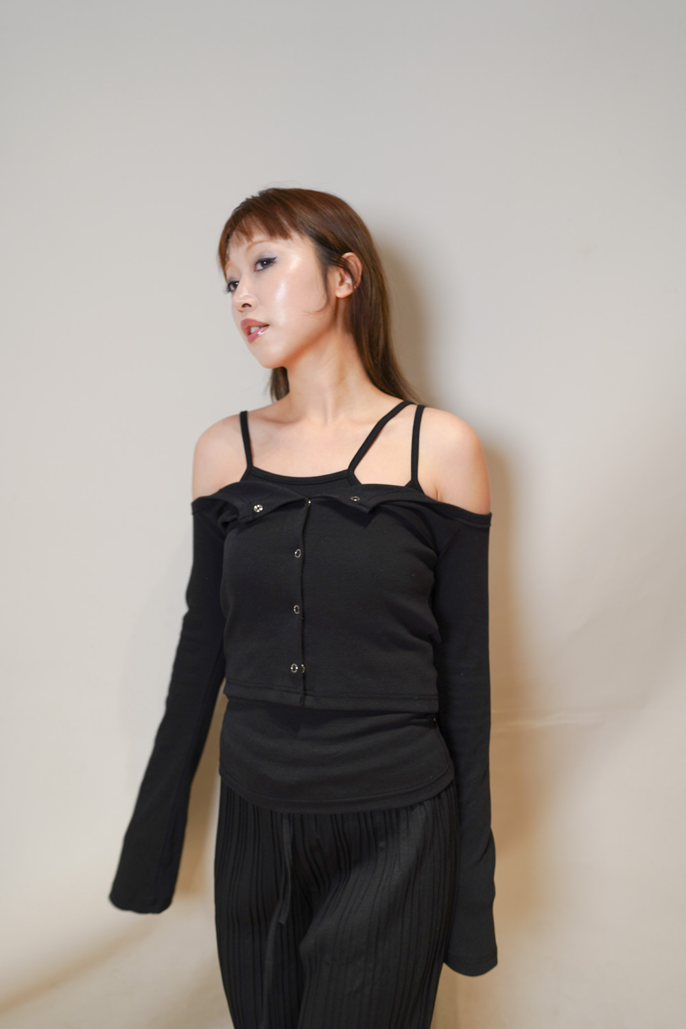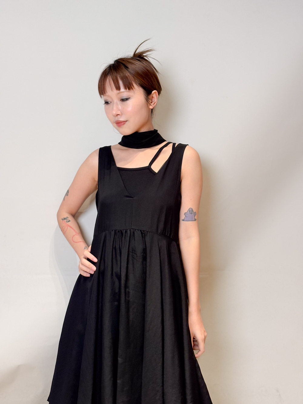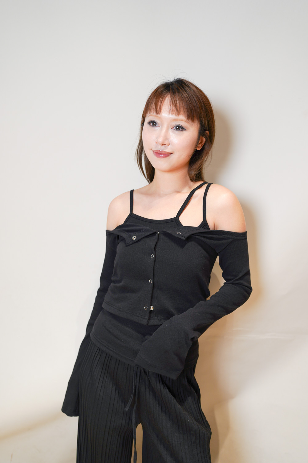 領口位置剛好露出鎖骨與肩膀線條 呈現一種內斂卻有設計感的女性美學