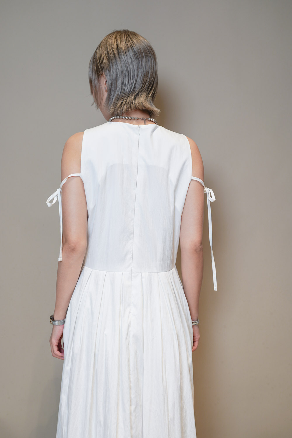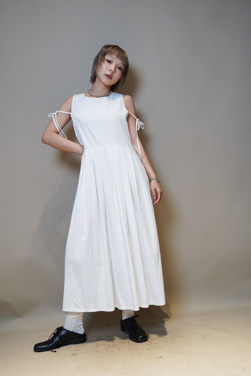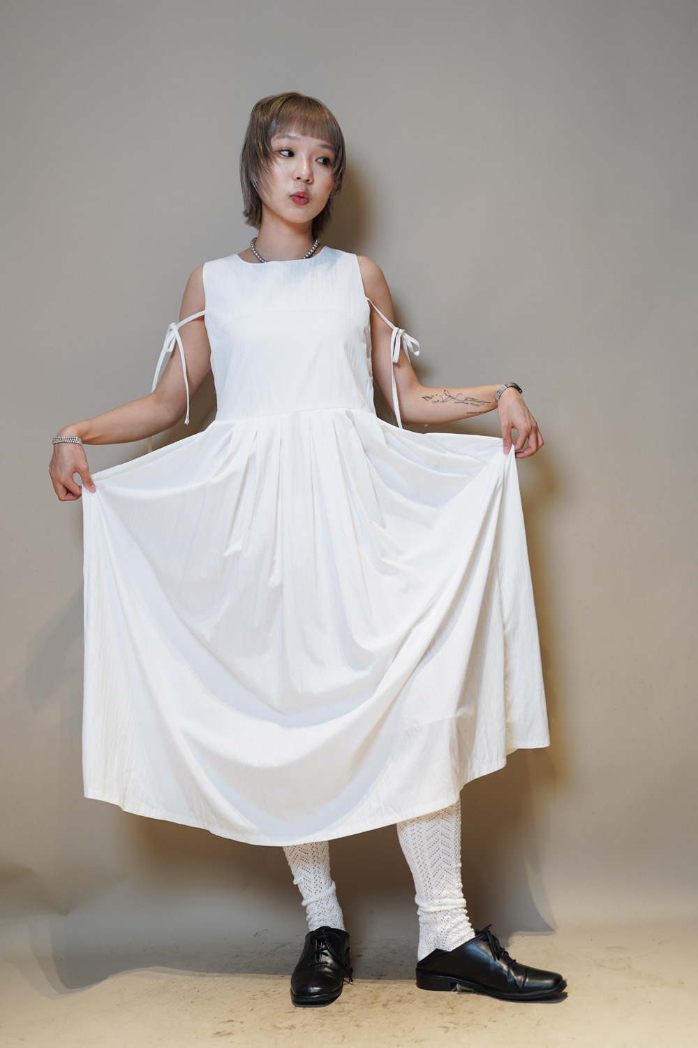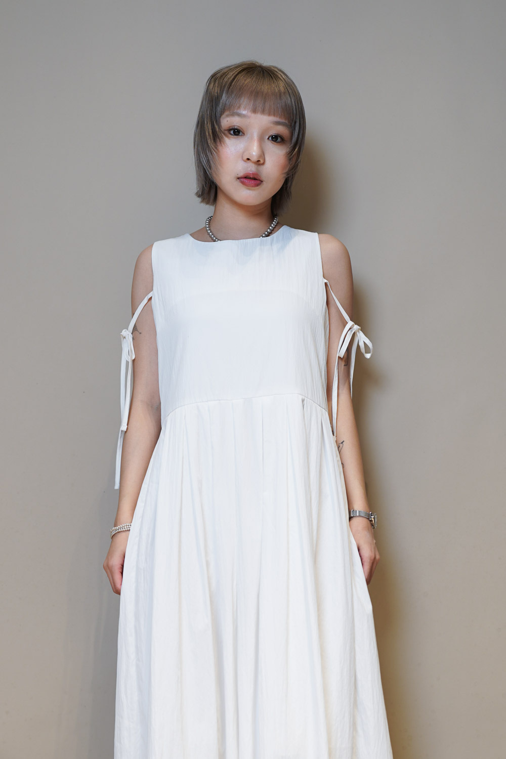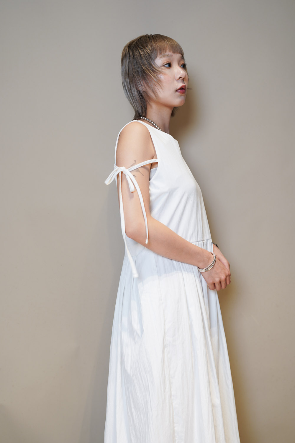 肩膀設有蝴蝶結綁帶 營造飄逸垂墜感/