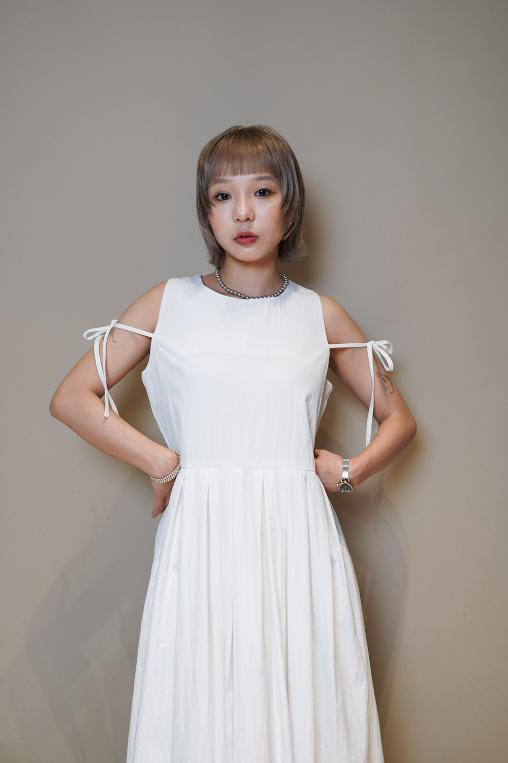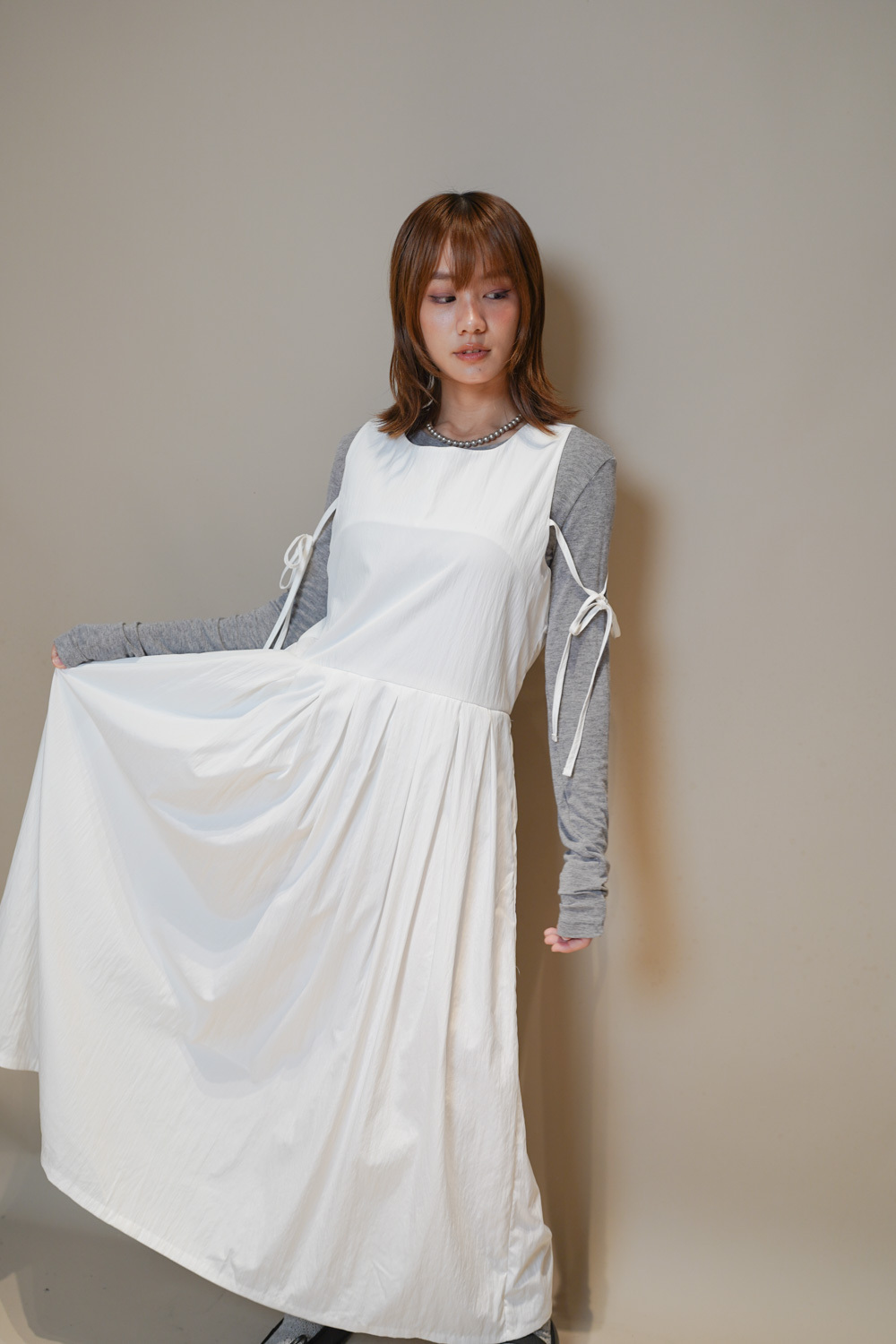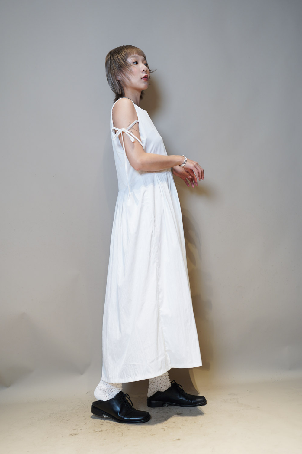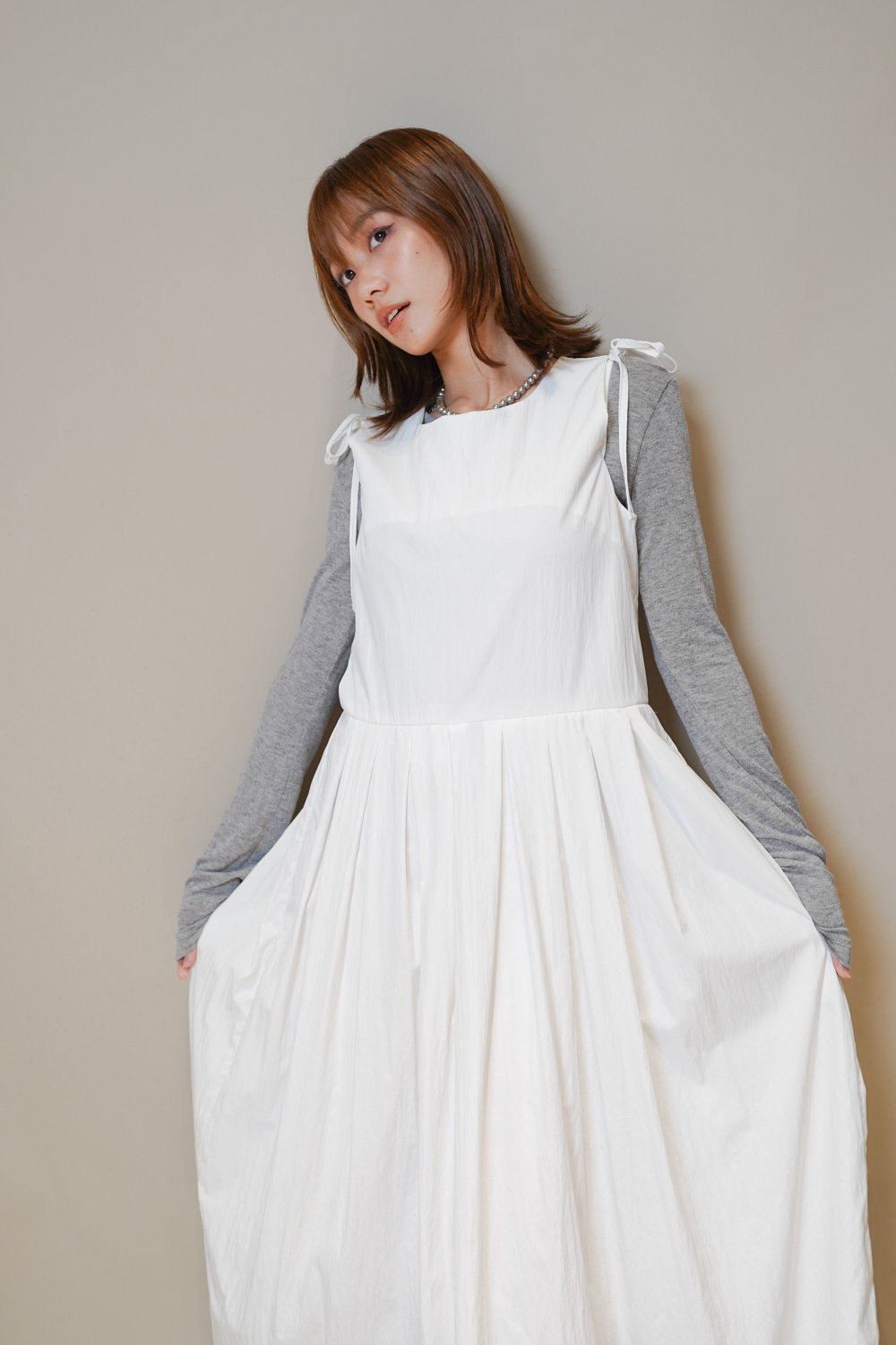 肩膀設有蝴蝶結綁帶 營造飄逸垂墜感/
