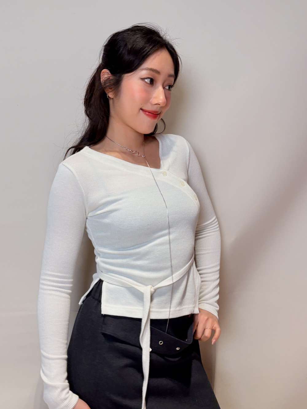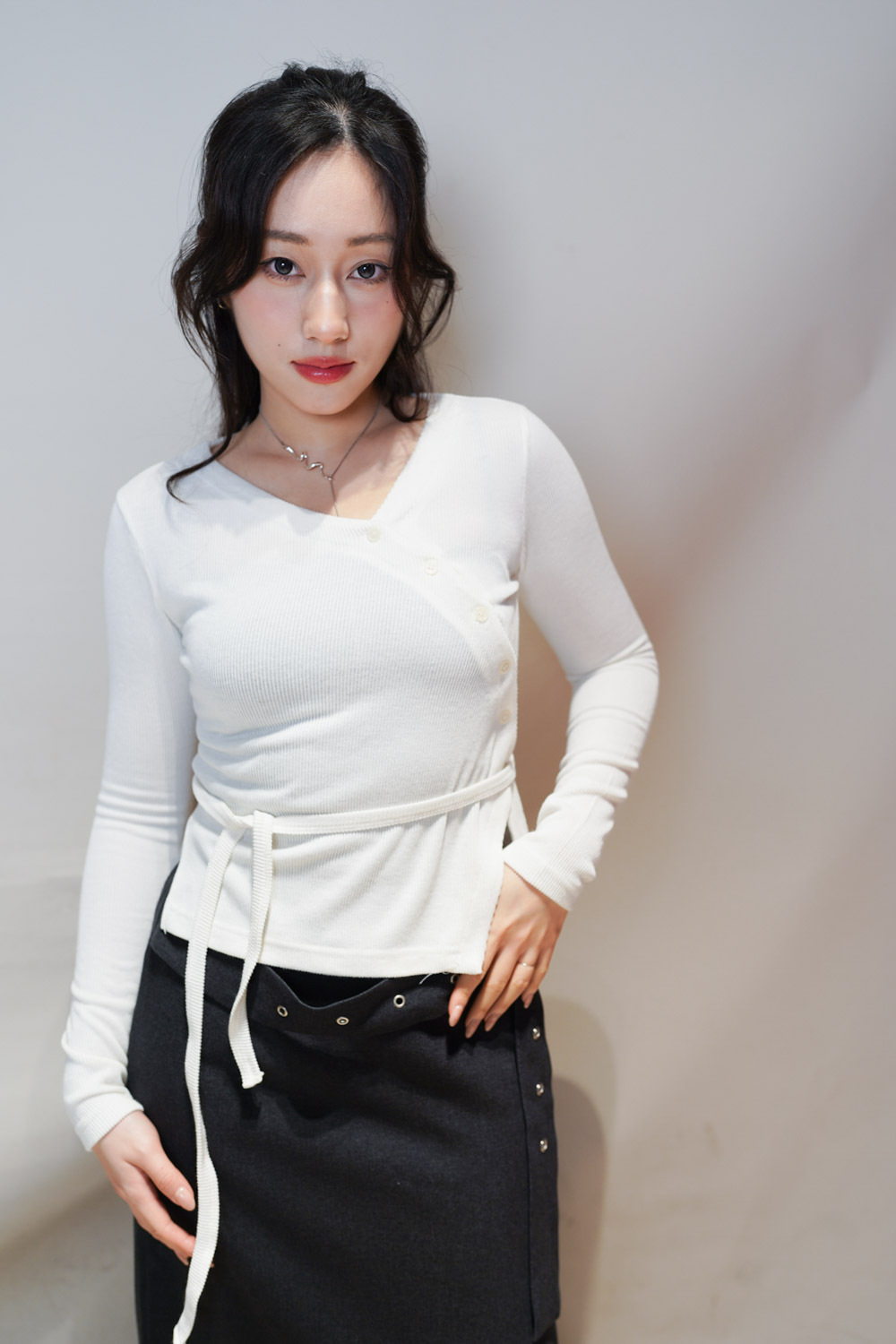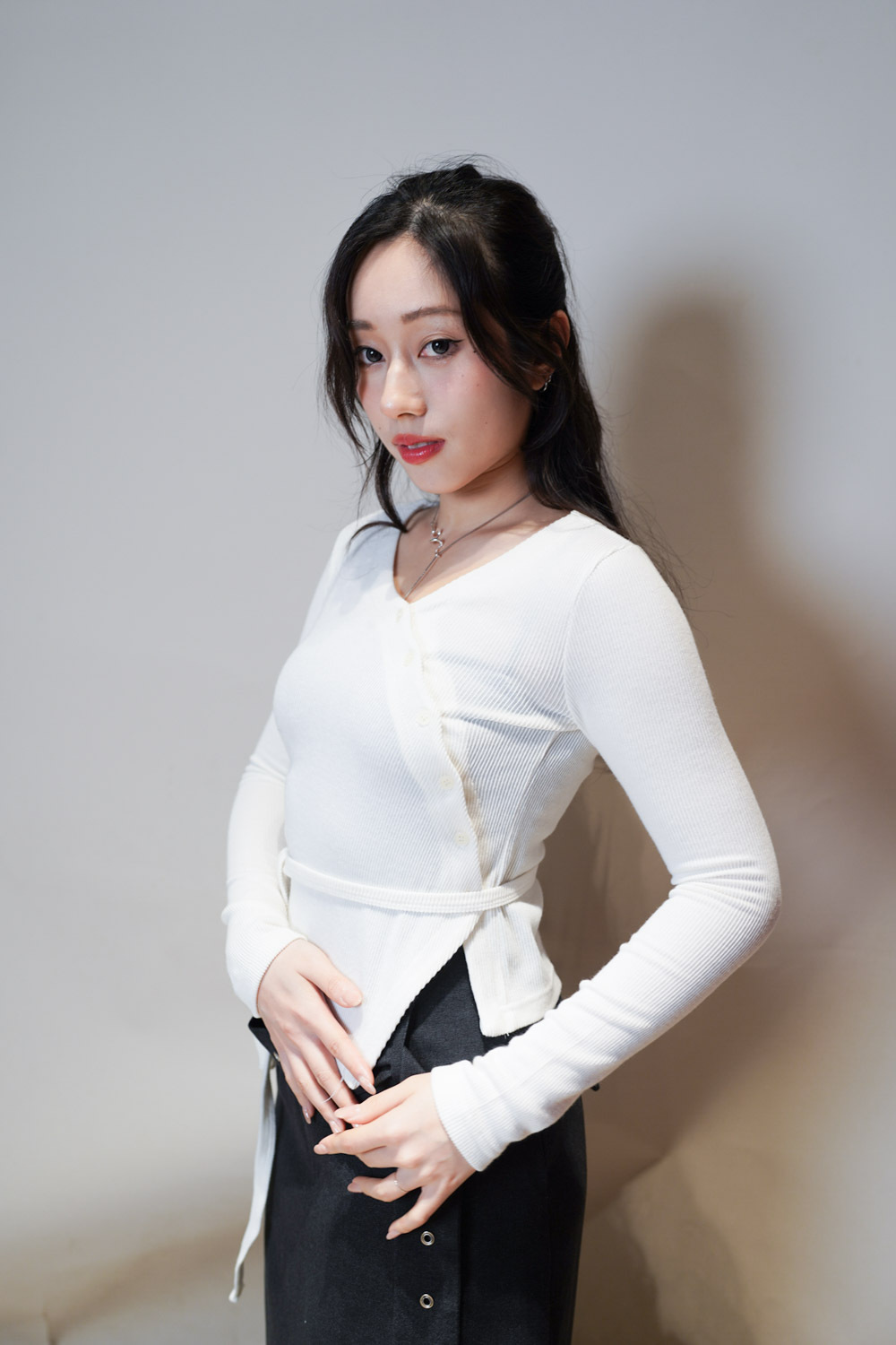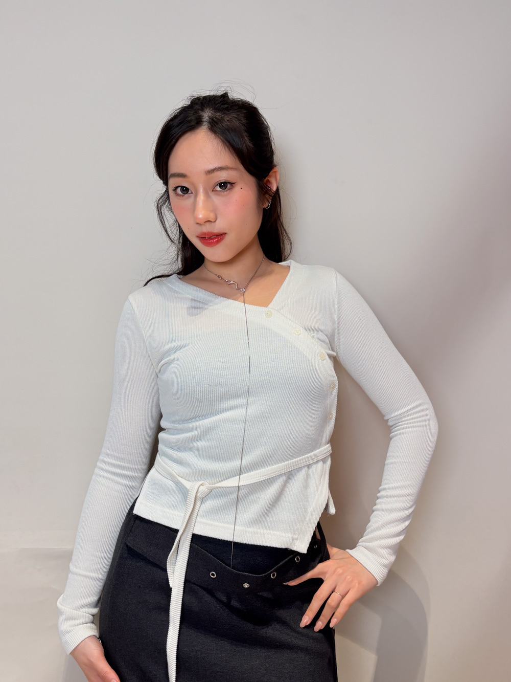 V kimono top with waist belt (WHITE/BLACK)
