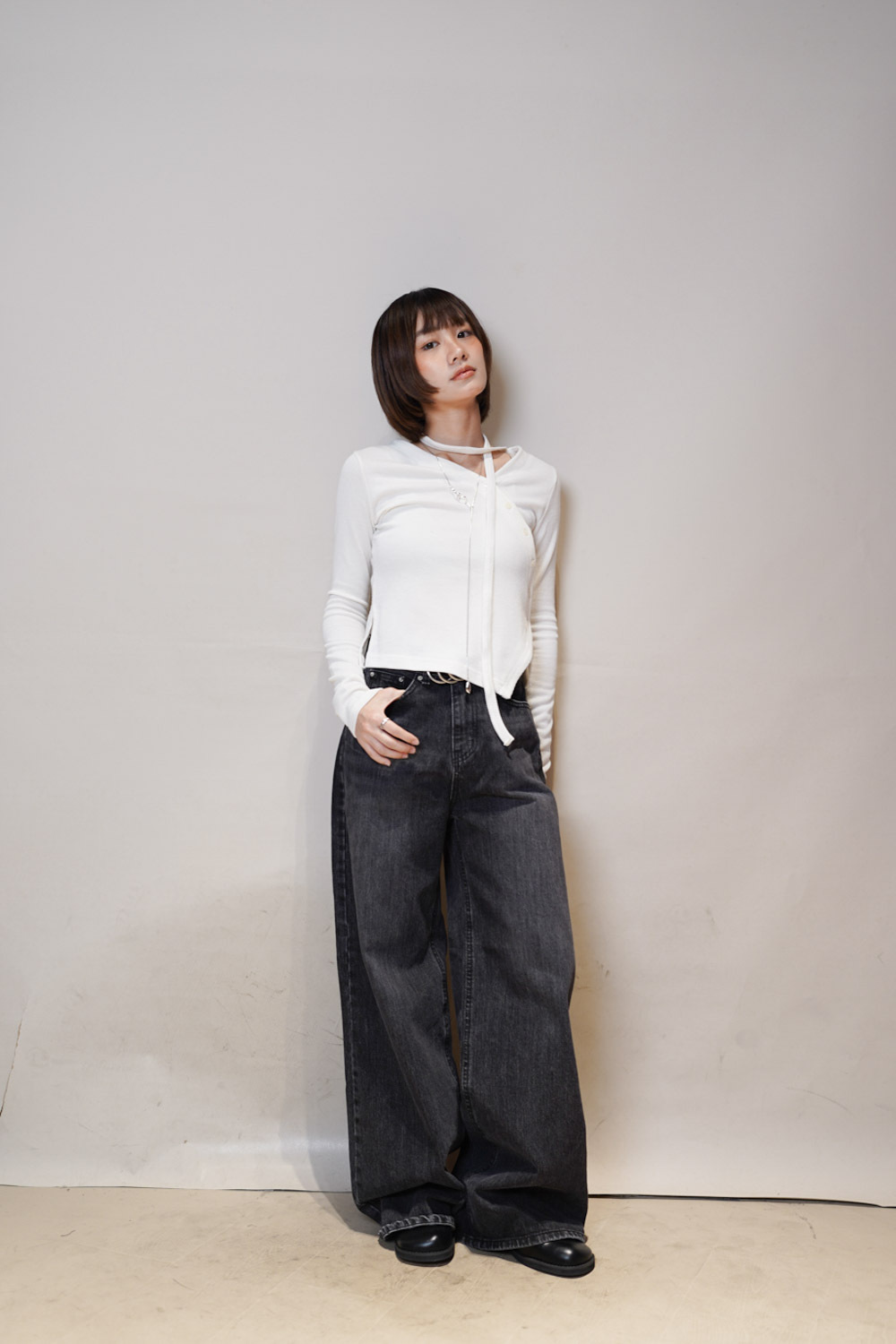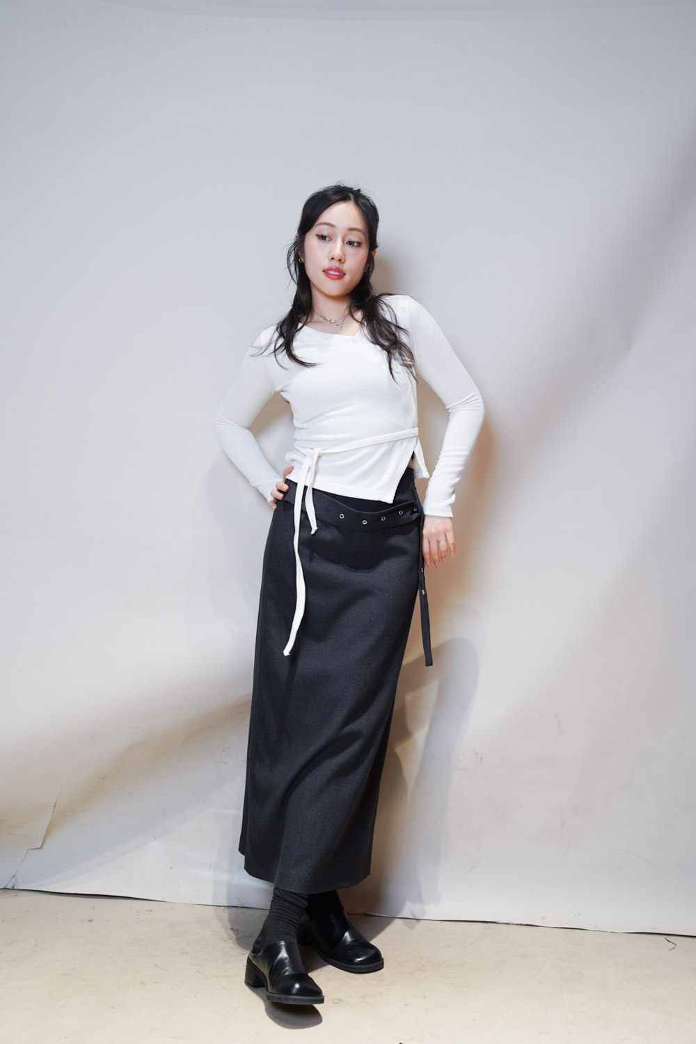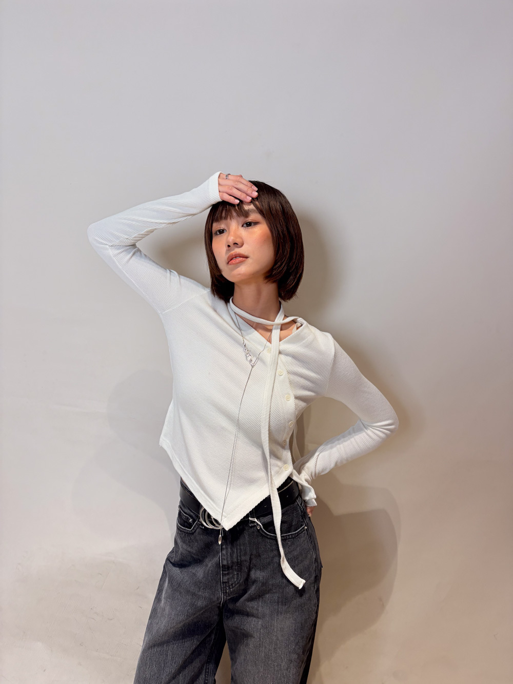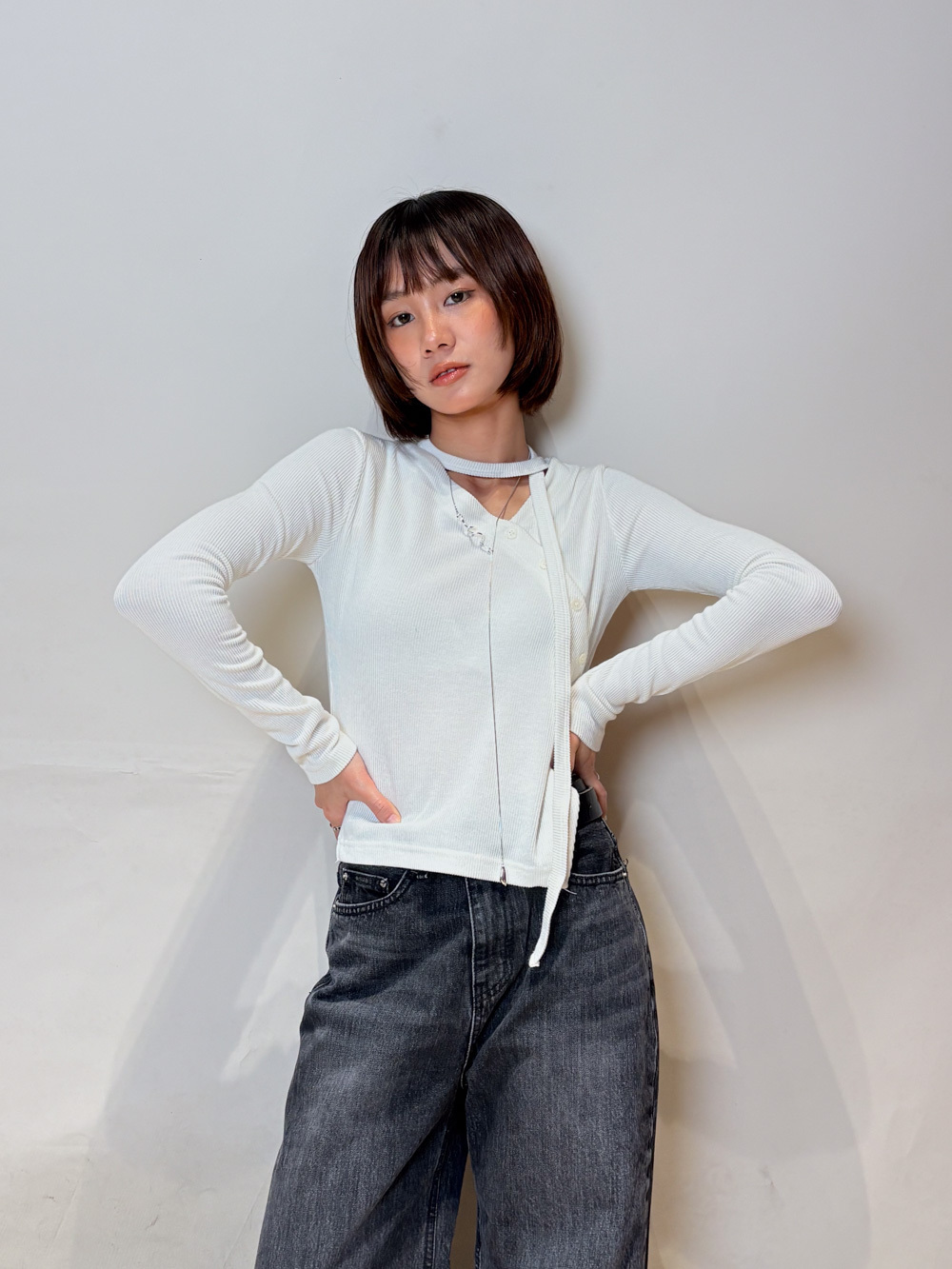 V kimono top with waist belt (WHITE/BLACK)