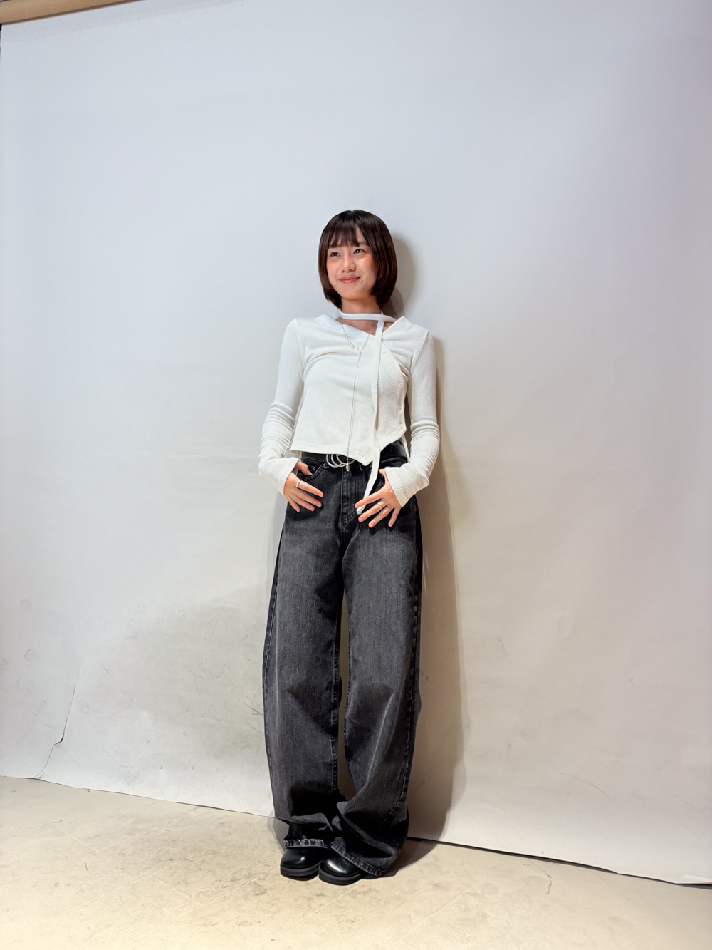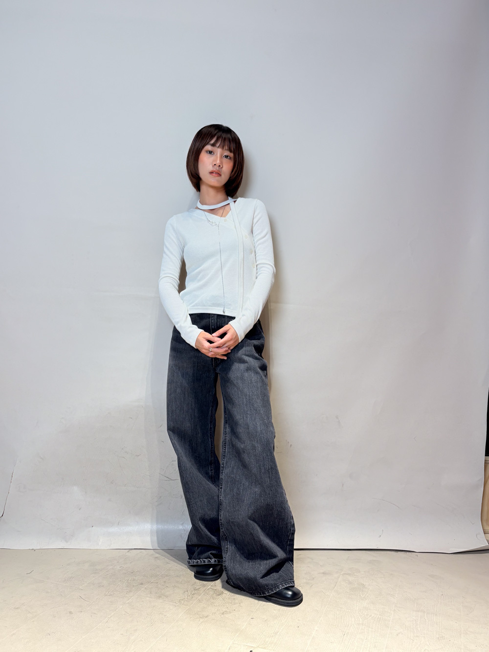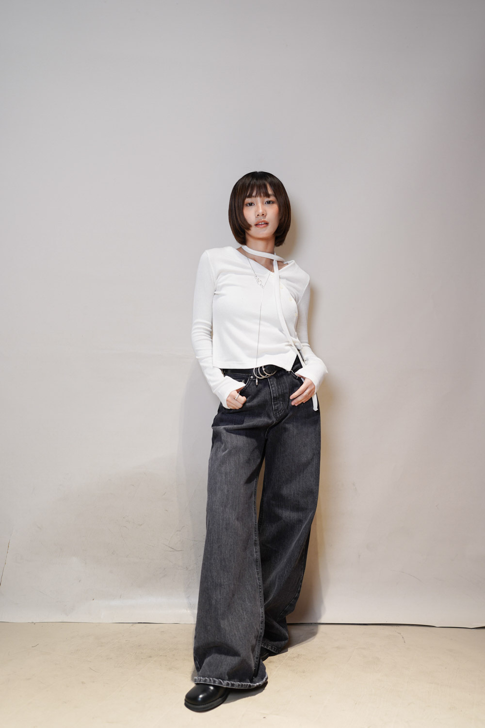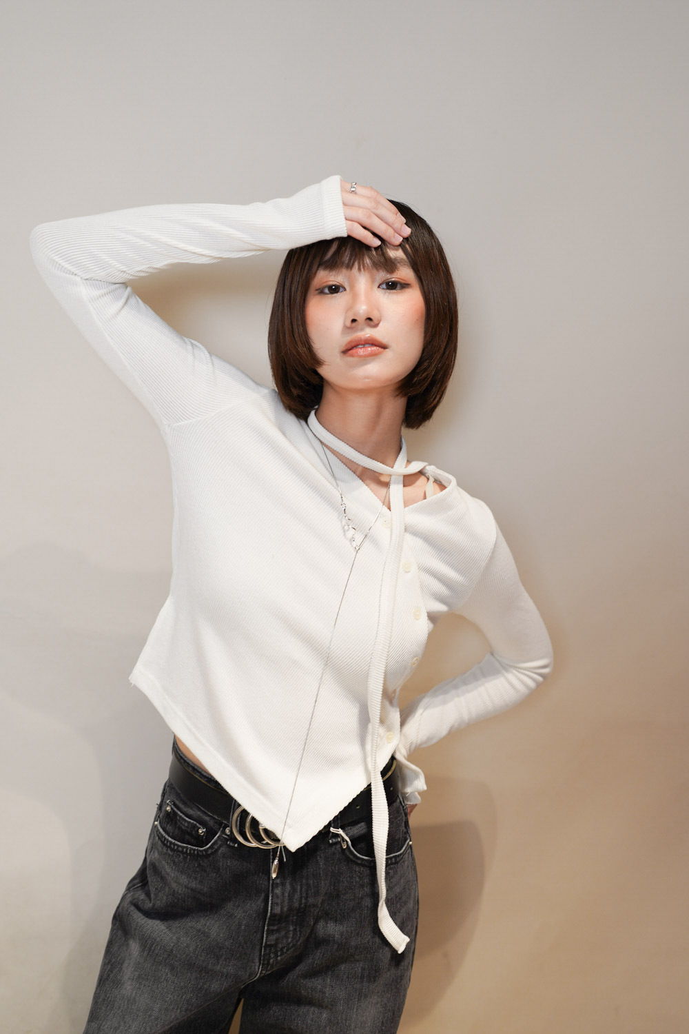 V kimono top with waist belt (WHITE/BLACK)