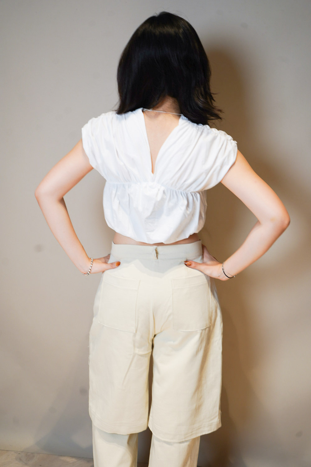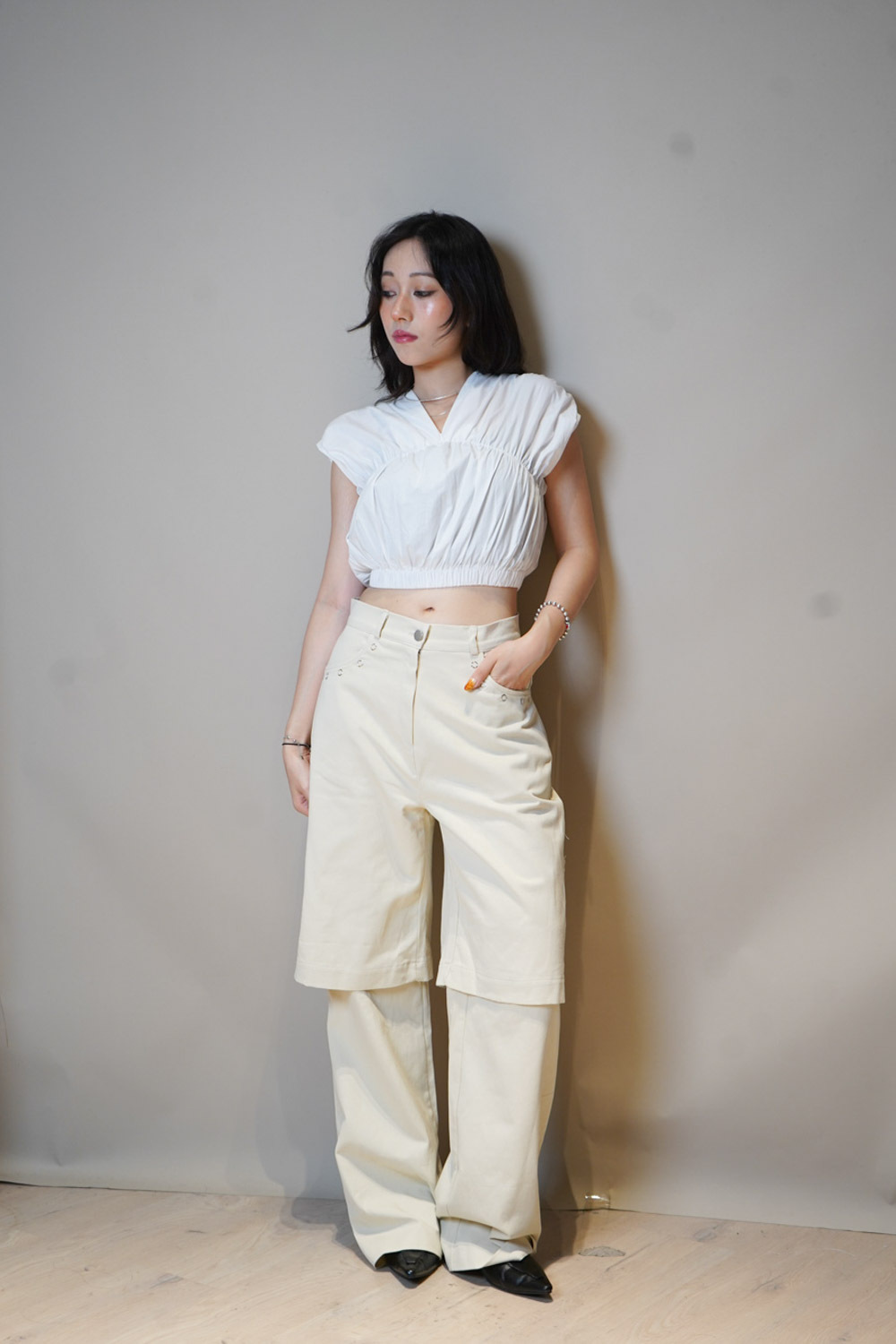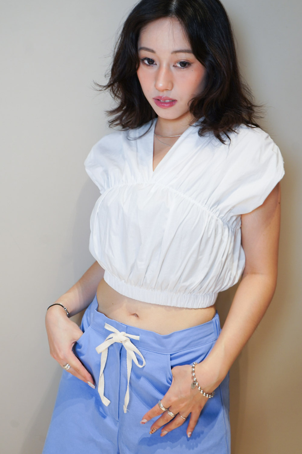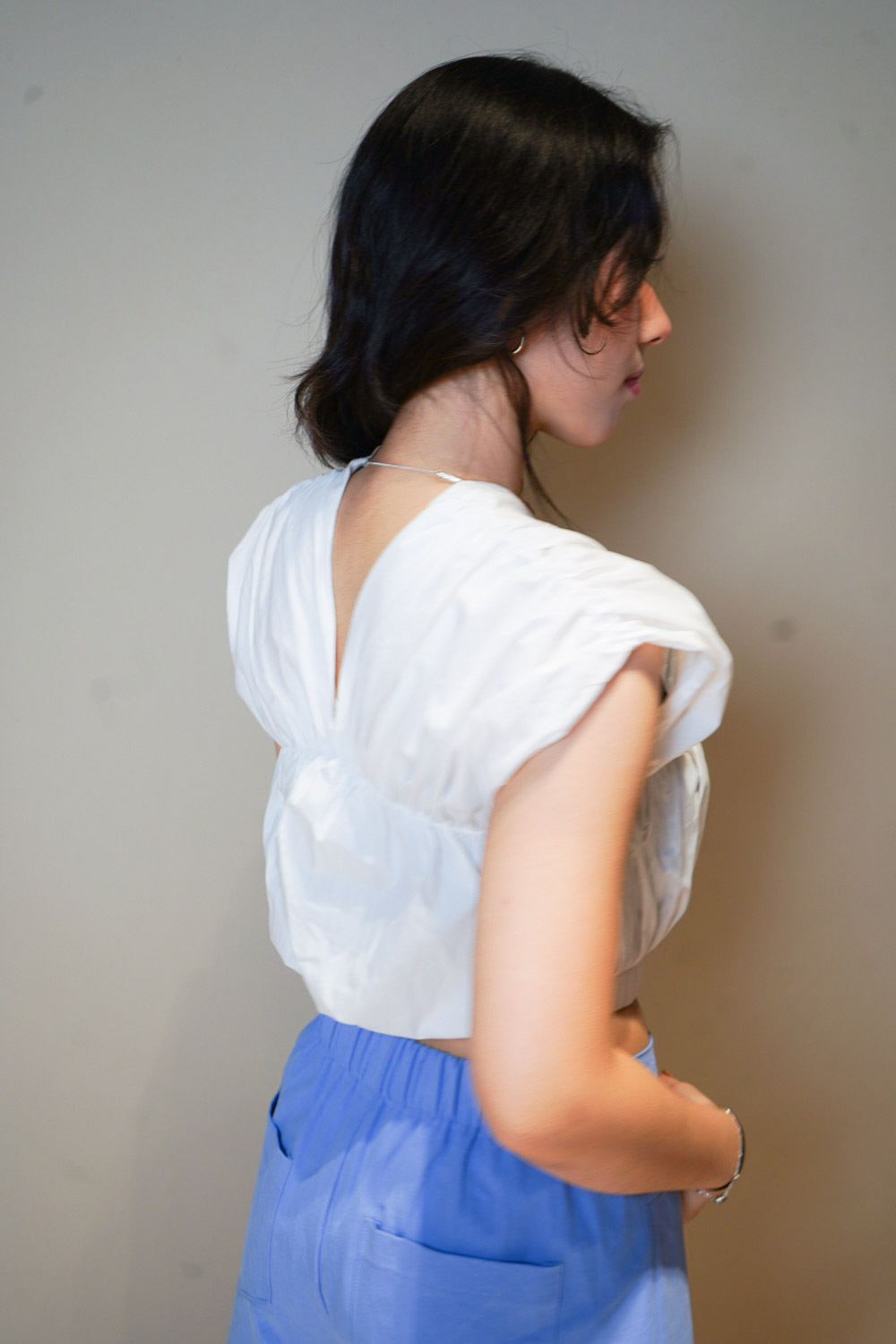 V puff cropped blouse (WHITE/NAVY)