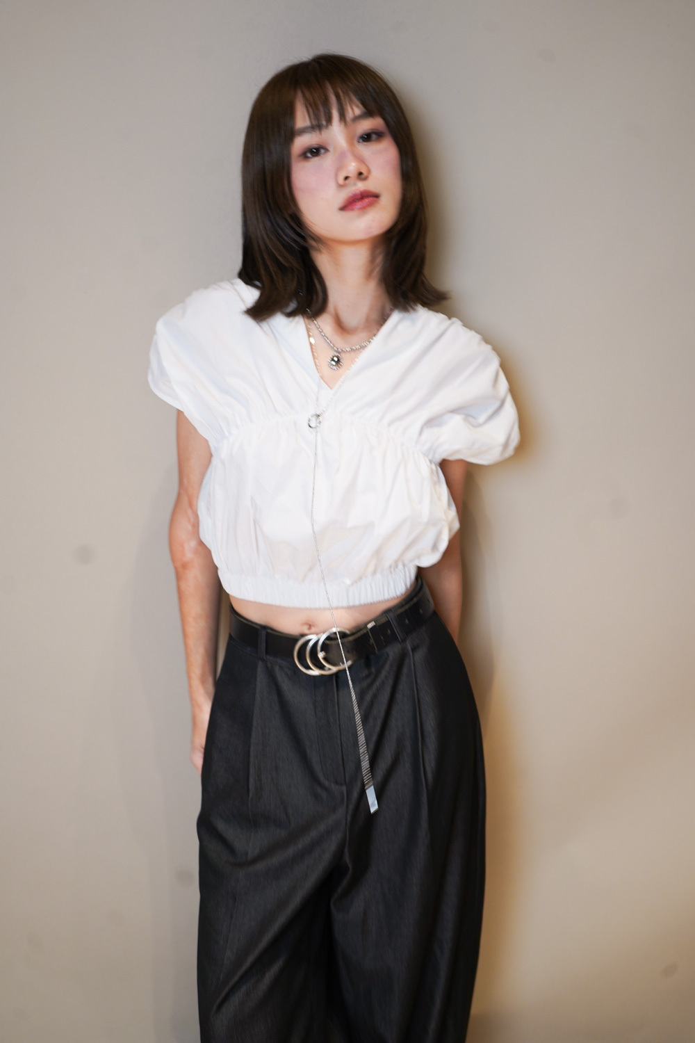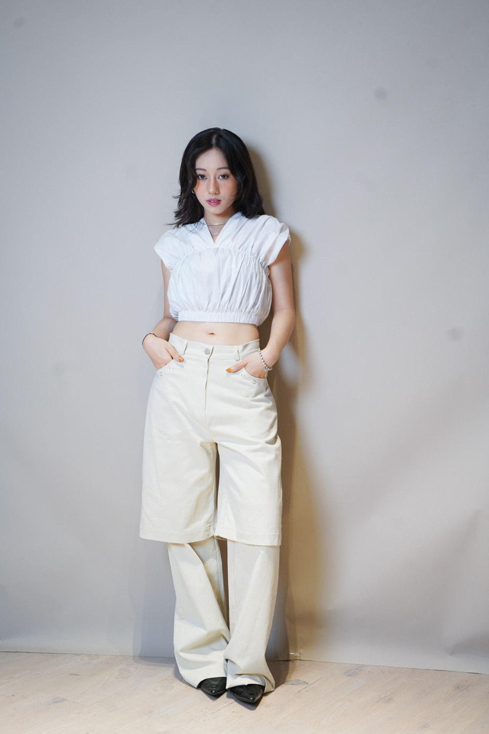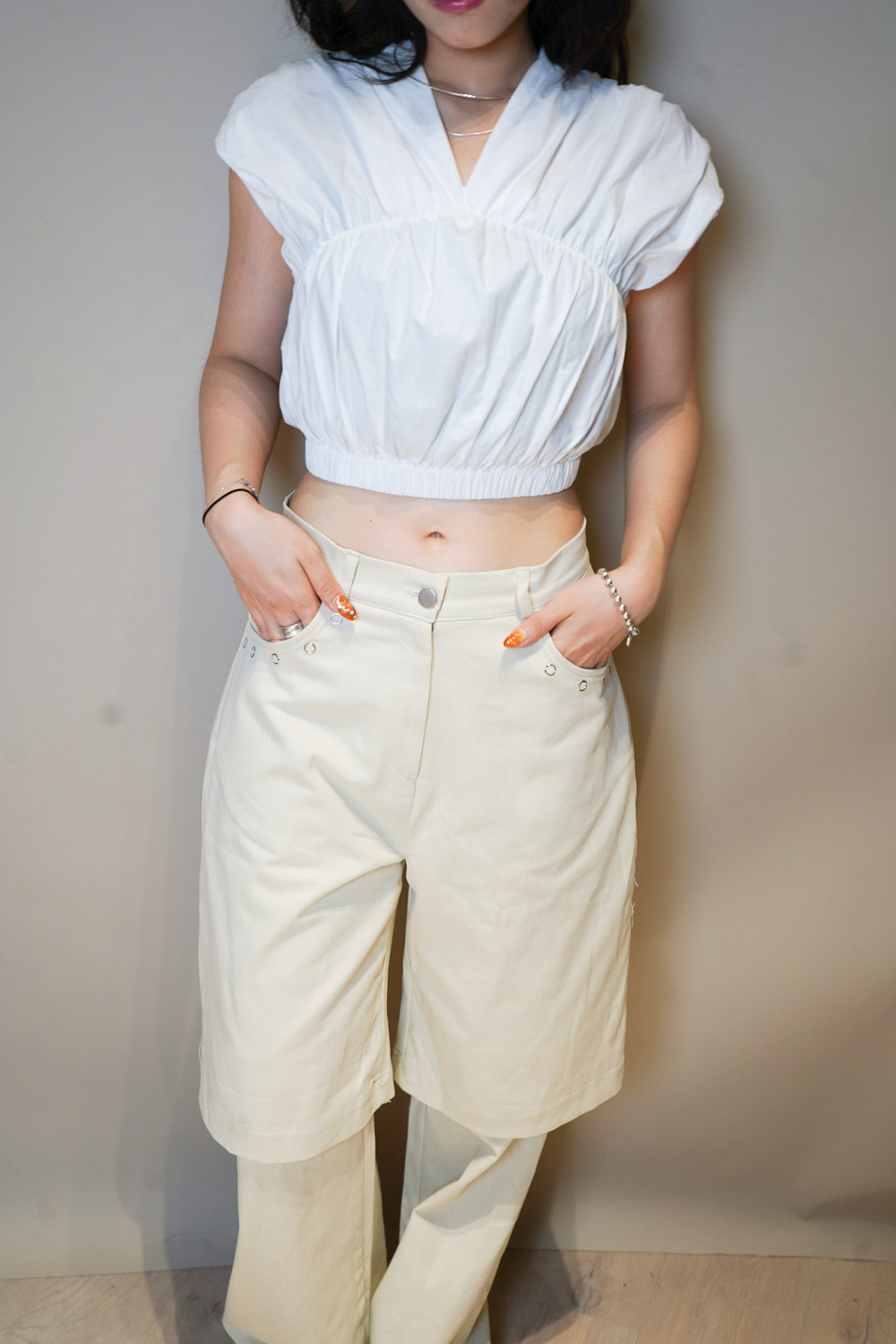 V puff cropped blouse (WHITE/NAVY)