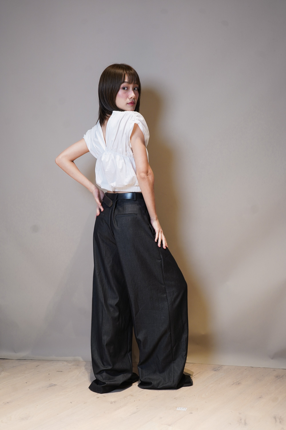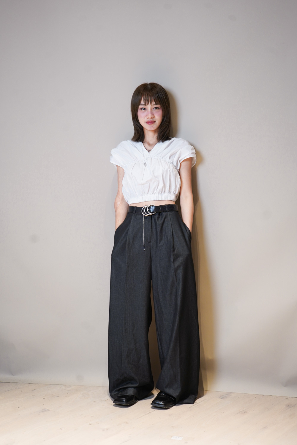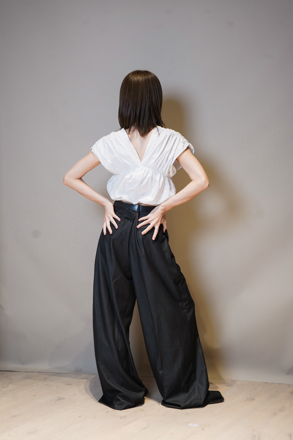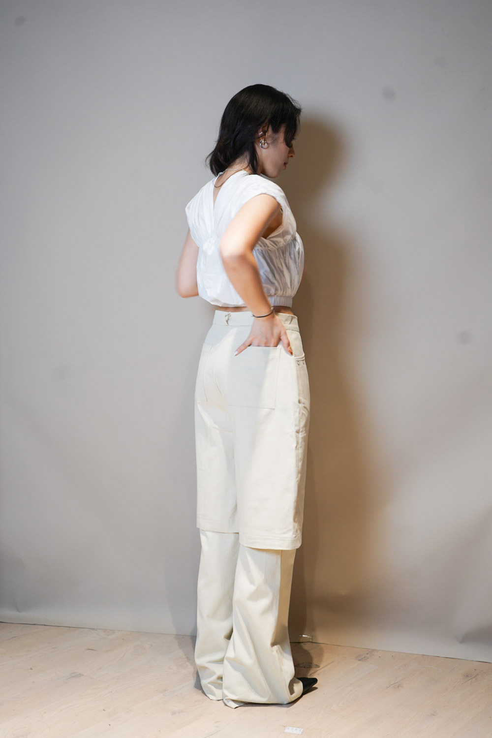 V puff cropped blouse (WHITE/NAVY)